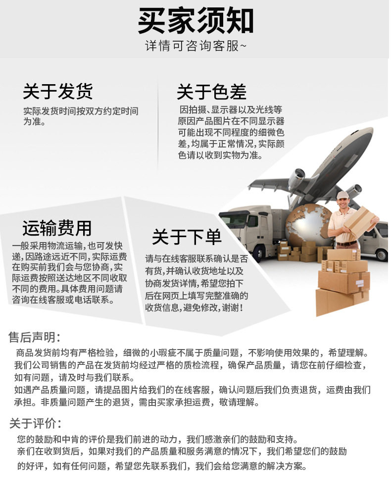 请买家在收到货物时当场验货,确认货物无破损再签收:如果发现有破损之类的情况请拒签并及时联系我们,不然本店无法和物流或快递公司核实,请务必先验货再签收!!!否则后果由买家承担。
