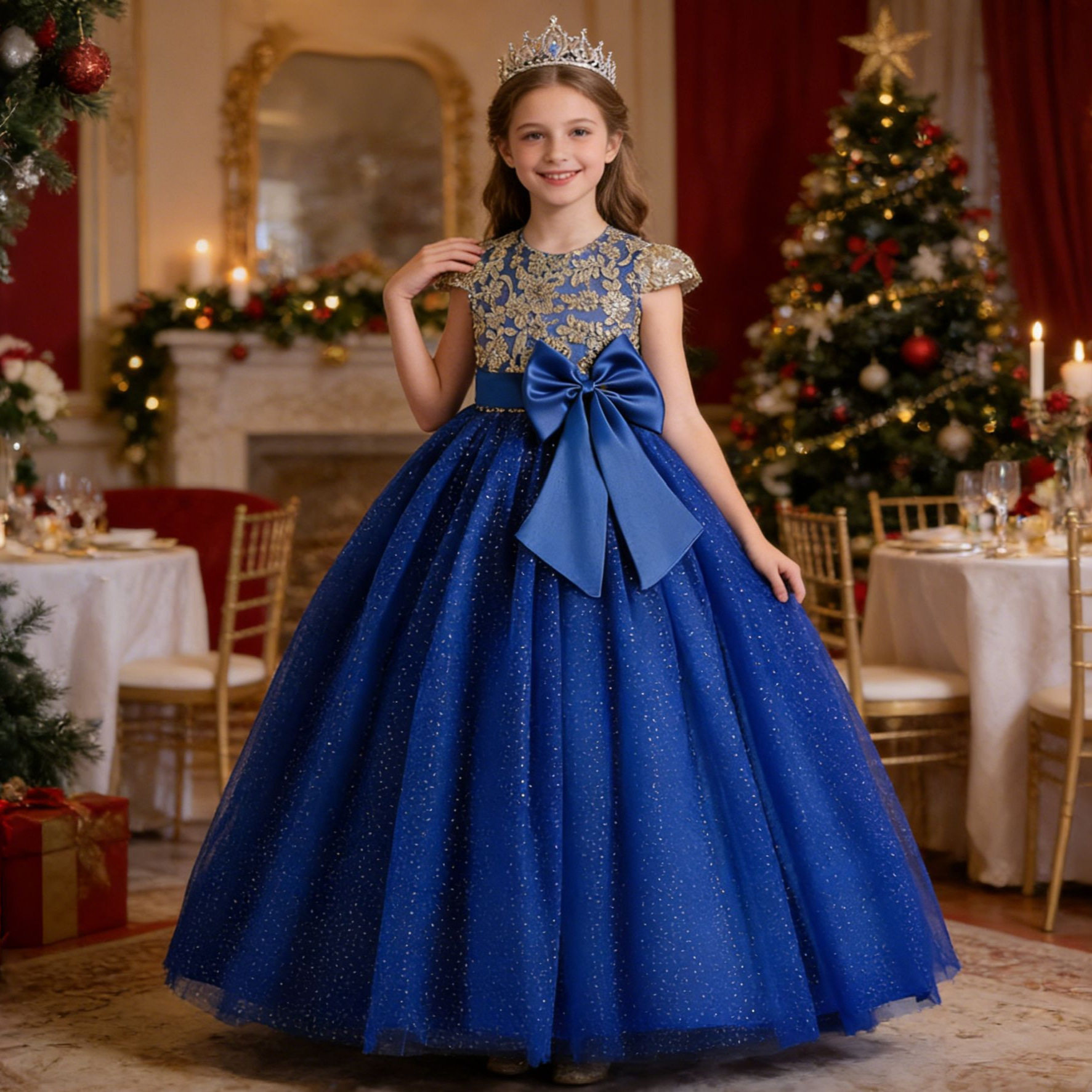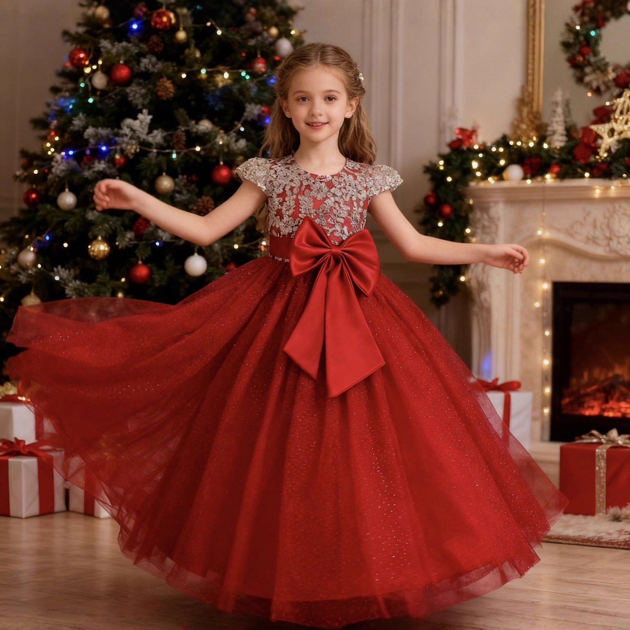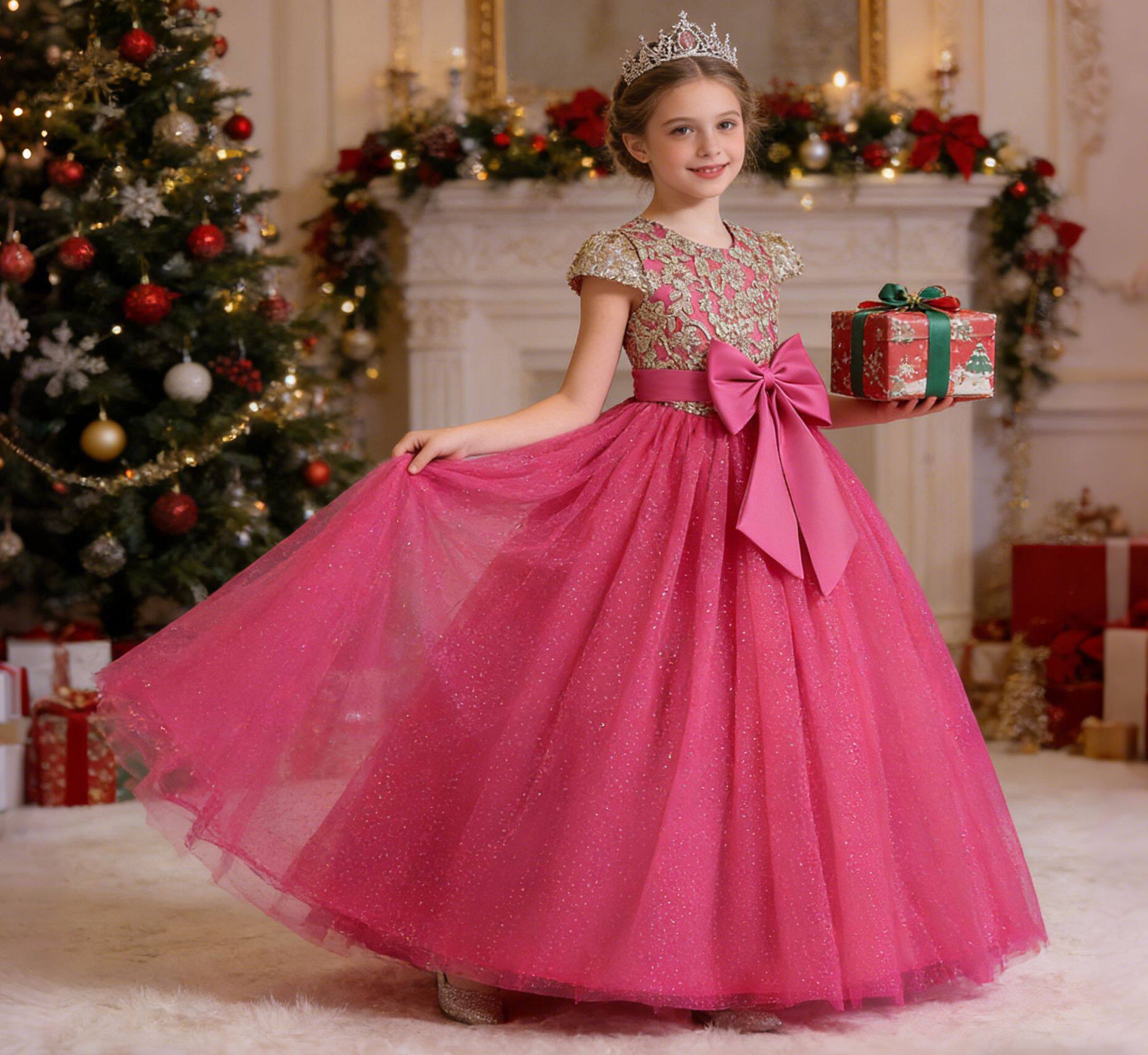 • 2025新款女童礼服裙中大童小飞袖亮片婚纱花童钢琴表演公主裙长款