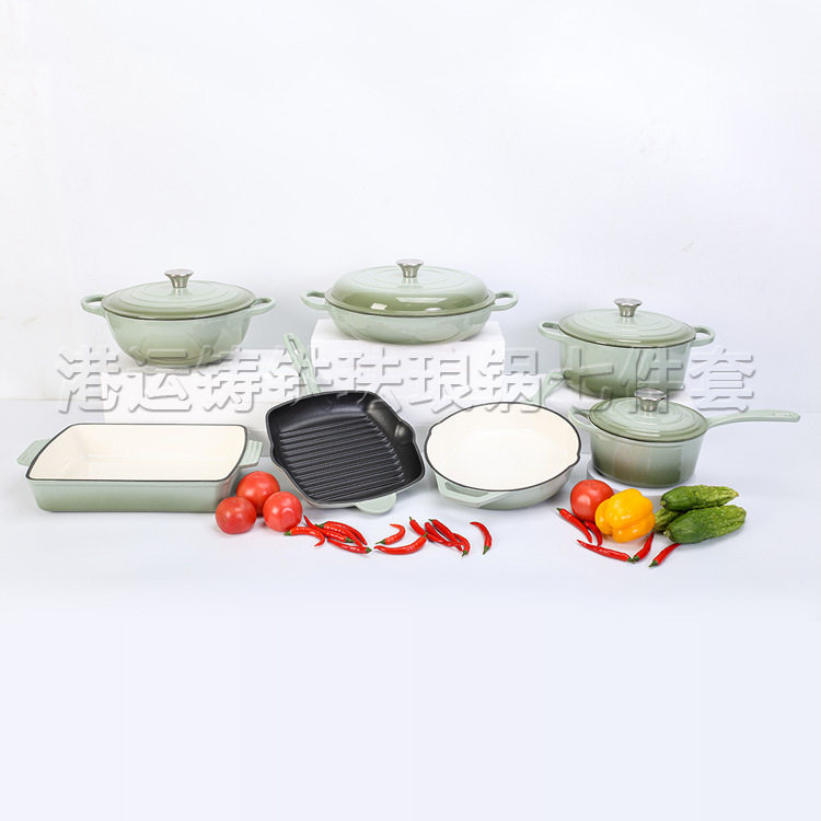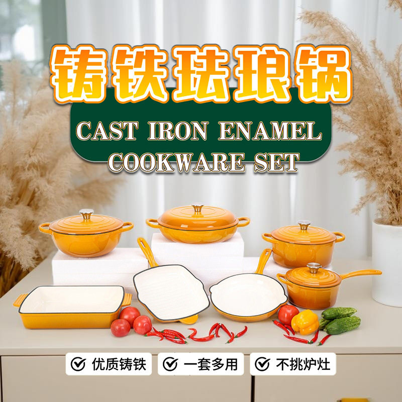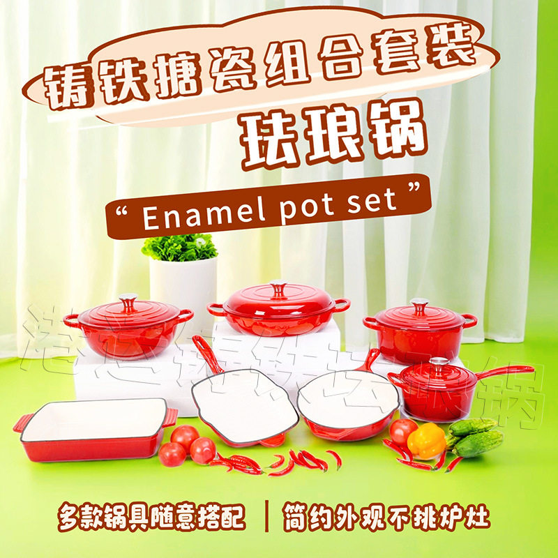 铸铁搪瓷锅珐琅锅家用铸铁锅砂锅炖锅平底不粘锅通用锅具七件套