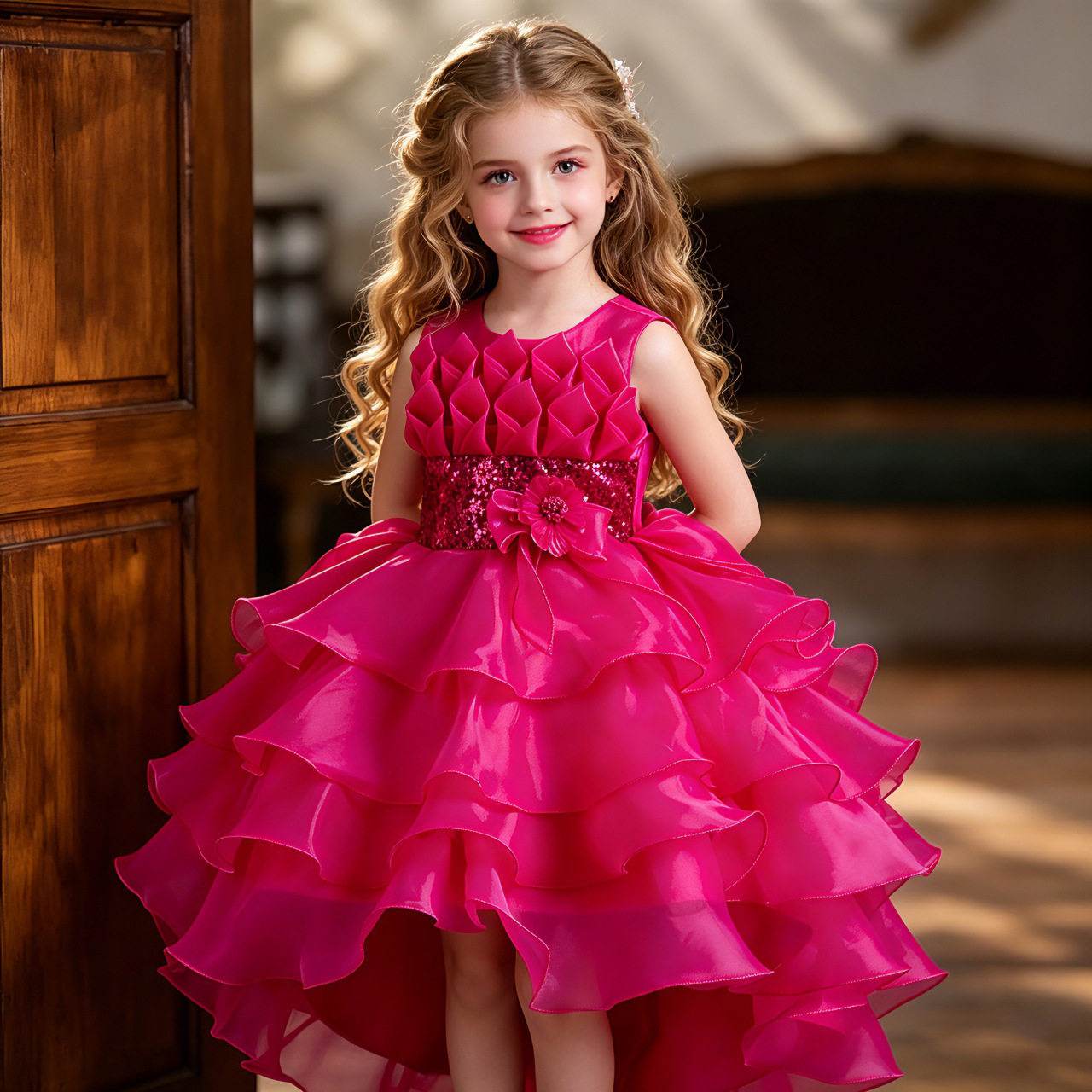 • 跨境新款女童礼服花童拖尾裙欧根纱蛋糕公主童裙婚纱蓬蓬裙批发
