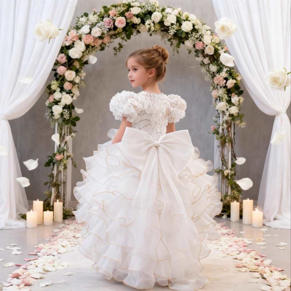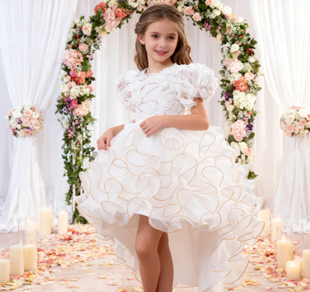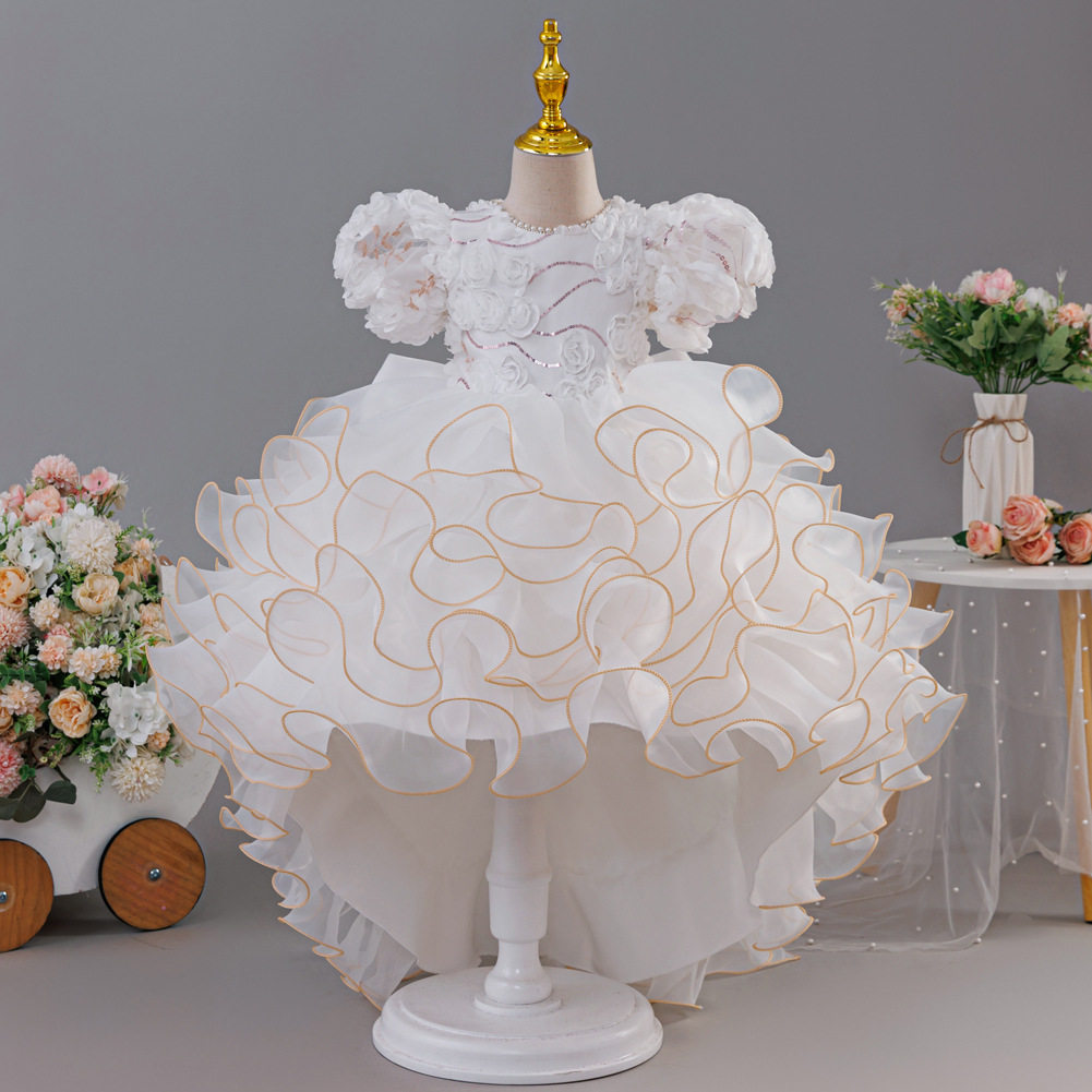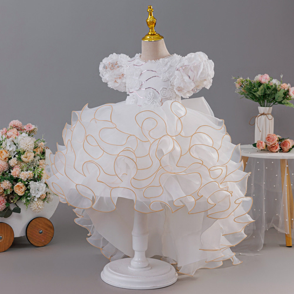 跨境新款女童礼服花童拖尾裙欧根纱蛋糕公主童裙婚纱蓬蓬裙批发