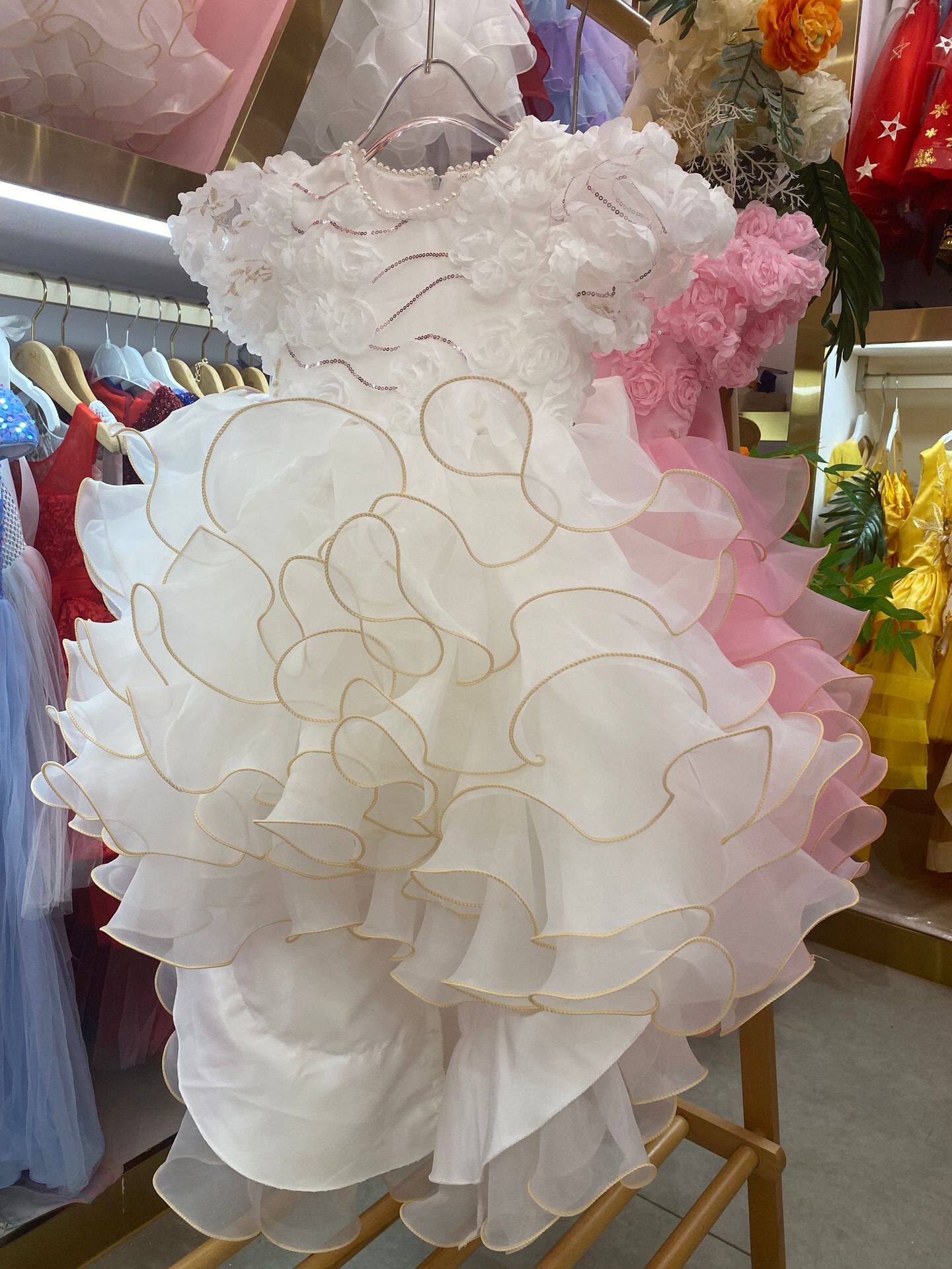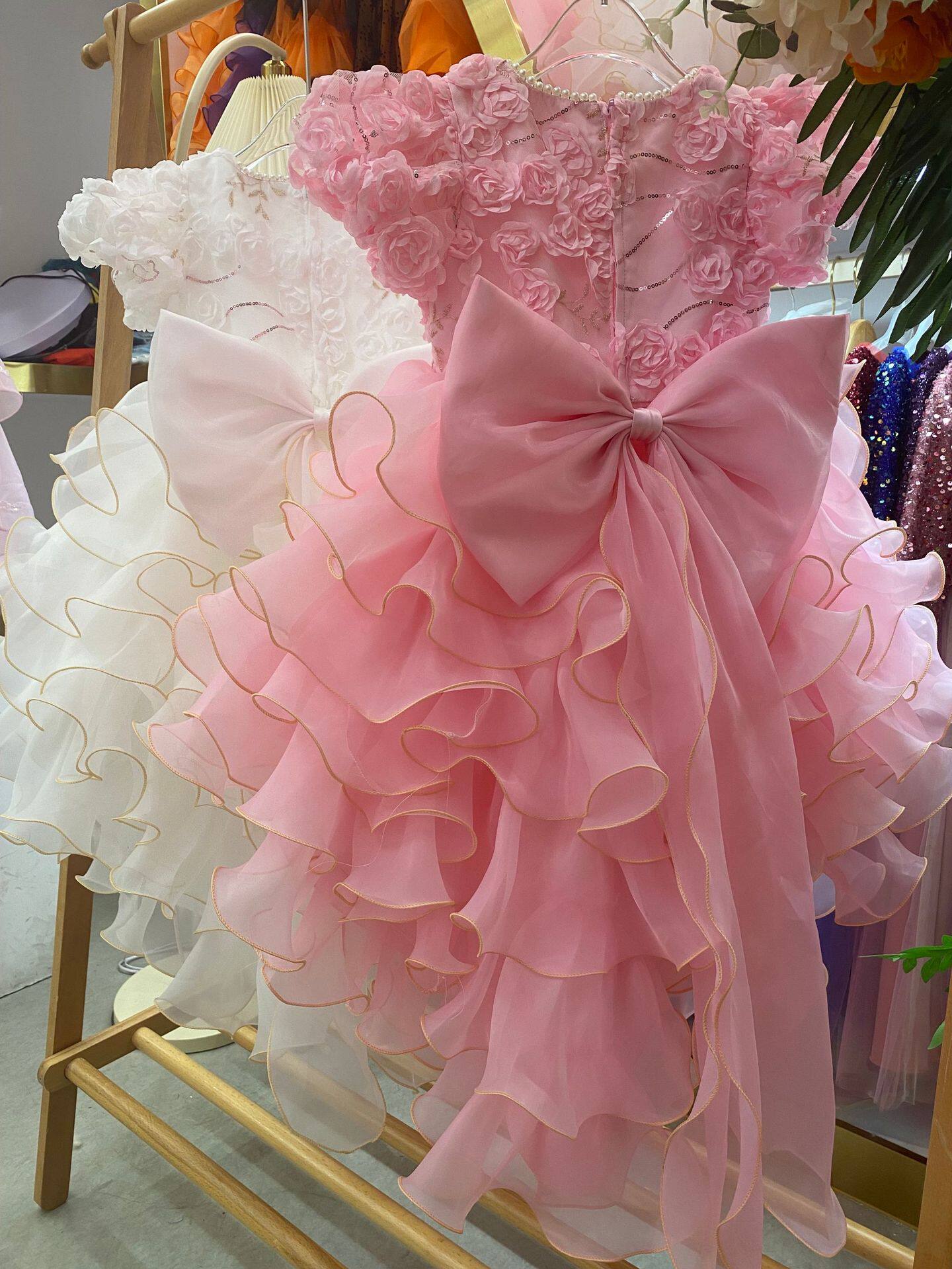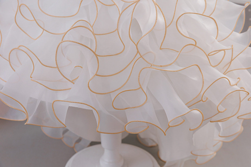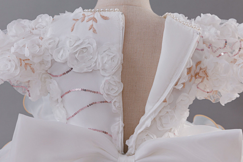 跨境新款女童礼服花童拖尾裙欧根纱蛋糕公主童裙婚纱蓬蓬裙批发