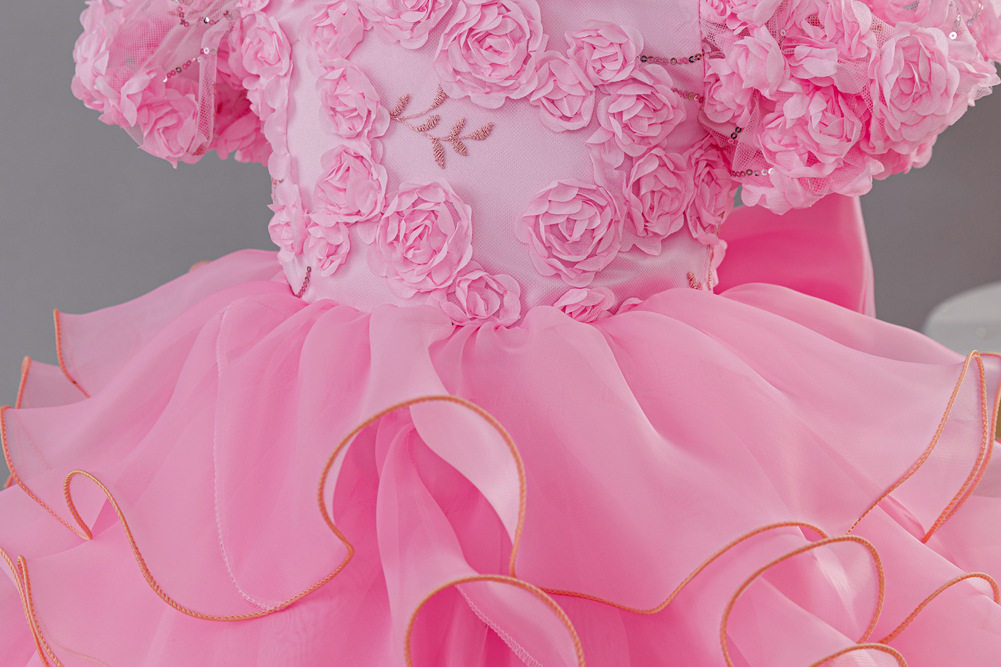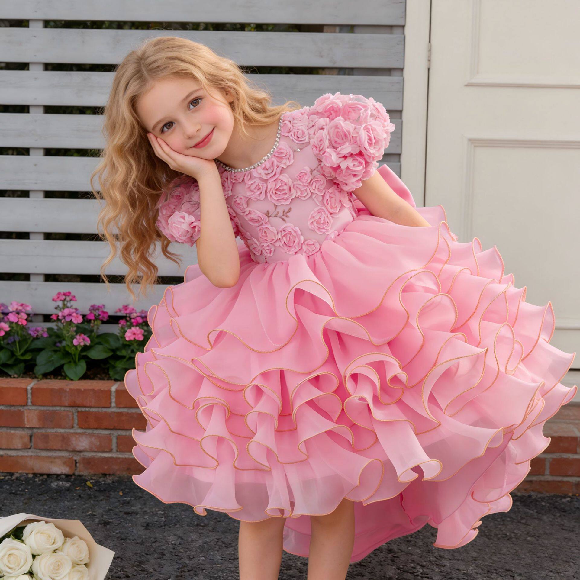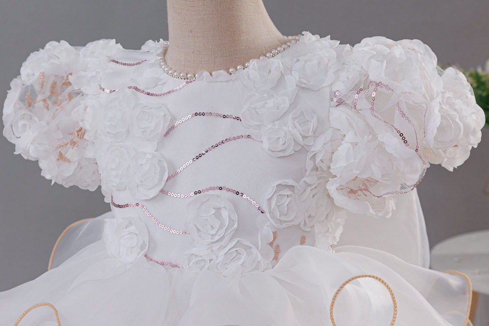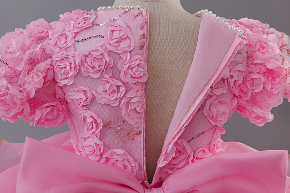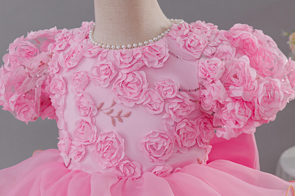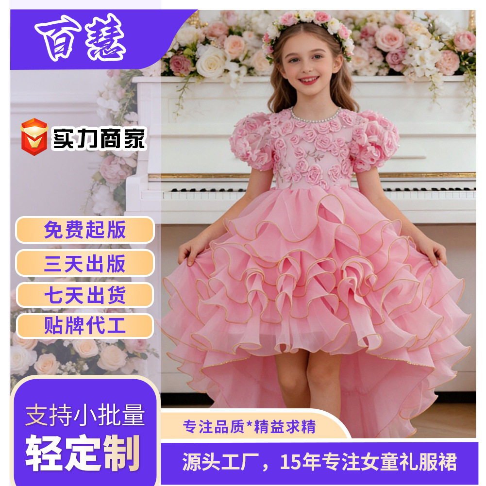 亚马逊新品儿童公主裙玫瑰花朵女童婚纱拖尾礼服六一儿童演出服