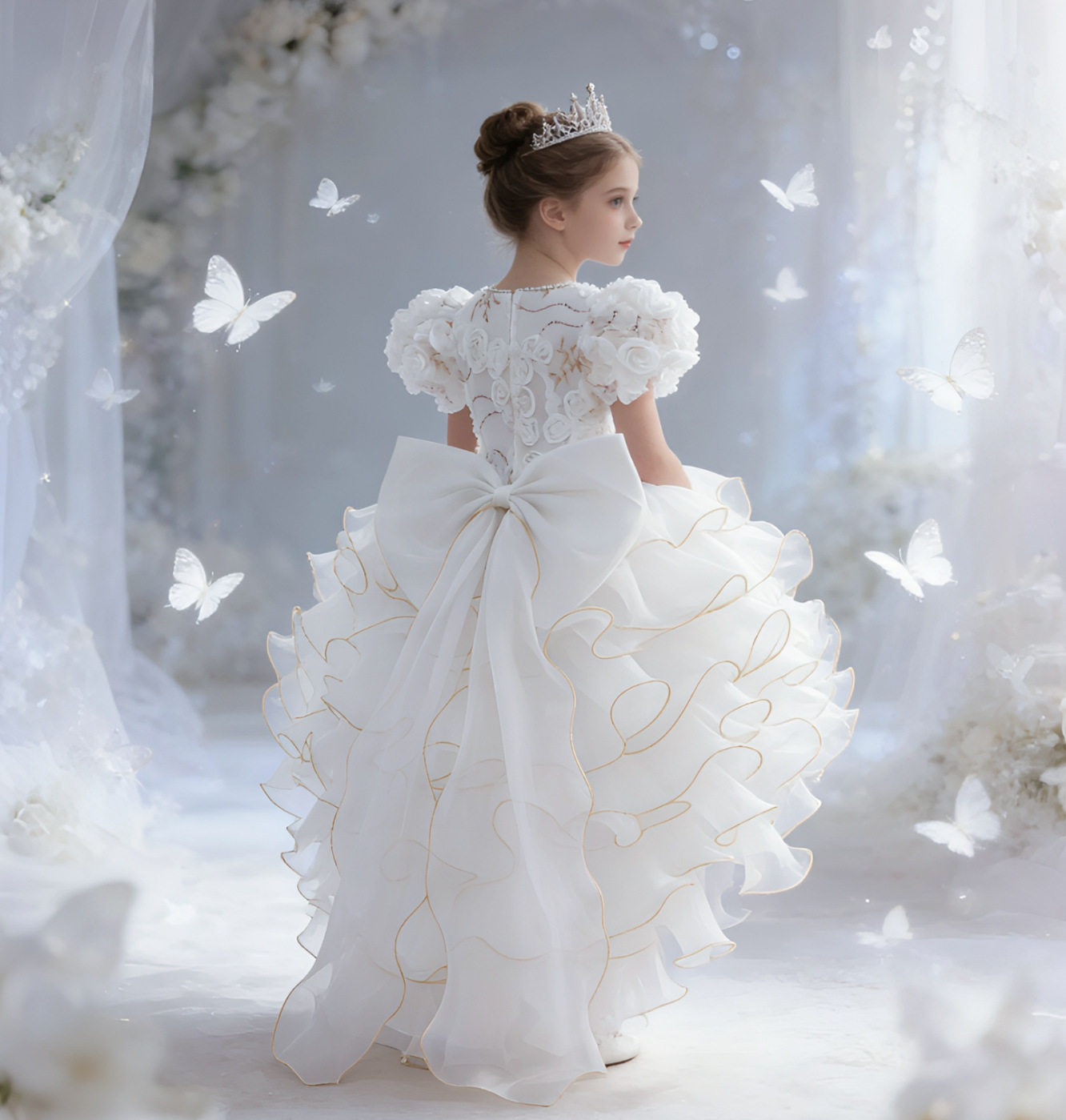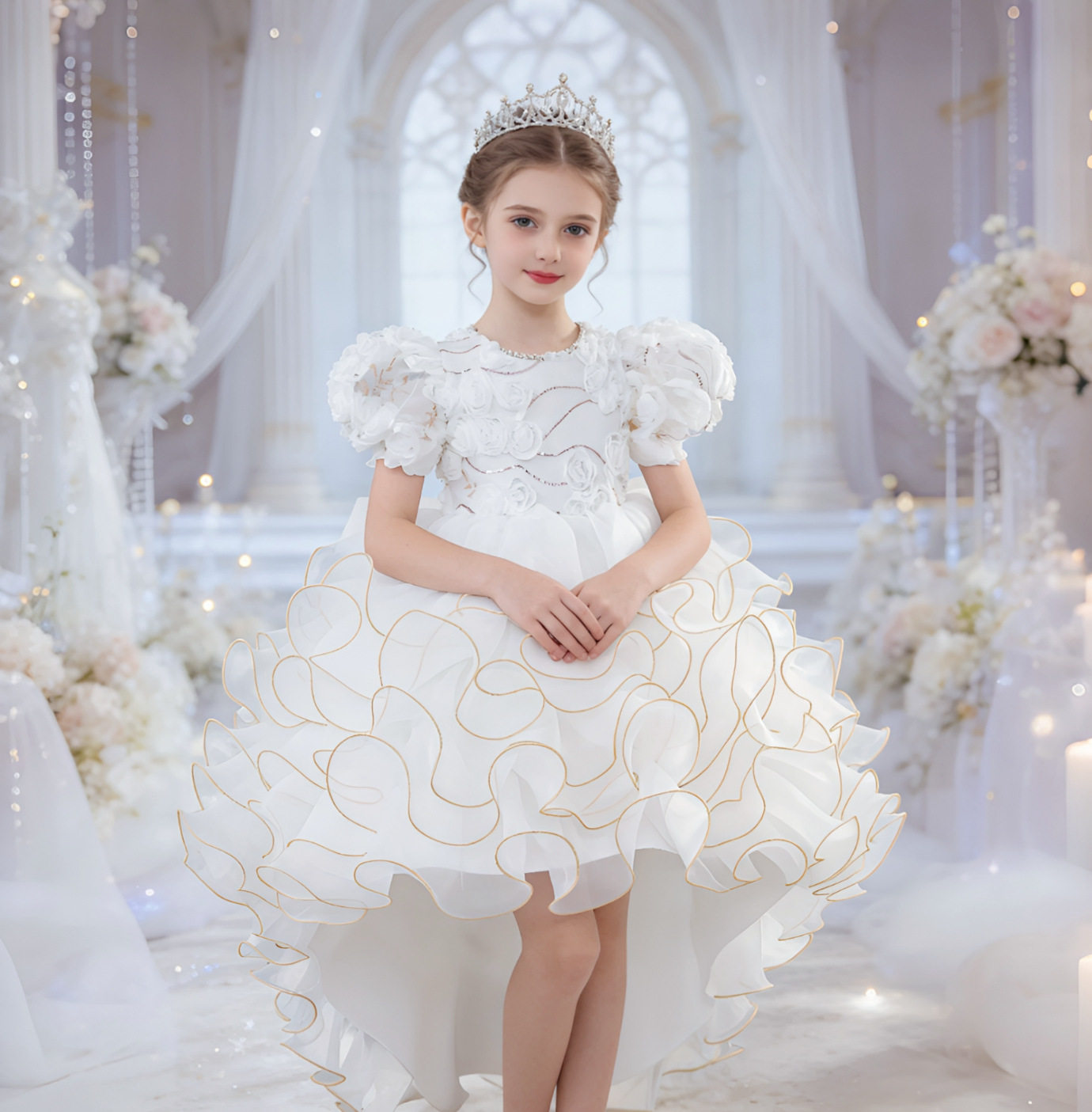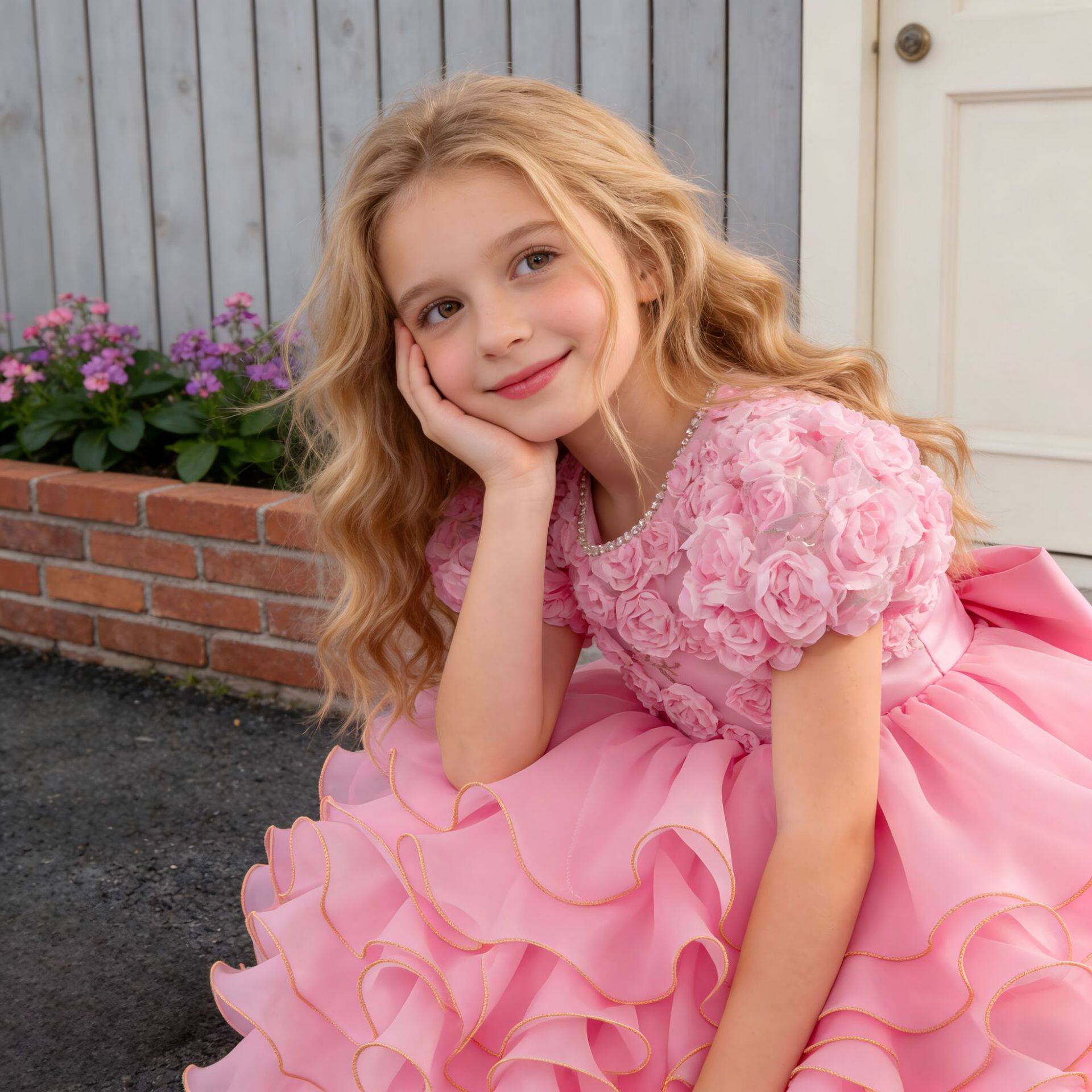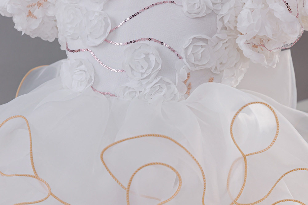亚马逊新品儿童公主裙玫瑰花朵女童婚纱拖尾礼服六一儿童演出服