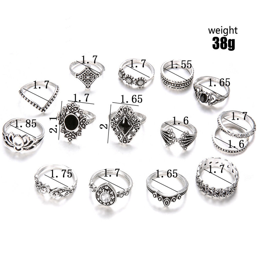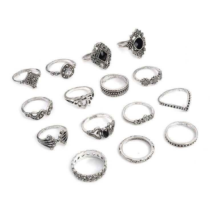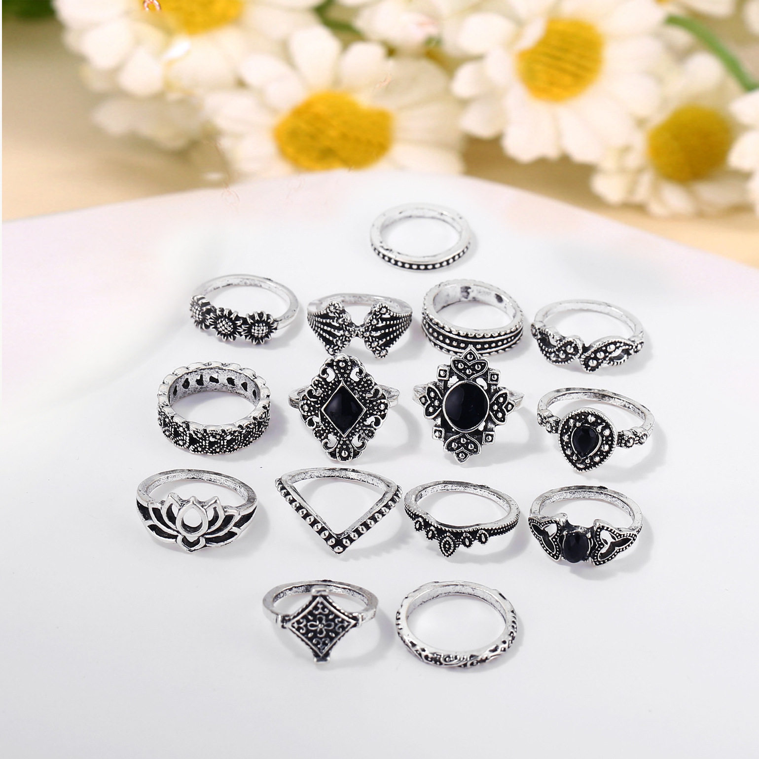 ancient silver hollow lotus knuckle ring set with diamonds, retro finger rings, 15-piece set