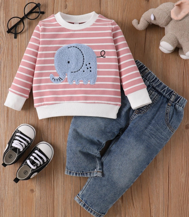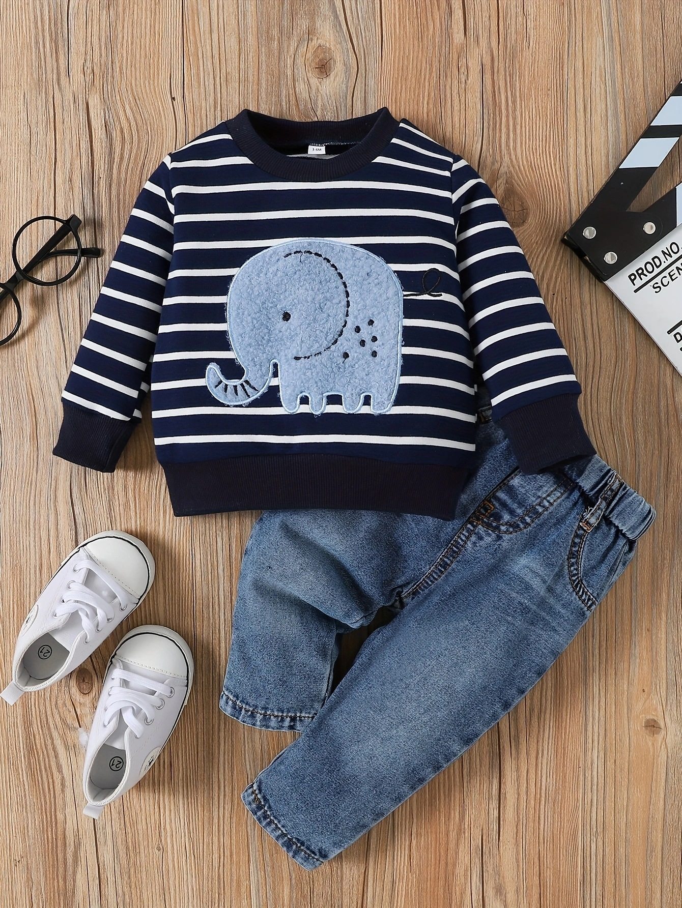 baby boy spring and autumn style elephant striped long-sleeved top denim trousers fashionable suit