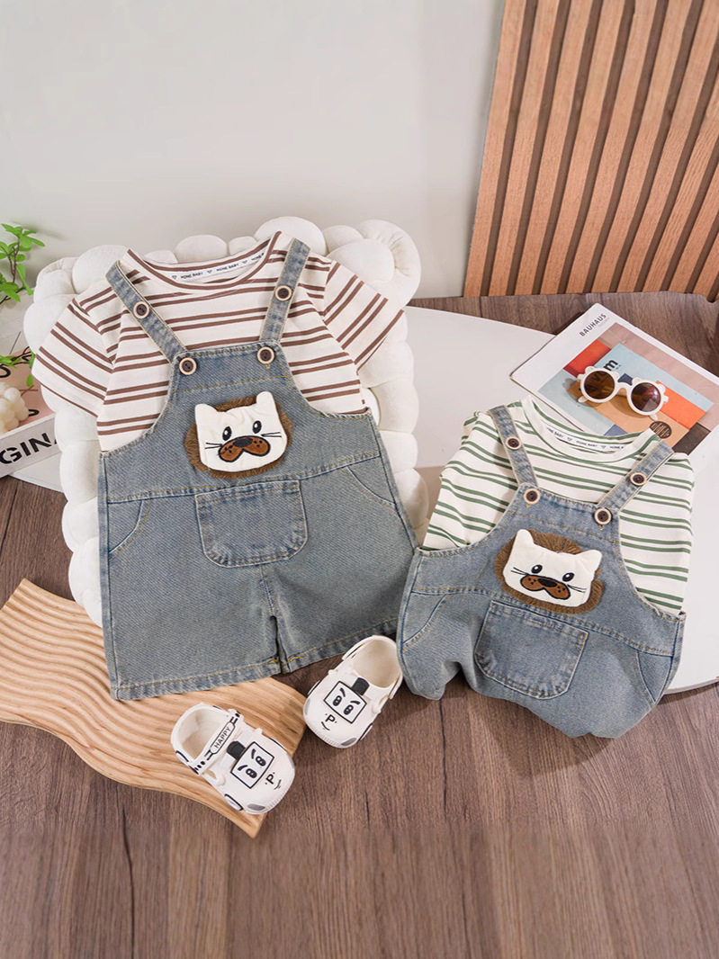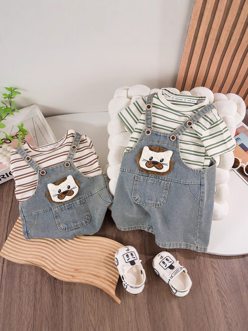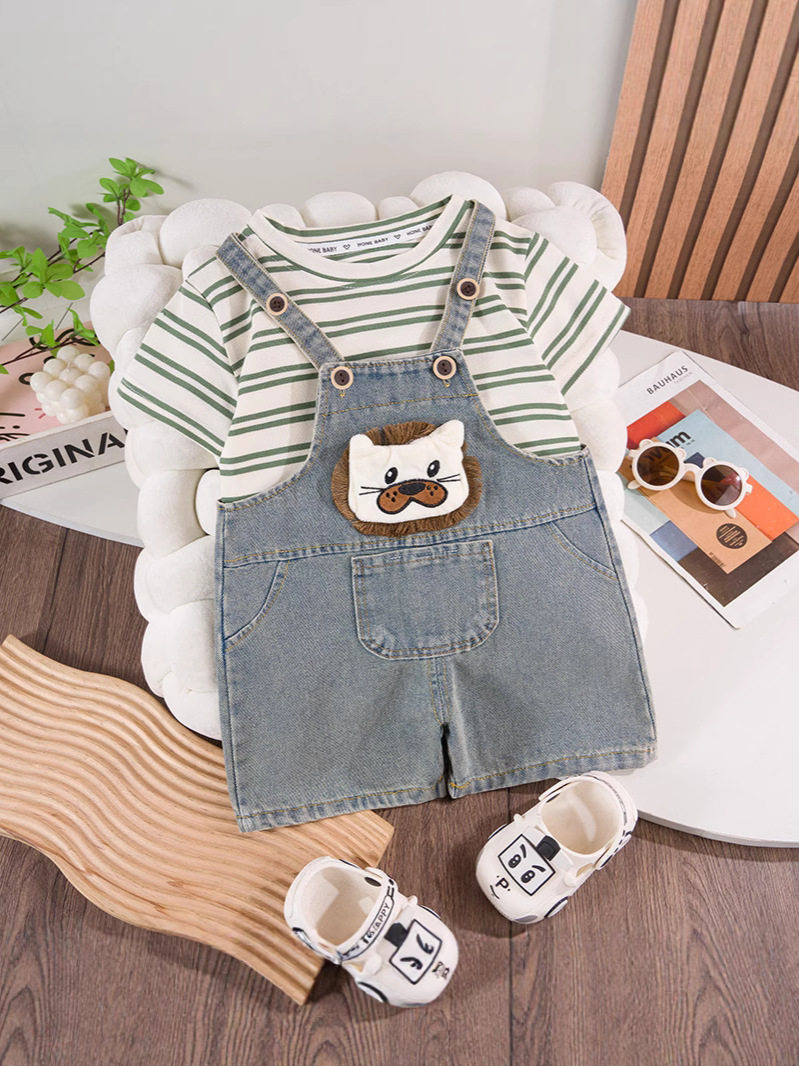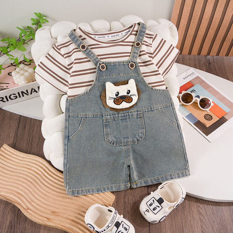 Boys and girls baby cartoon cute denim overalls children's suit children's summer clothing striped short T-shirt children's clothing