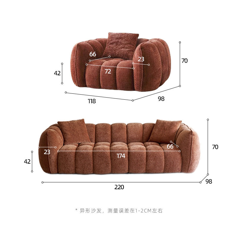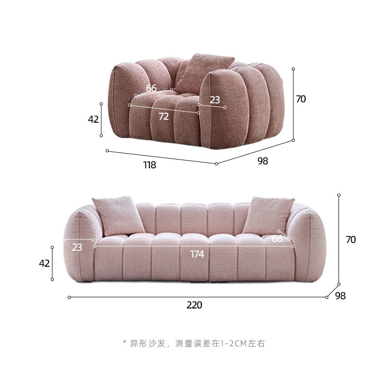颜色姜黄色,米白色,焦糖色,绿色,粉色尺寸单人位118*98*70cm箱规110*35*35 重量24kg,多人位220*98*70cm 箱规110*45*45 重量48kg