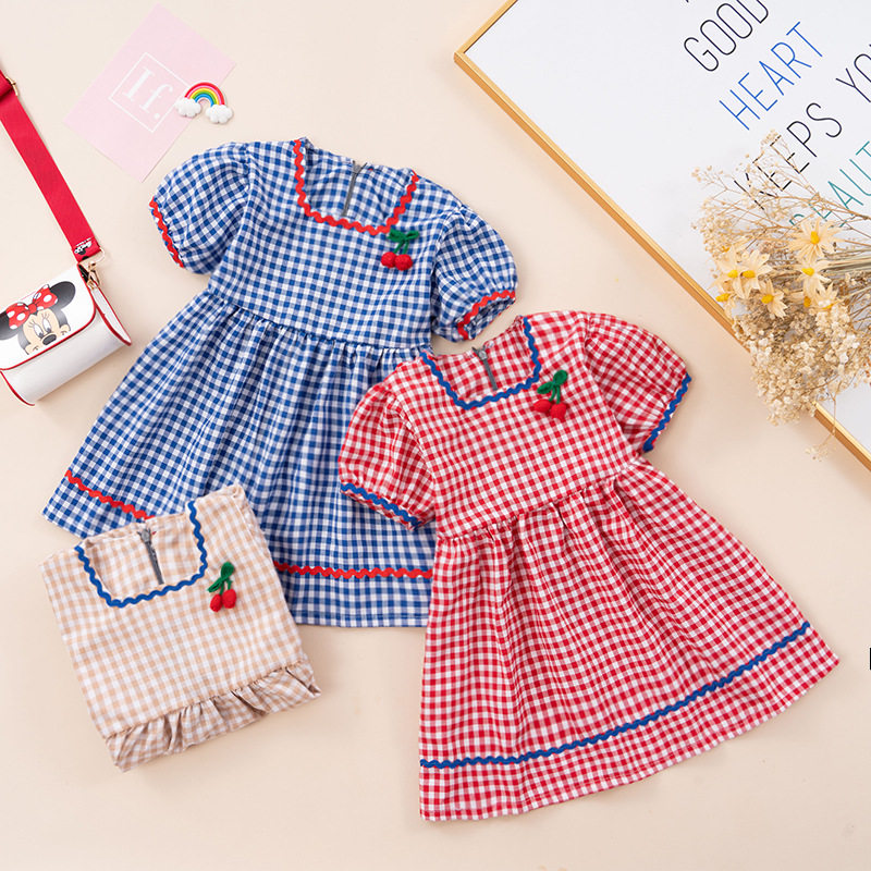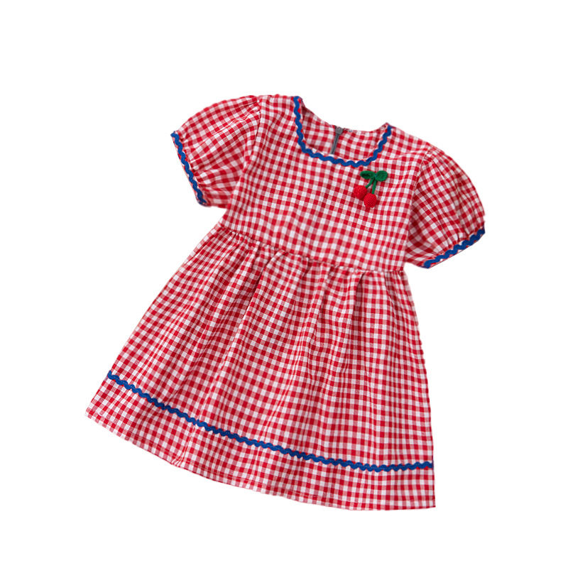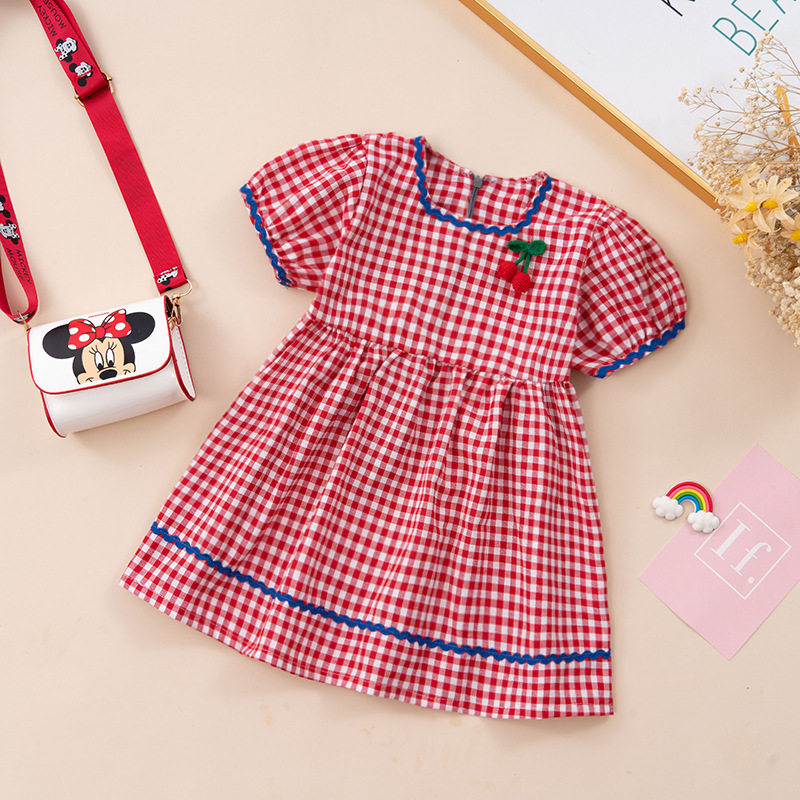 Girls' dress summer new style children's mid-length princess dress baby fresh and cute short-sleeved summer plaid skirt