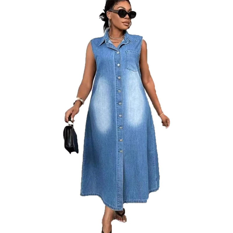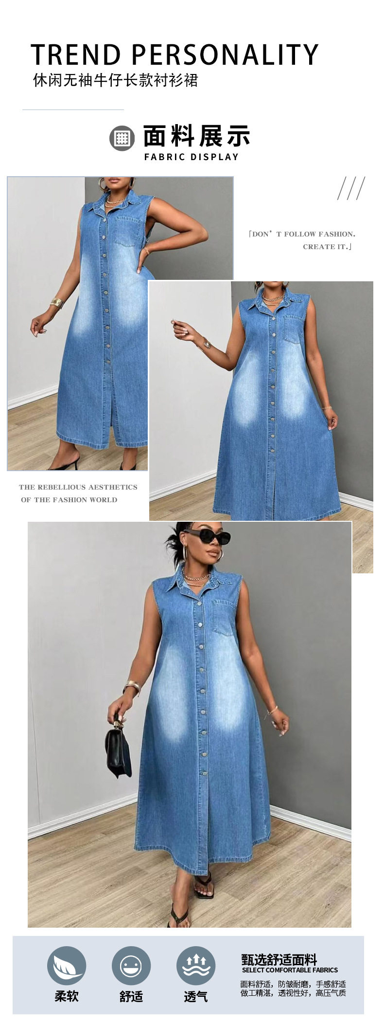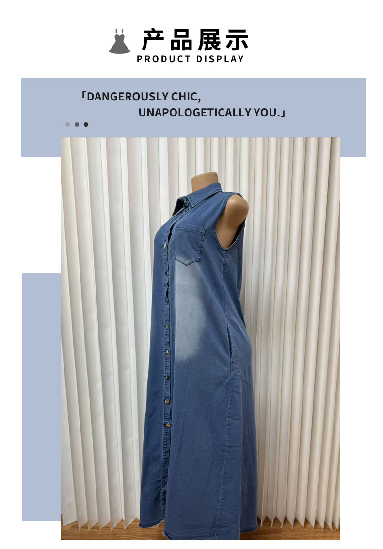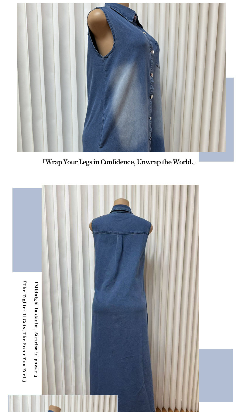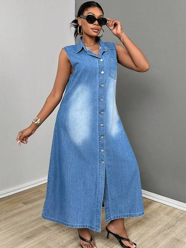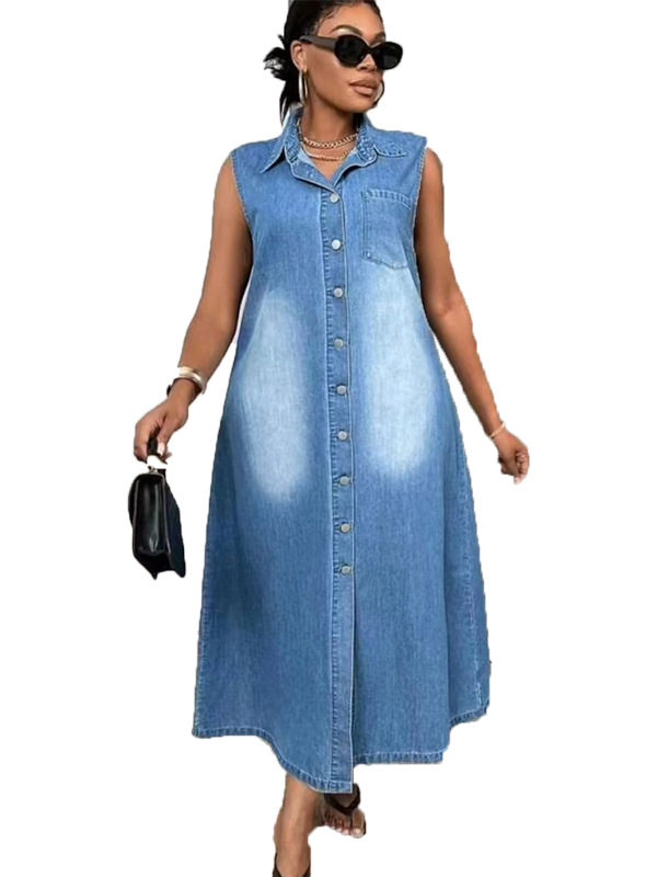 Sleeveless single-breasted denim dress summer new casual lapel long skirt French retro temperament denim long skirt