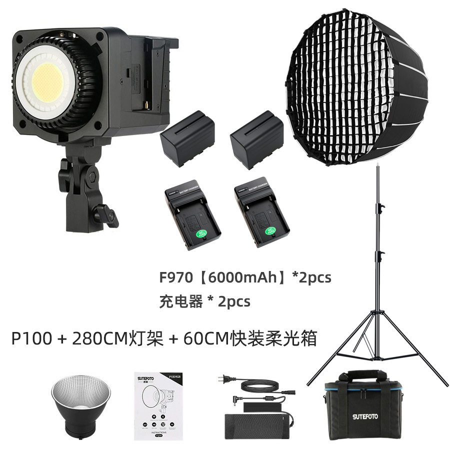 Packing listLight package fill light power supplyLight source colorP100bi [official standard configuration],P100bi+280cm light stand,P100bi+60cm deep mouth soft box+280cm light stand,P100bi [official standard] + f970 battery,P100bi+280cm light stand+f970 battery,P100bi+60cm deep mouth soft box+280cm light stand+f970 battery