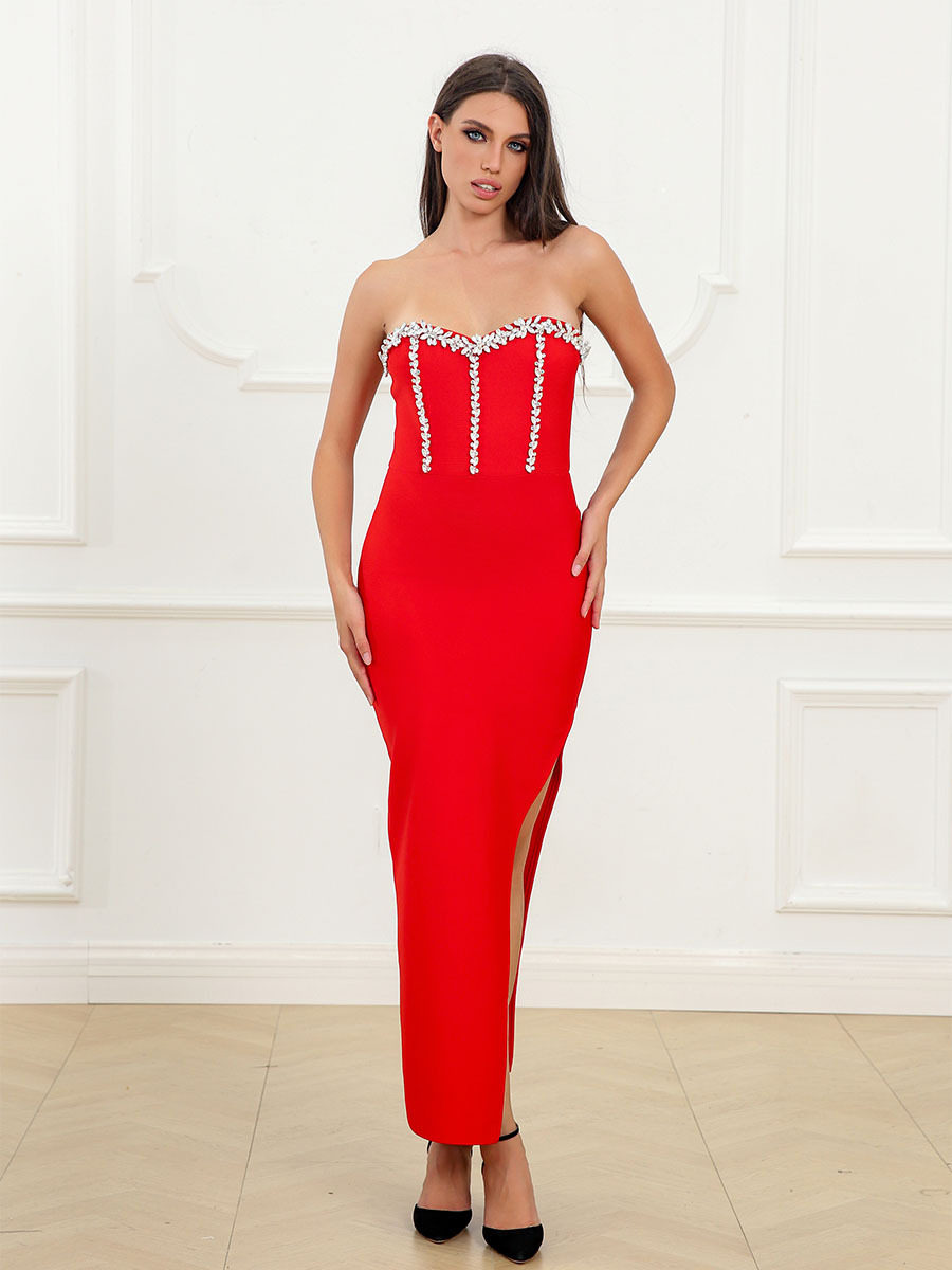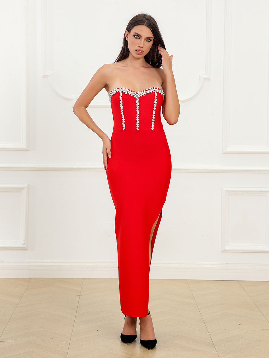 tube top with diamond design, high-waisted mid-length skirt, tight-fitting hip-hugging short-sleeved bandage dress, metal decoration