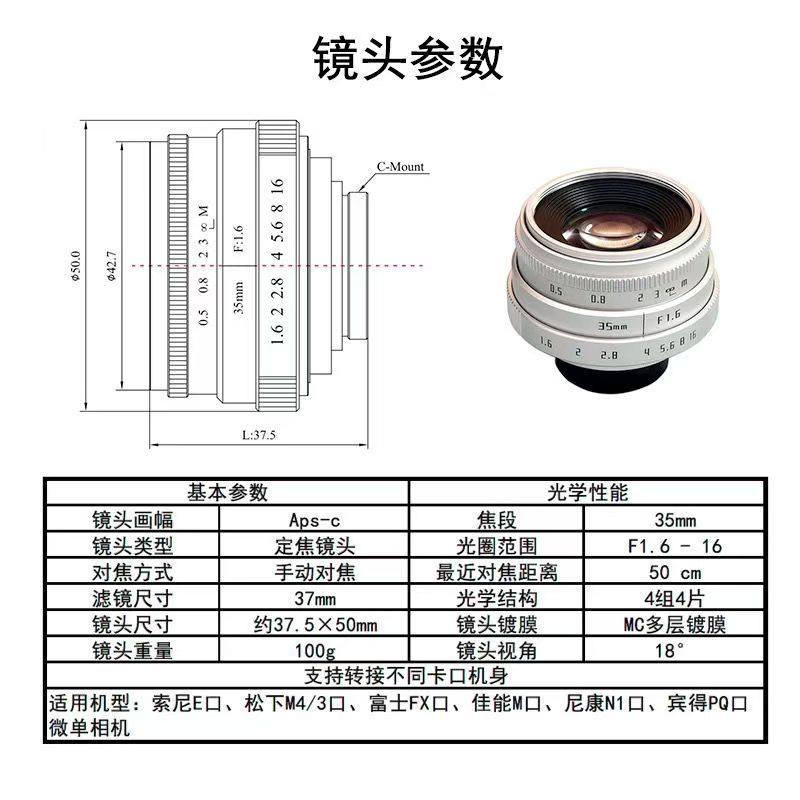 35mm f1.6 C-mount large aperture manual fixed focus mini mirrorless lens suitable for Panasonic, Fuji, Sony and Canon