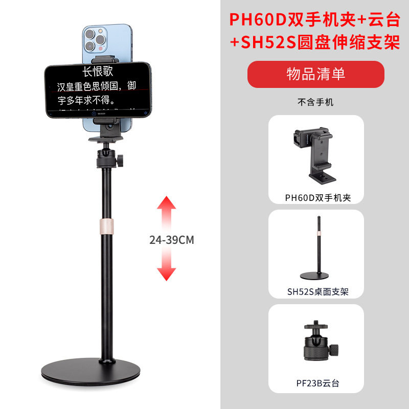 [ph60d horizontal and vertical dual mobile phone holder] + [pf23b spherical head + sh52s desktop disc stand] [recommended for desktop selfie live broadcast]