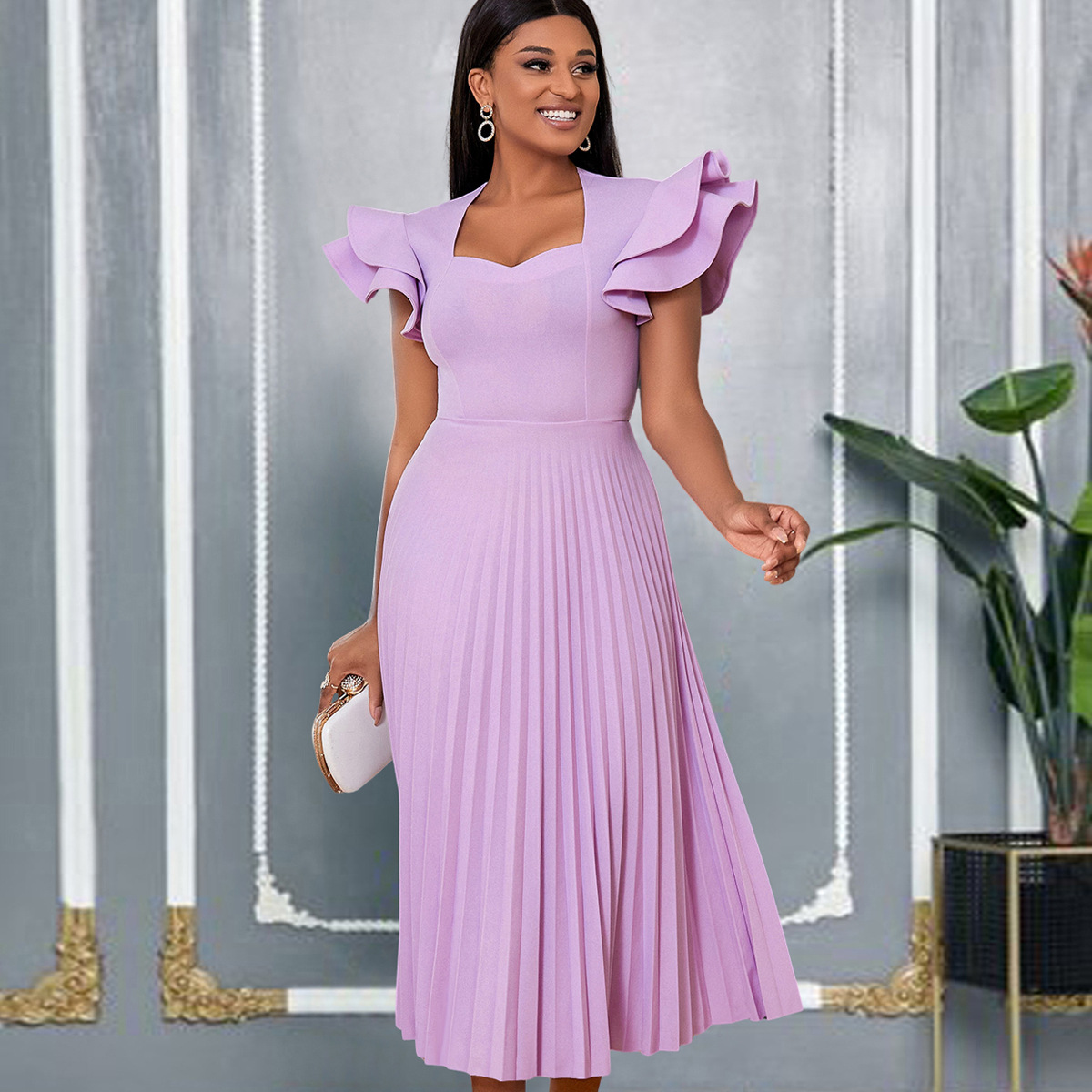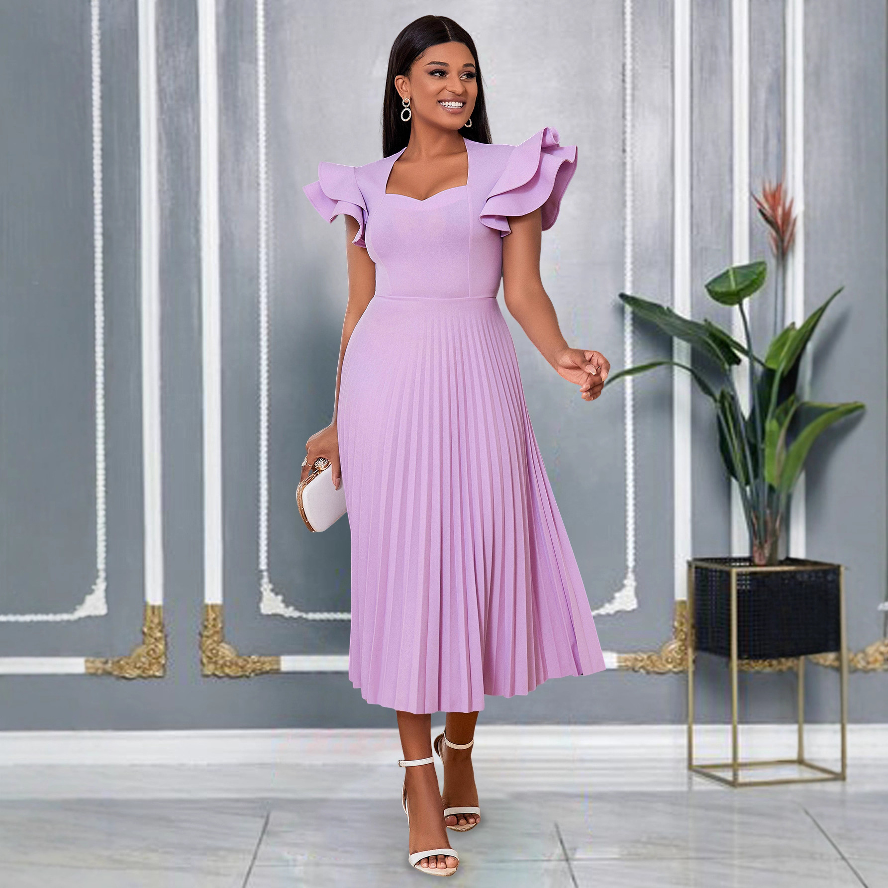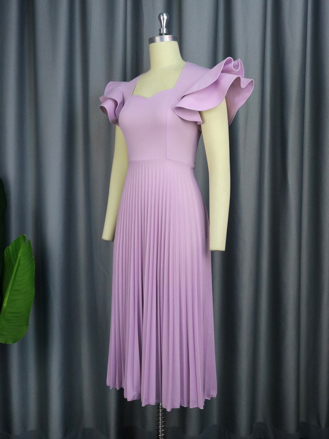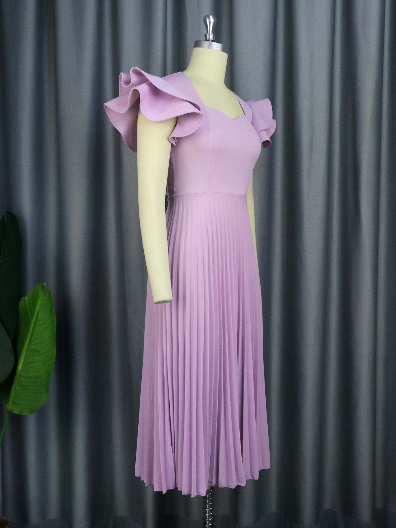 AM030117 Spring and Autumn Purple Square Neck Dress Elegant Temperament Casual Commuting Pleated Skirt Dresses