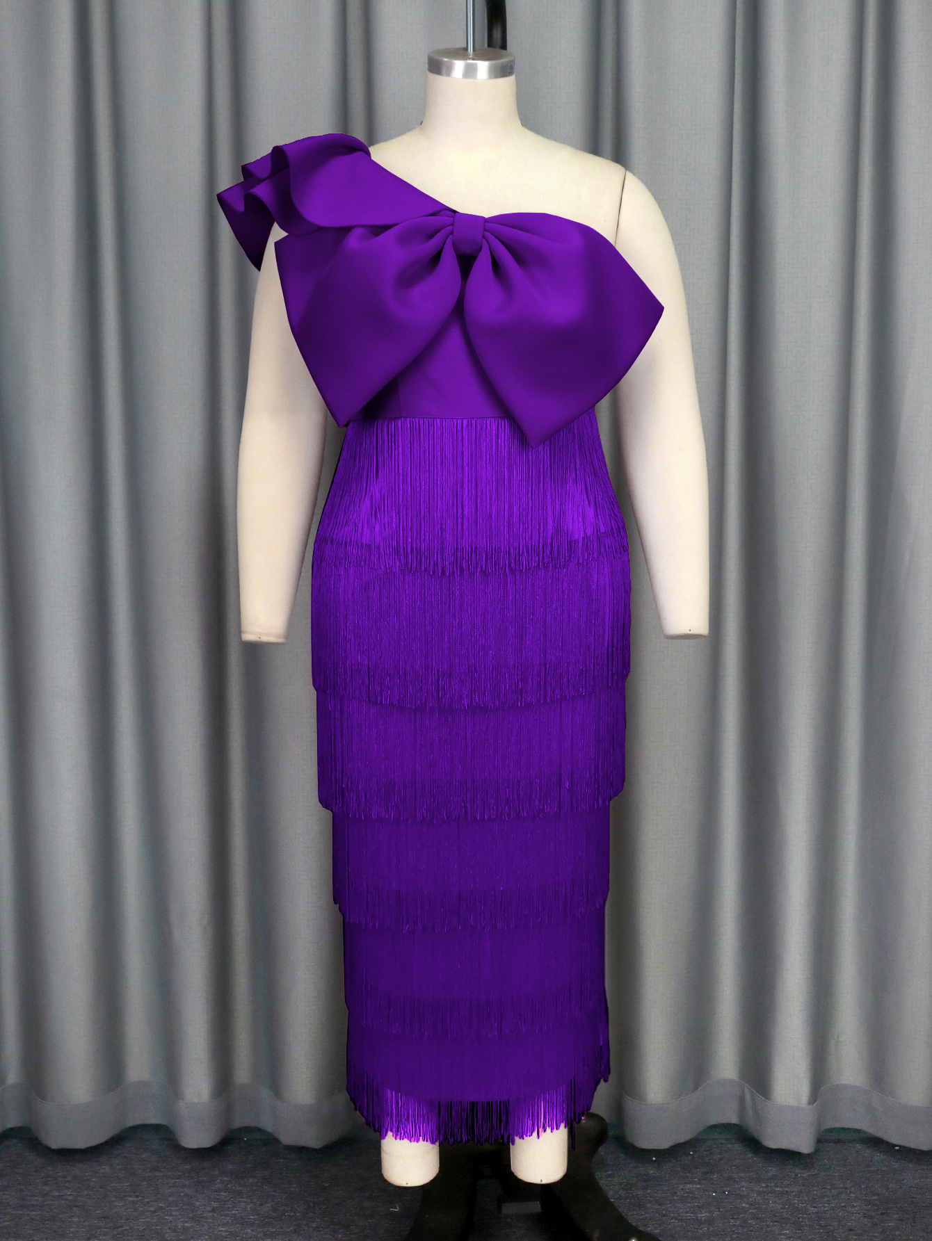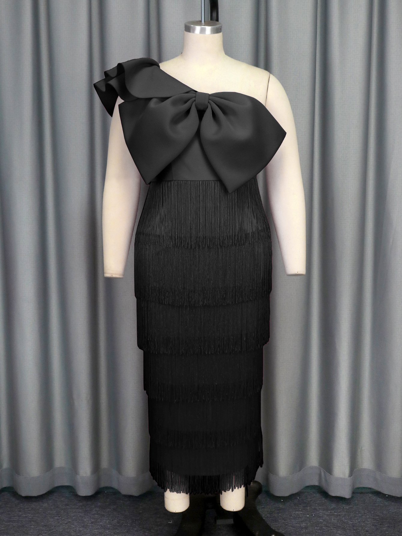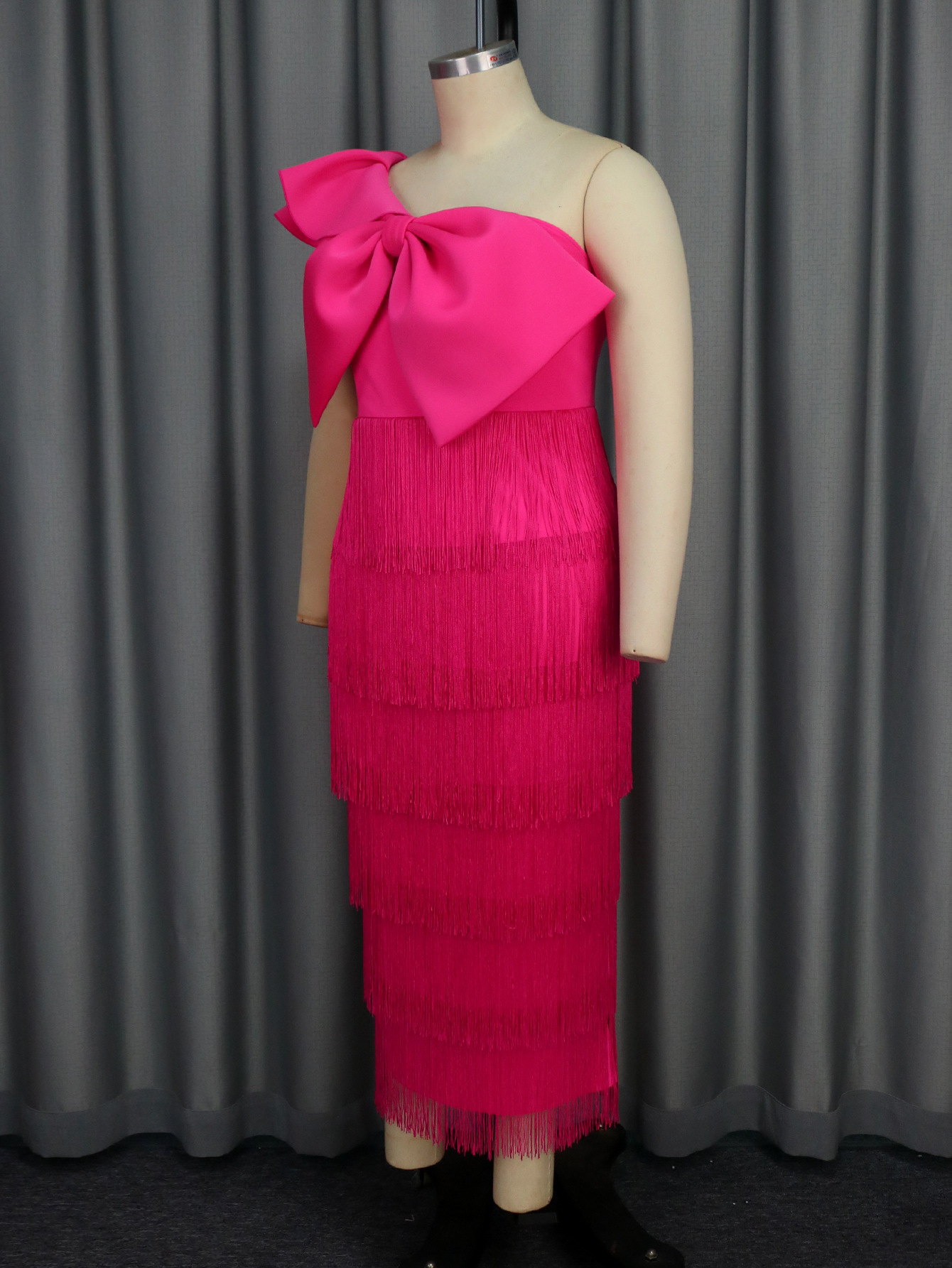 (FREE AIR SHIPPING) AM041017 Elegant solid color hip-hugging tassel dress party banquet inclined collar big bow dress dress