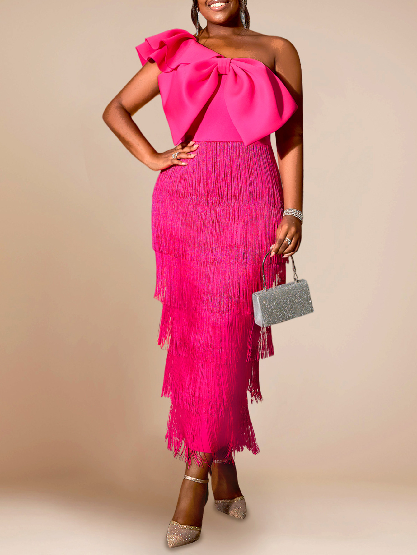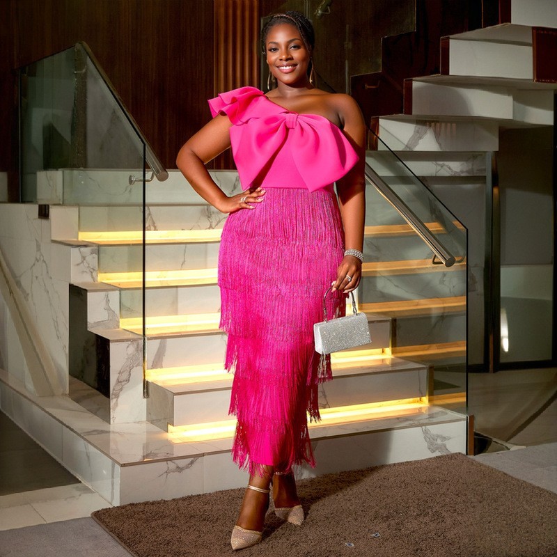 AM041017 Elegant solid color hip-hugging tassel dress party banquet inclined collar big bow dress dress
