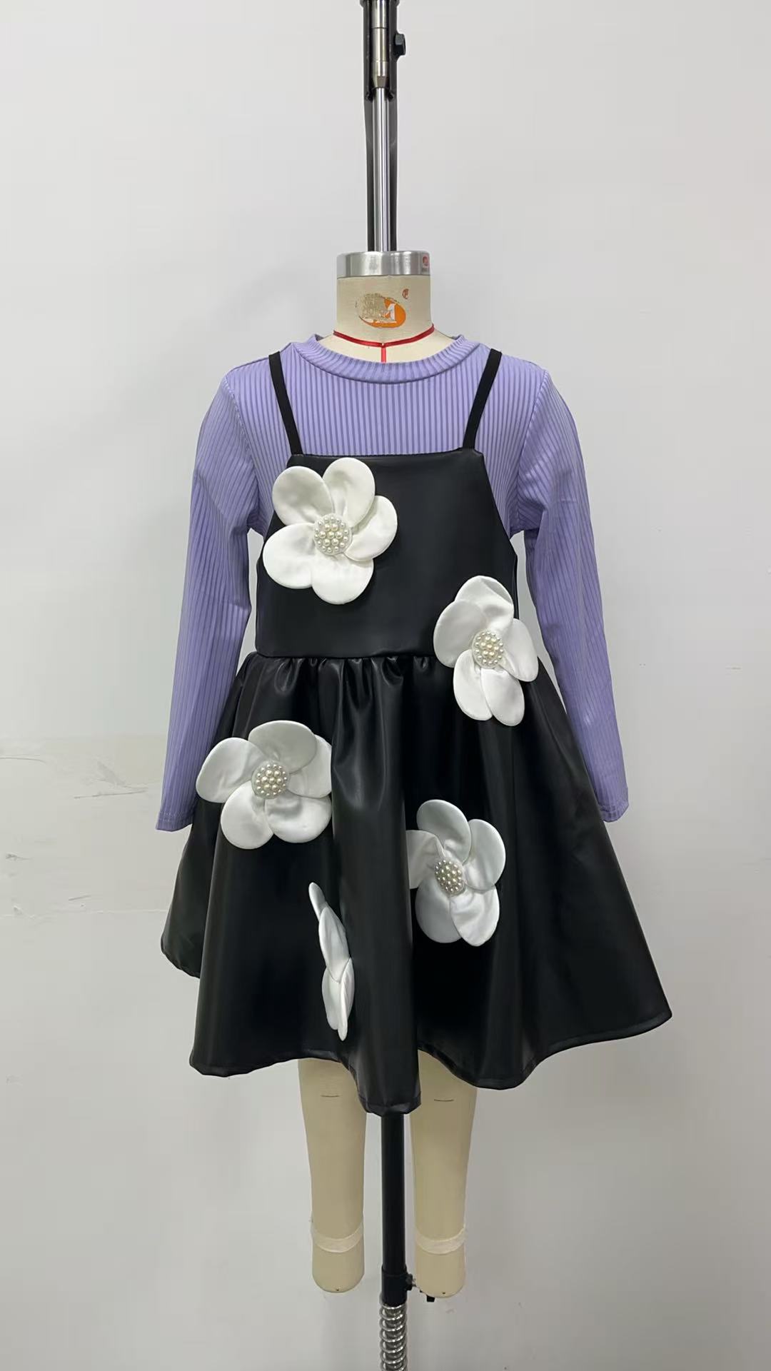 (FREE AIR SHIPPING) autumn and winter girls new bottoming shirt three-dimensional flower leather skirt dress suit European and American children