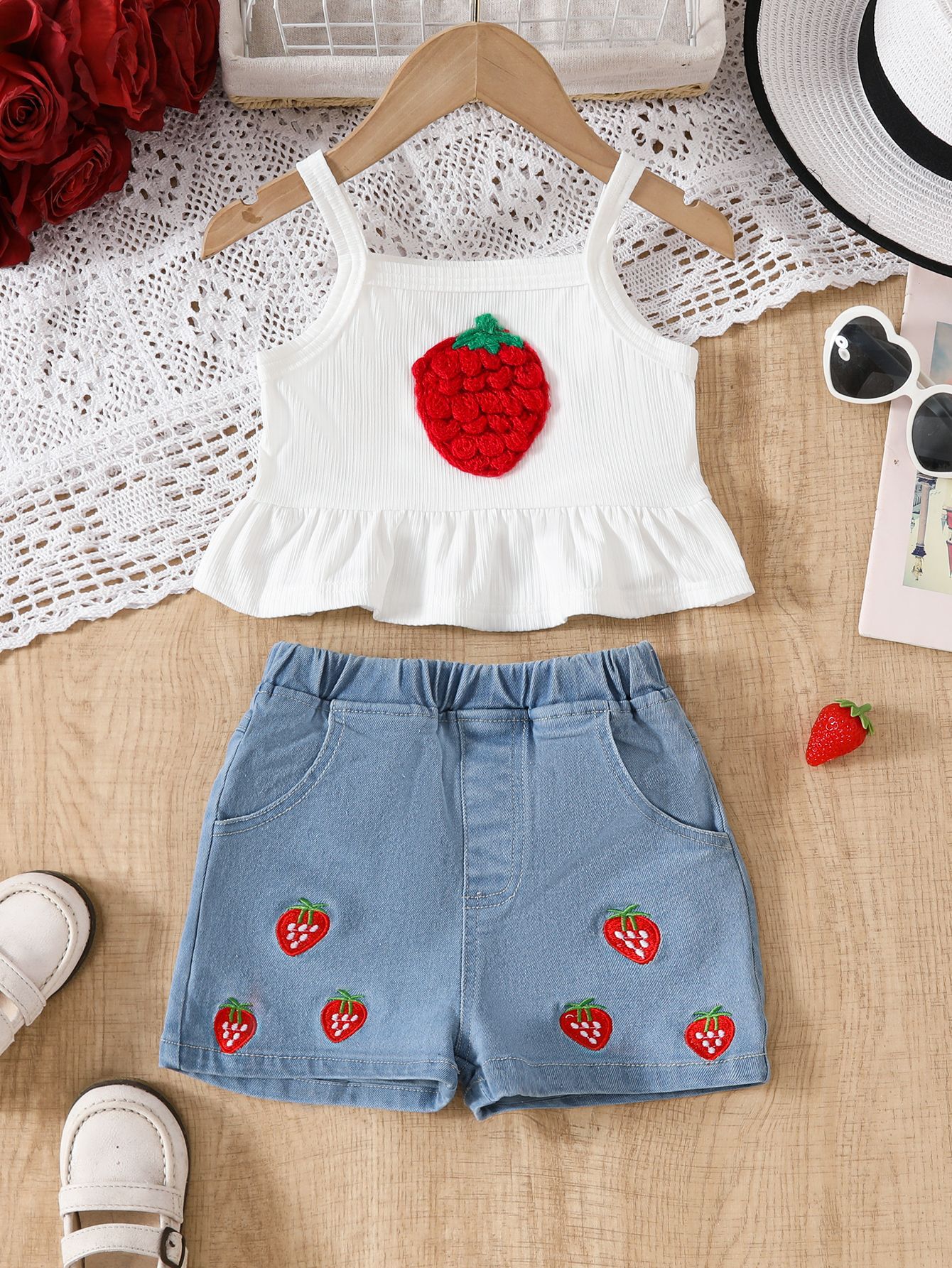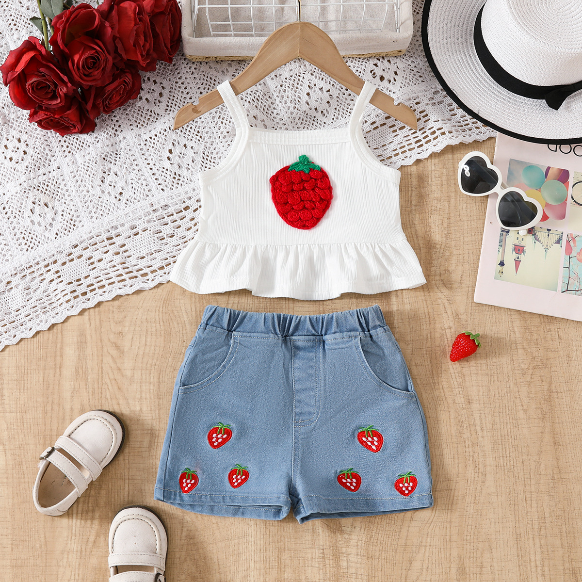 Children's clothing girls suspenders strawberry three-dimensional flower top denim embroidered shorts summer new style