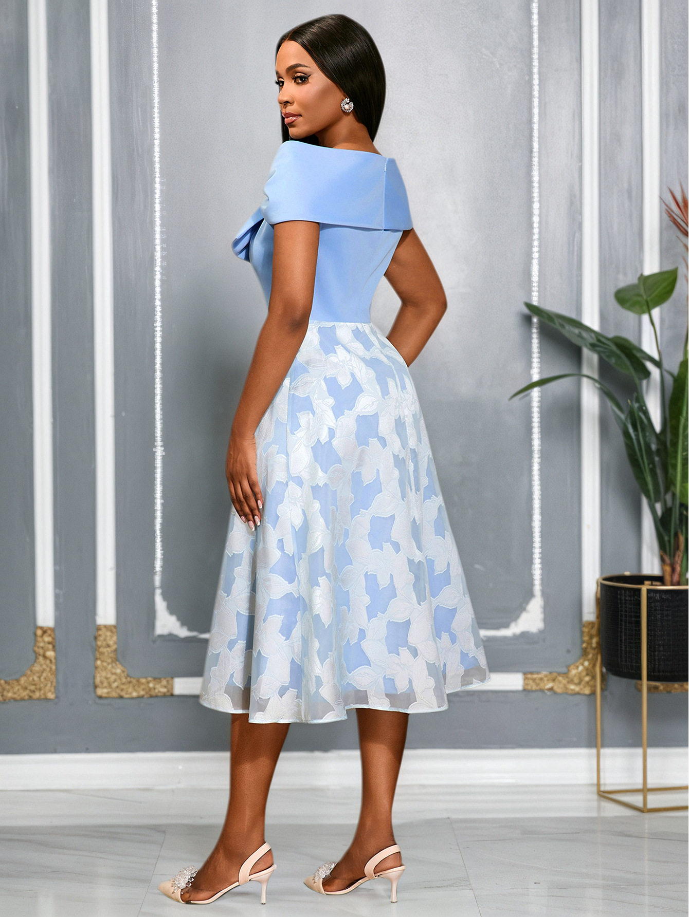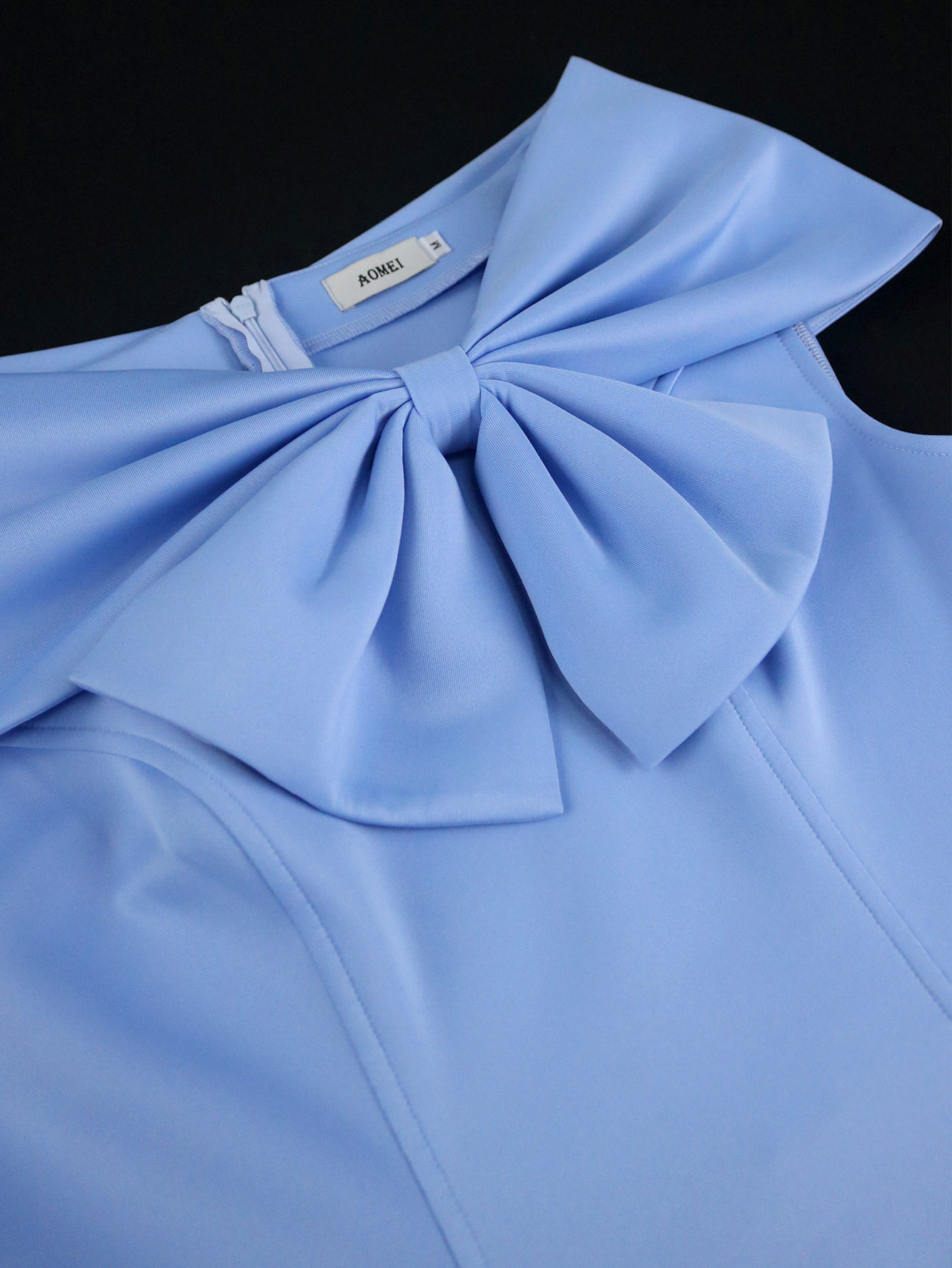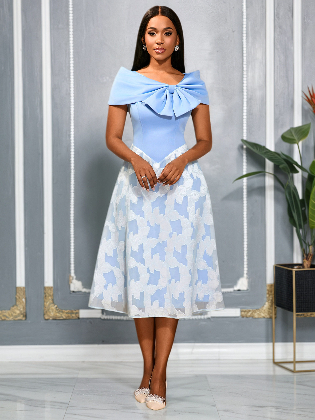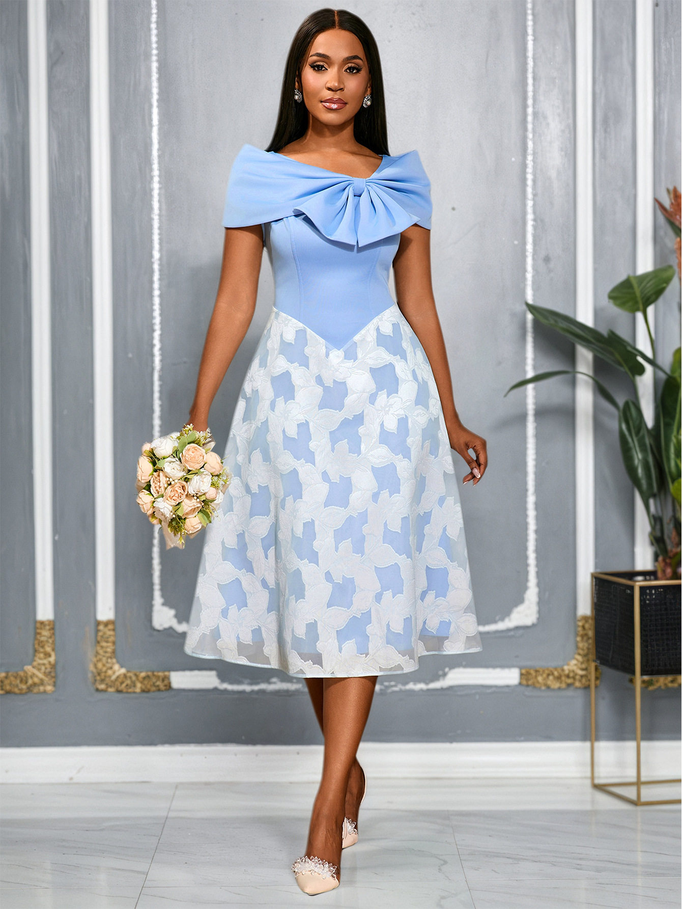 Elegant bow strapless dress jacquard splicing blue chiffon high waist party dresses
