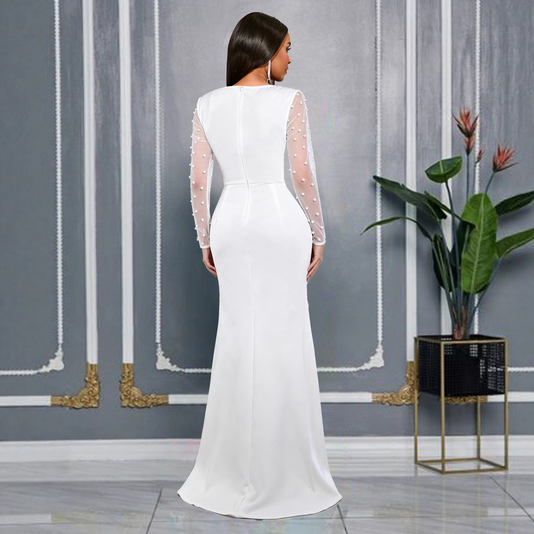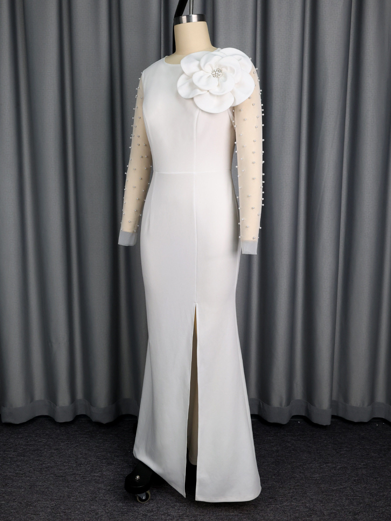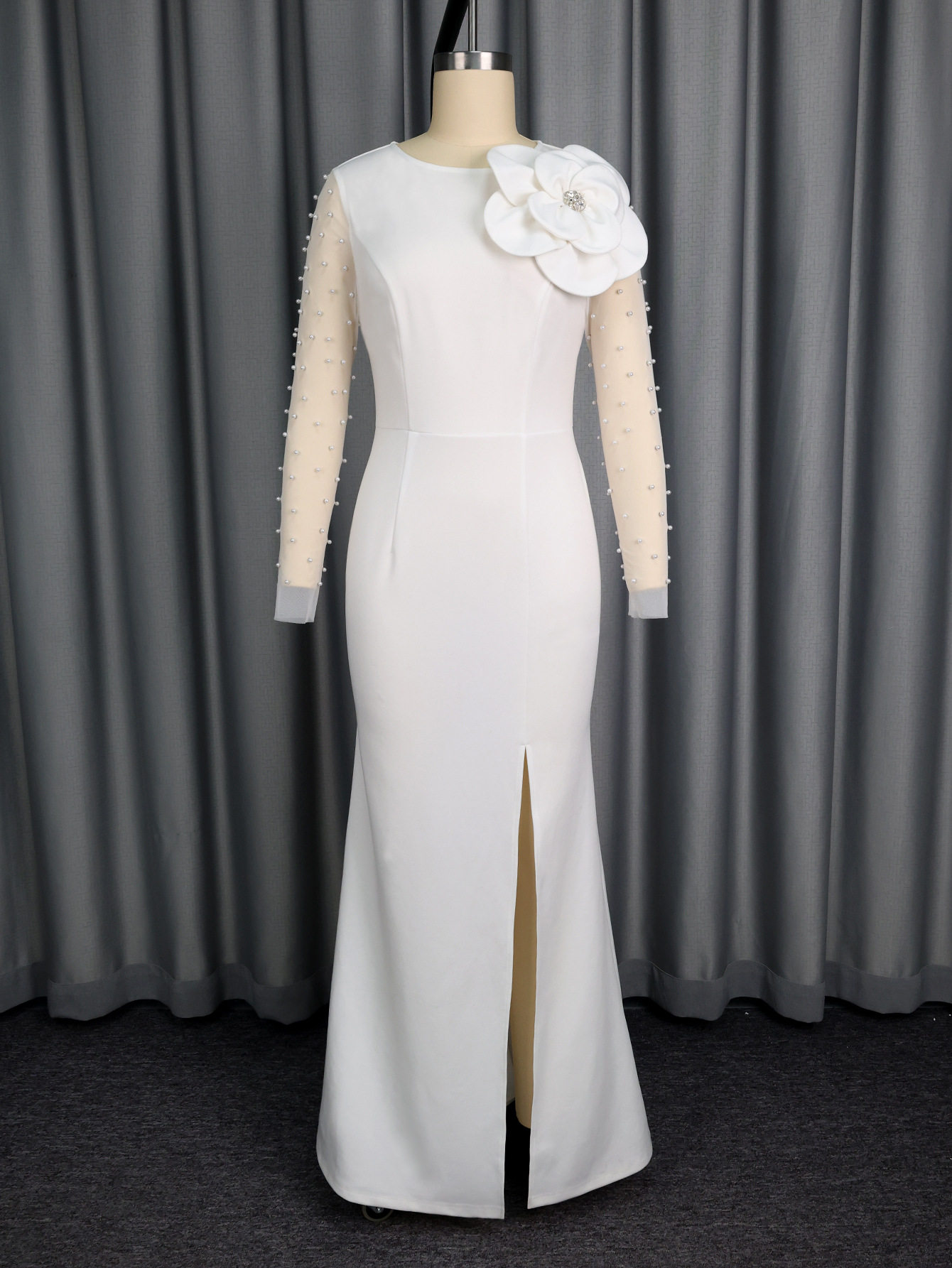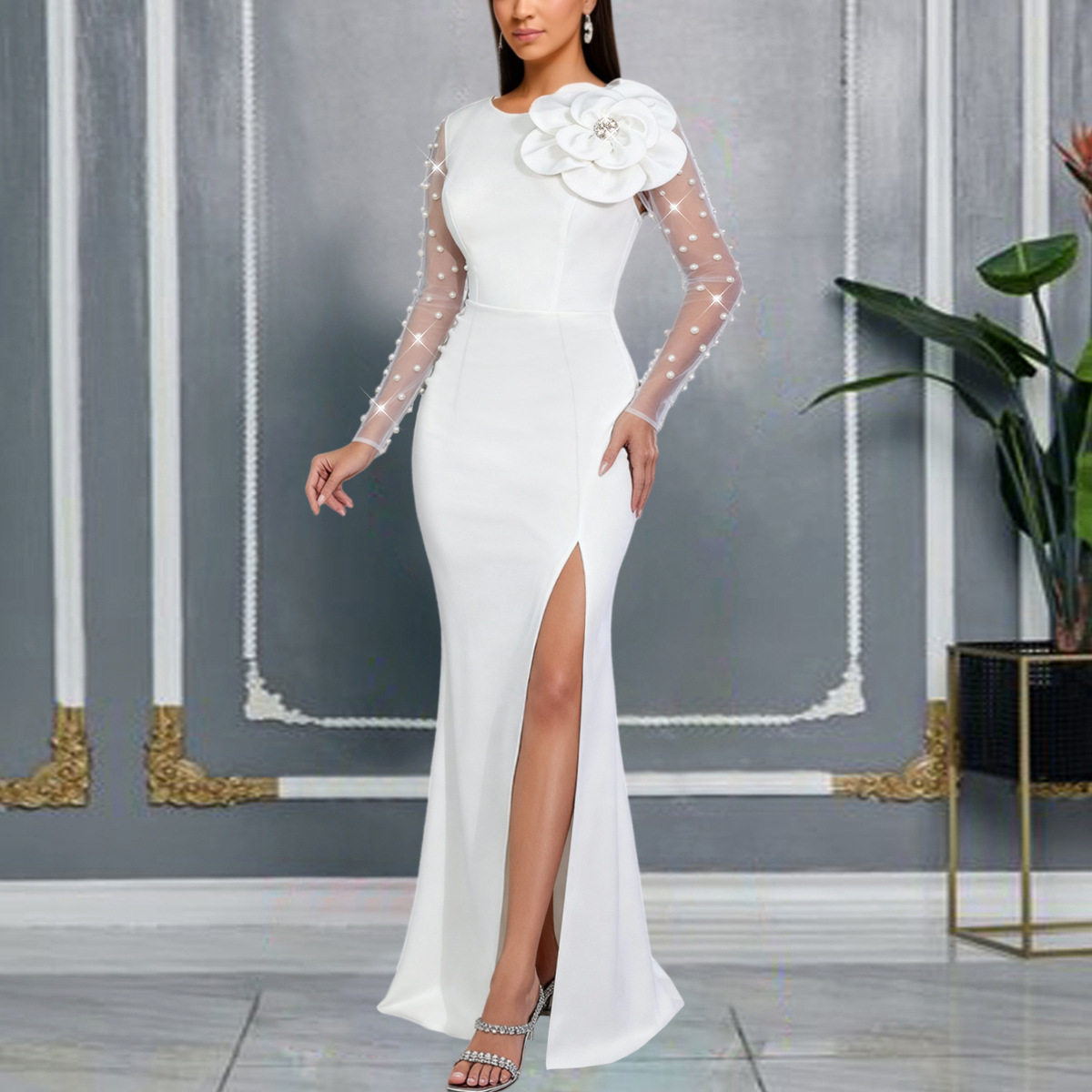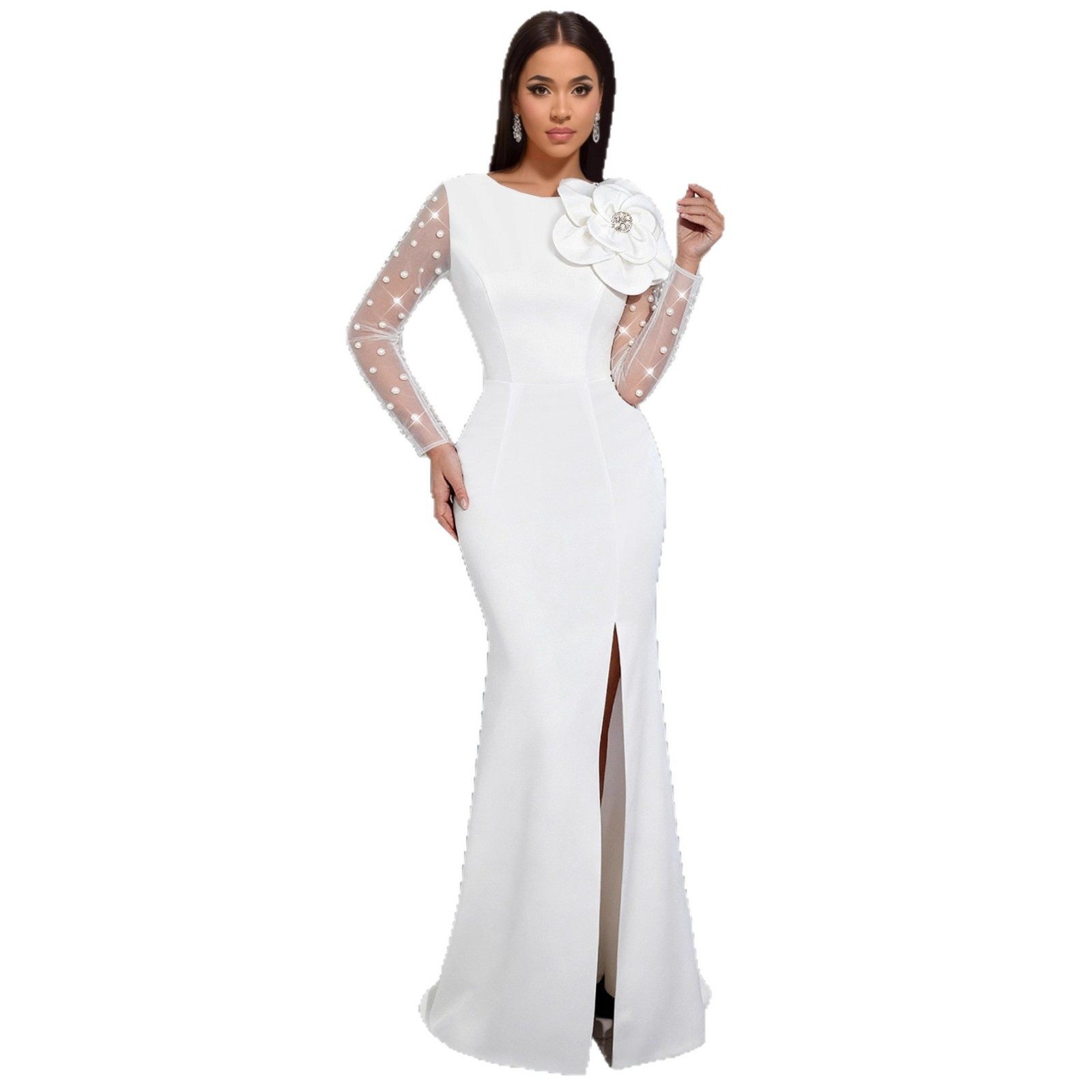 Elegant mesh beaded dress, three-dimensional flower slit, slim-fitting hip-hugging fishtail party evening dress