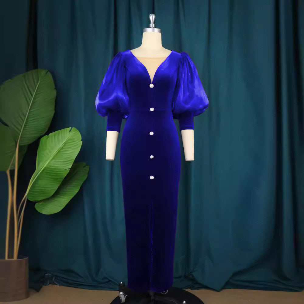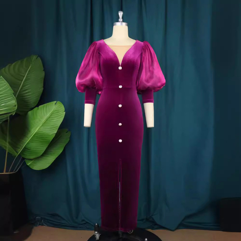 Fashionable lantern sleeve slit dress, light and mature style V-neck dress vintage dress