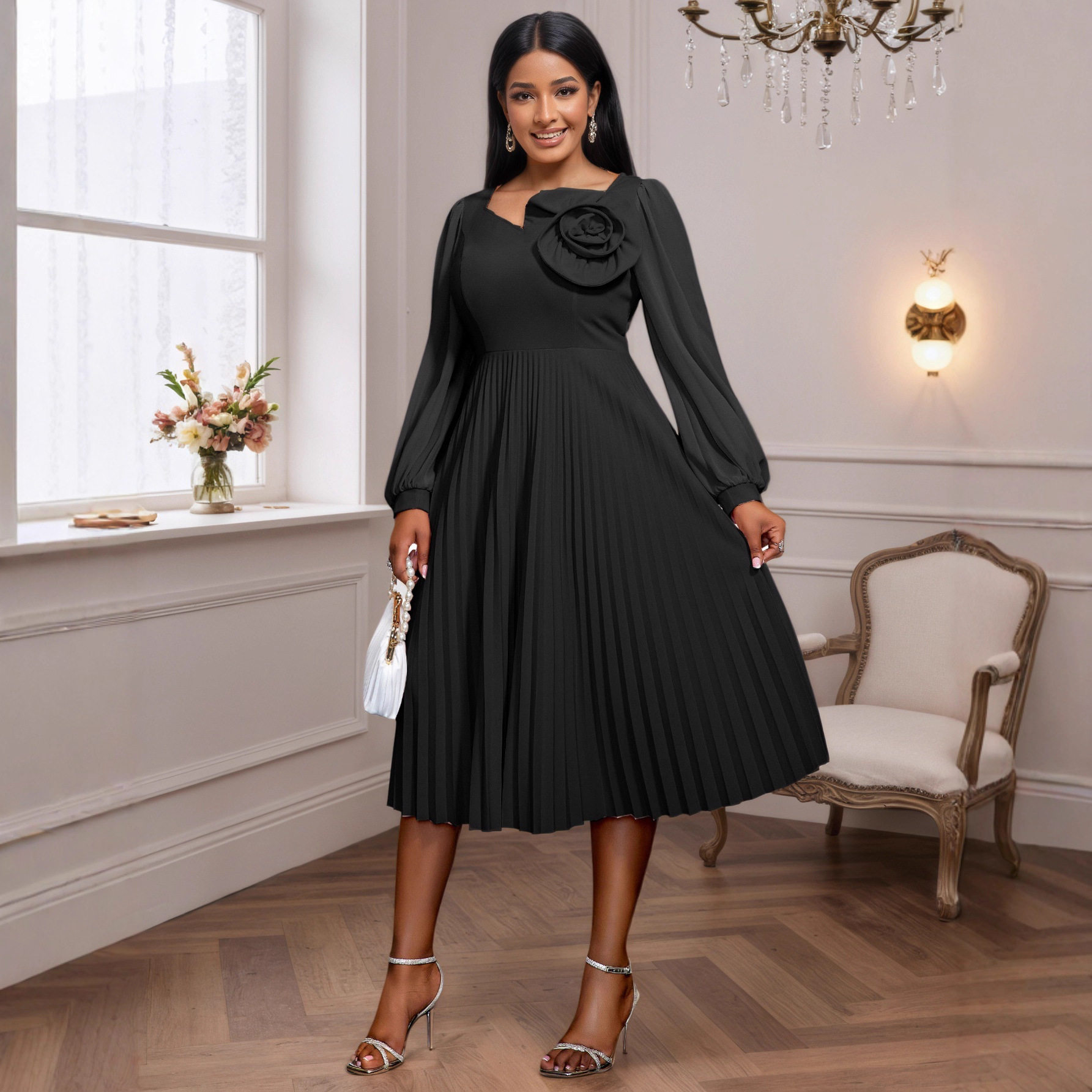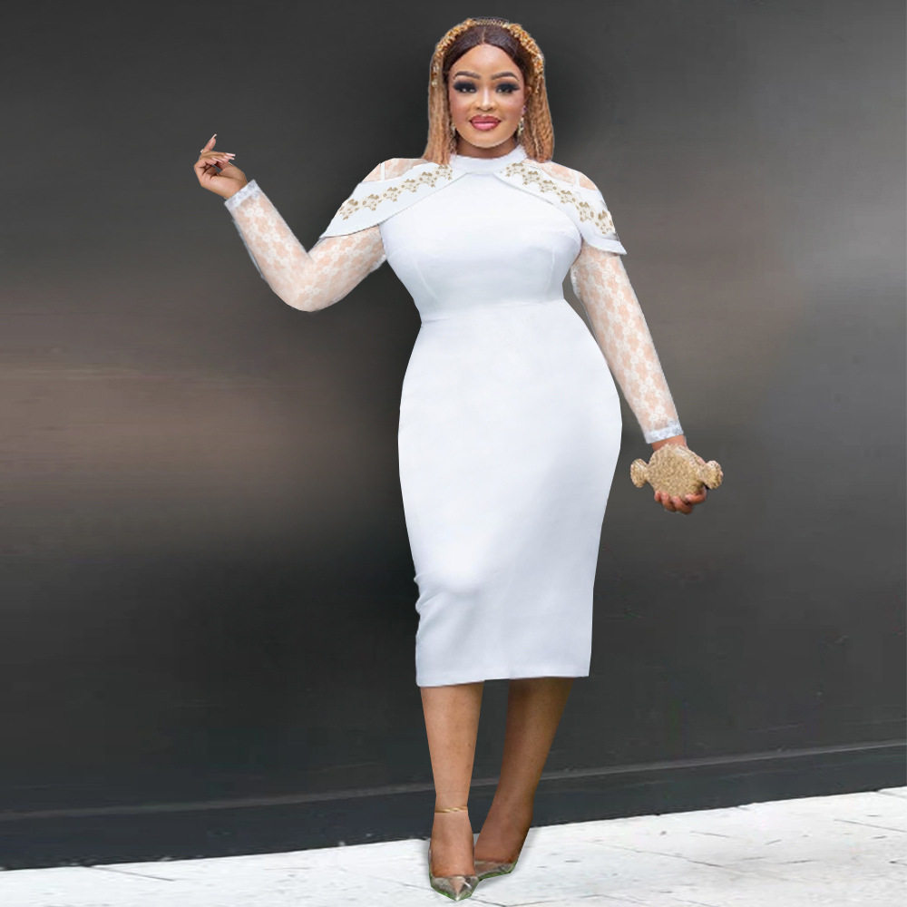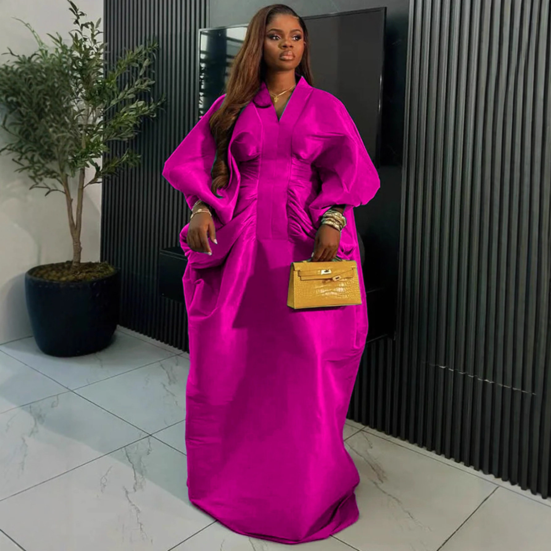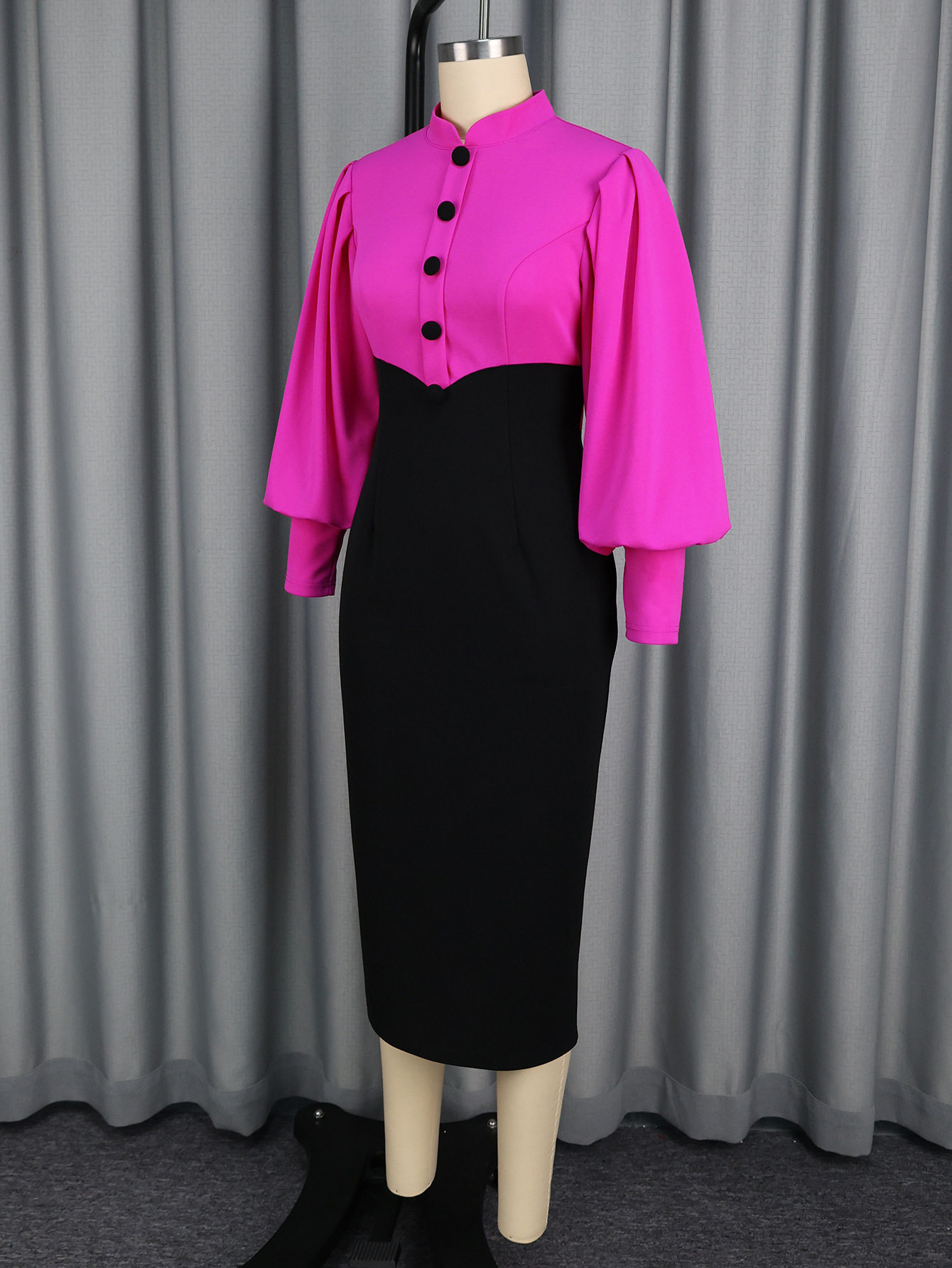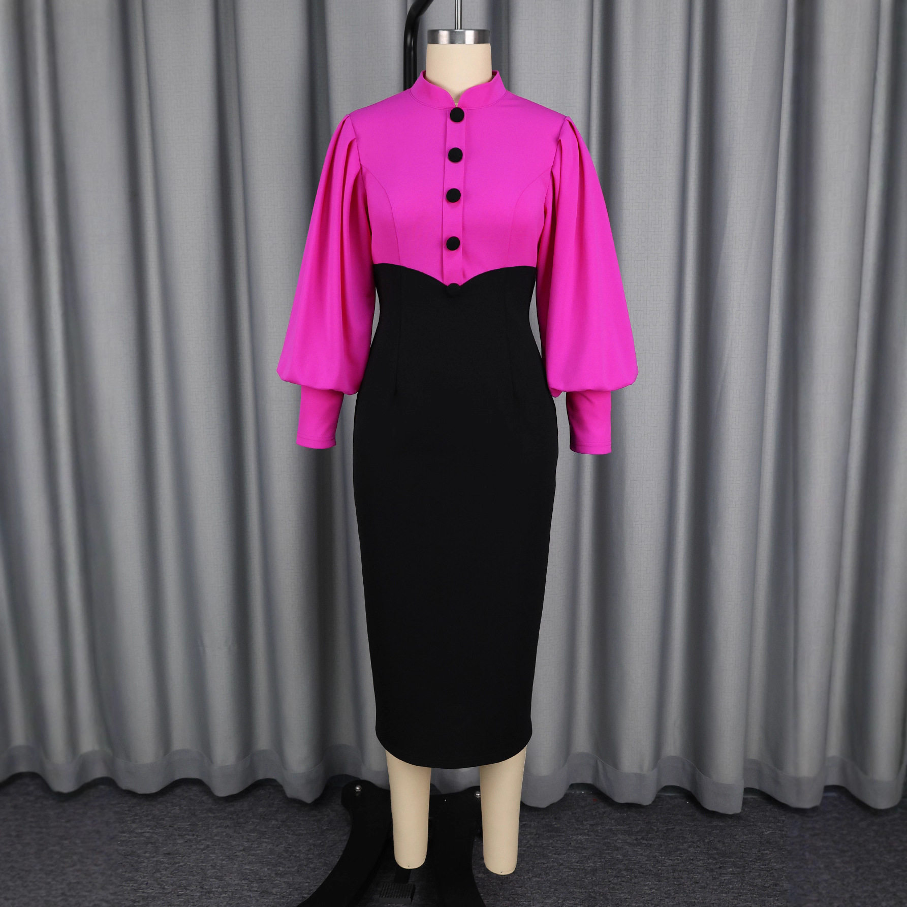 (FREE AIR SHIPPING) Fashionable Stand Collar Button Contrast Color Party Dress Puff Sleeve Waist Elegant Hip Cover Dresses