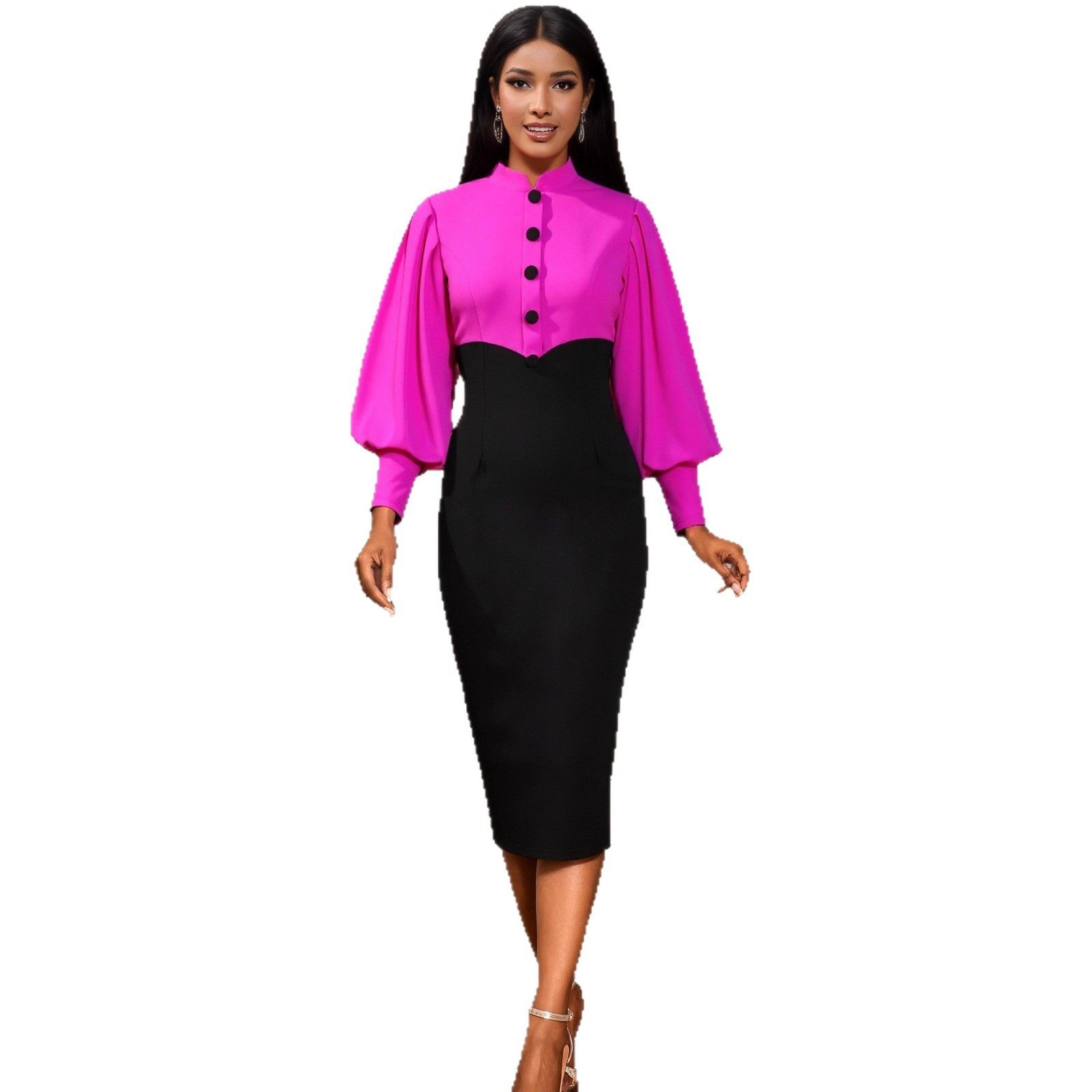 Fashionable Stand Collar Button Contrast Color Party Dress Puff Sleeve Waist Elegant Hip Cover Dresses