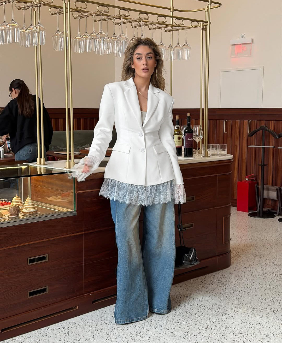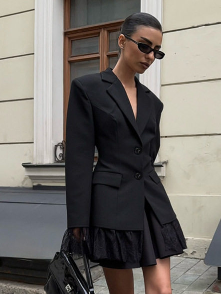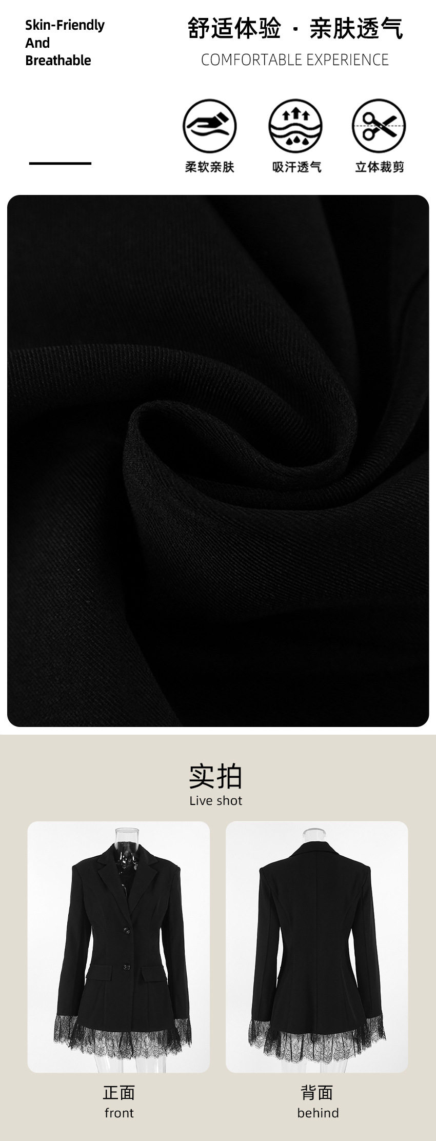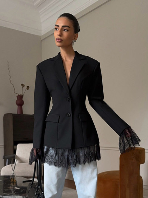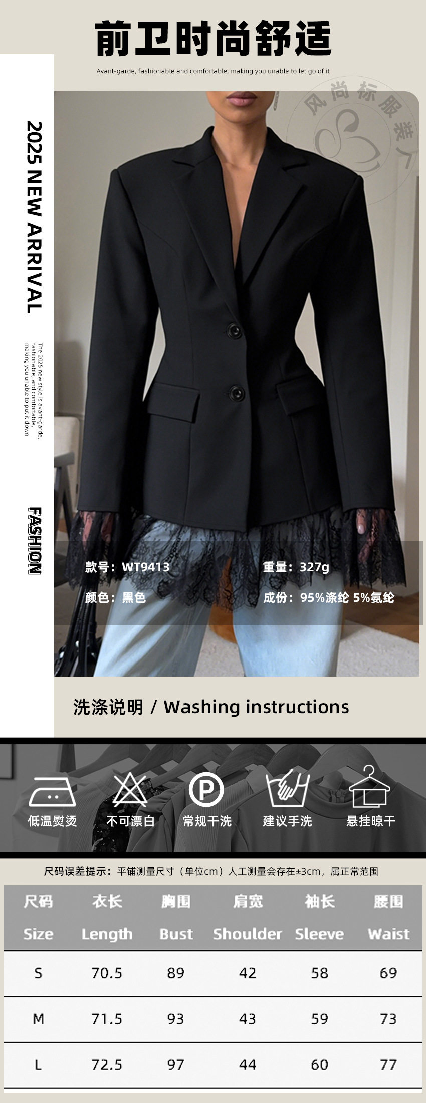 (FREE AIR SHIPPING) Gentle style niche design black small suit jacket for women autumn versatile waist long-sleeved lace splicing suit
