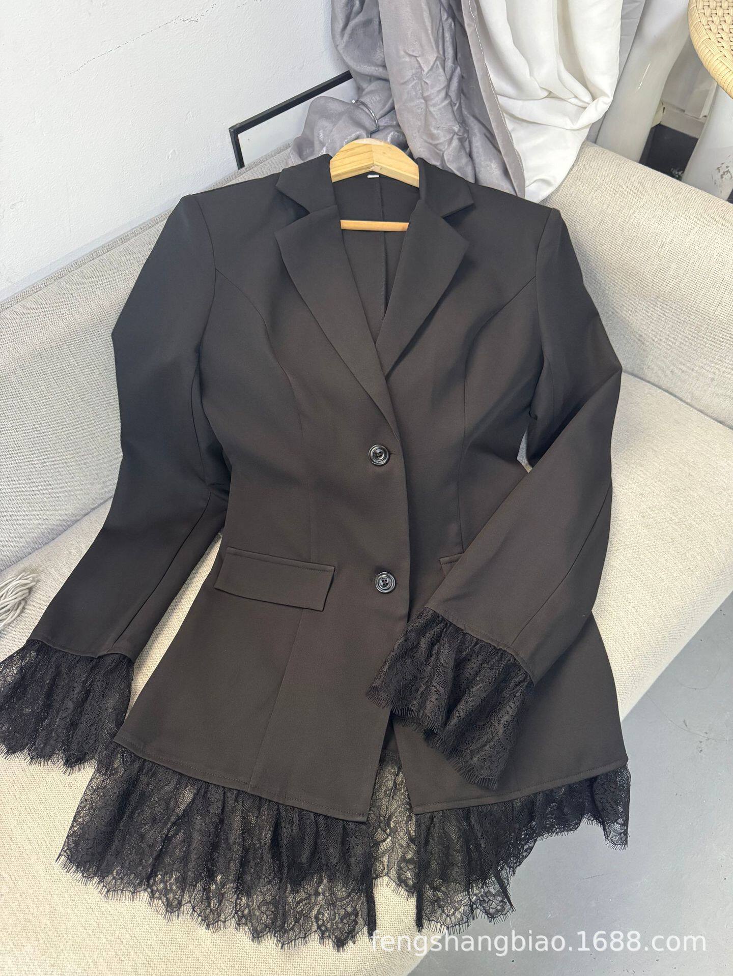 Gentle style niche design black small suit jacket for women autumn versatile waist long-sleeved lace splicing suit