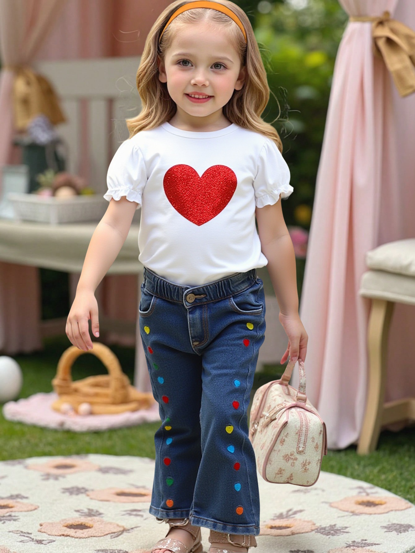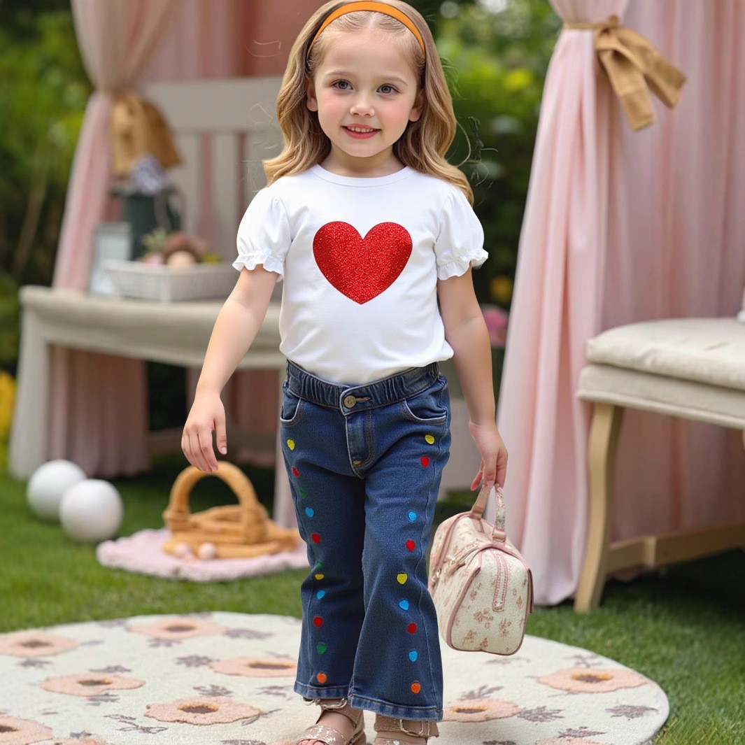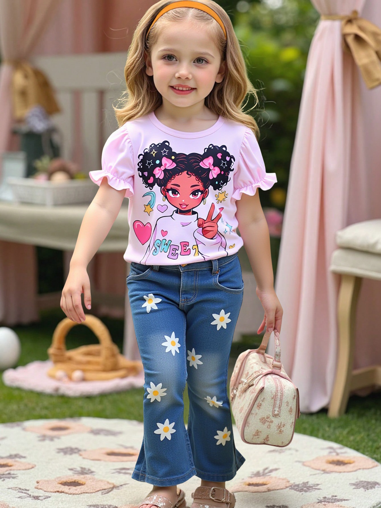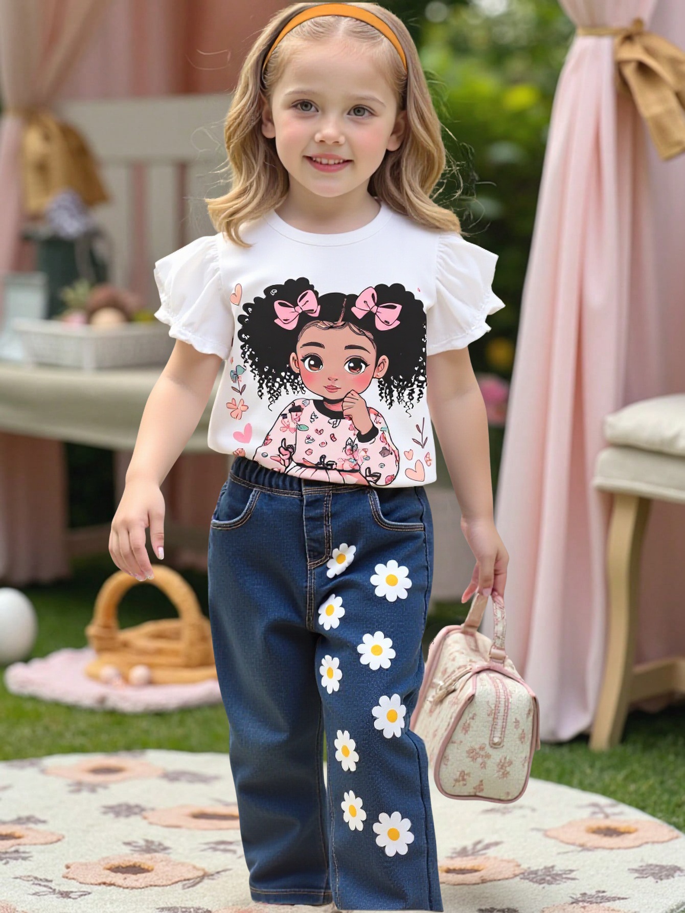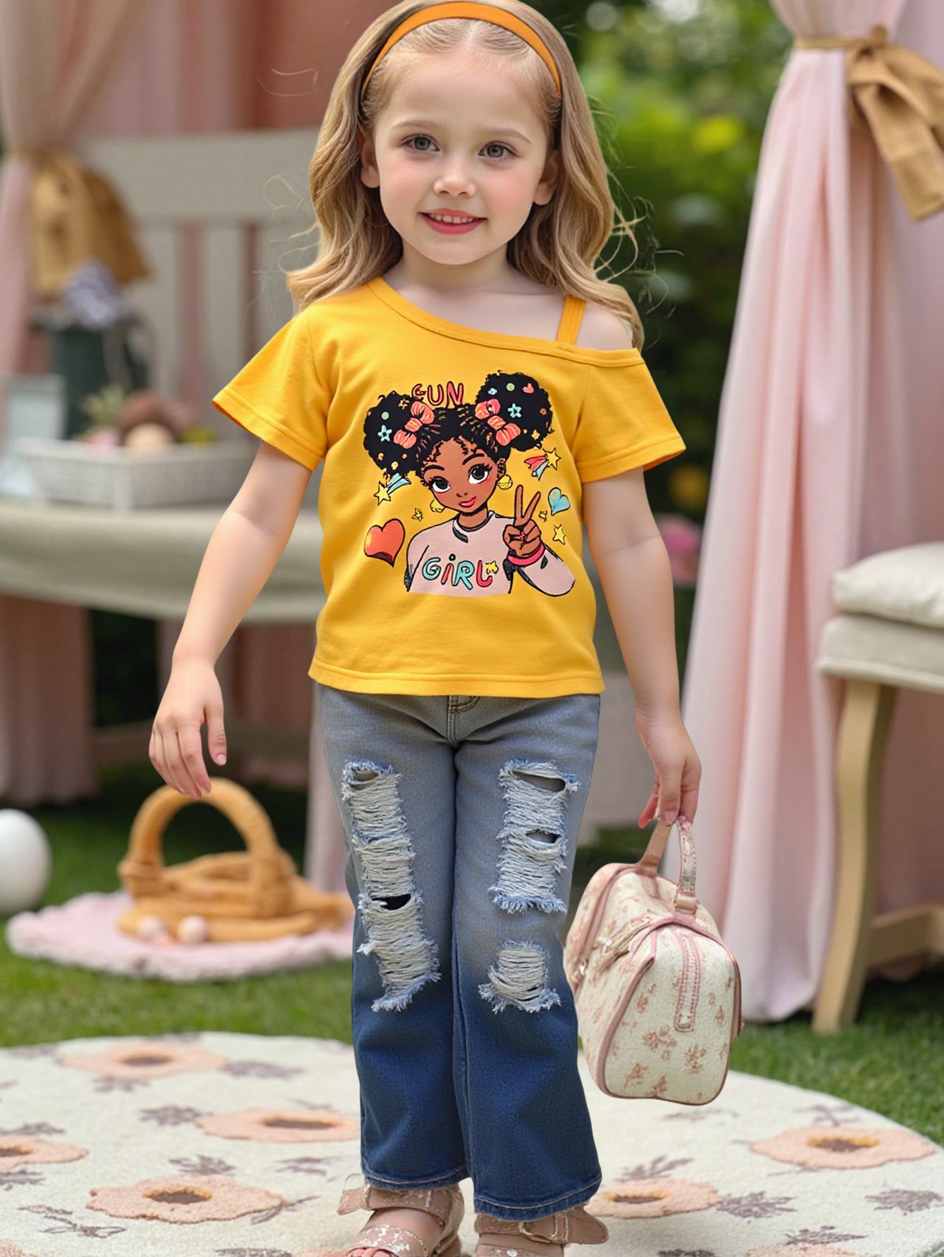 Girls' jeans suit, stylish cartoon T-shirt + printed jeans suit