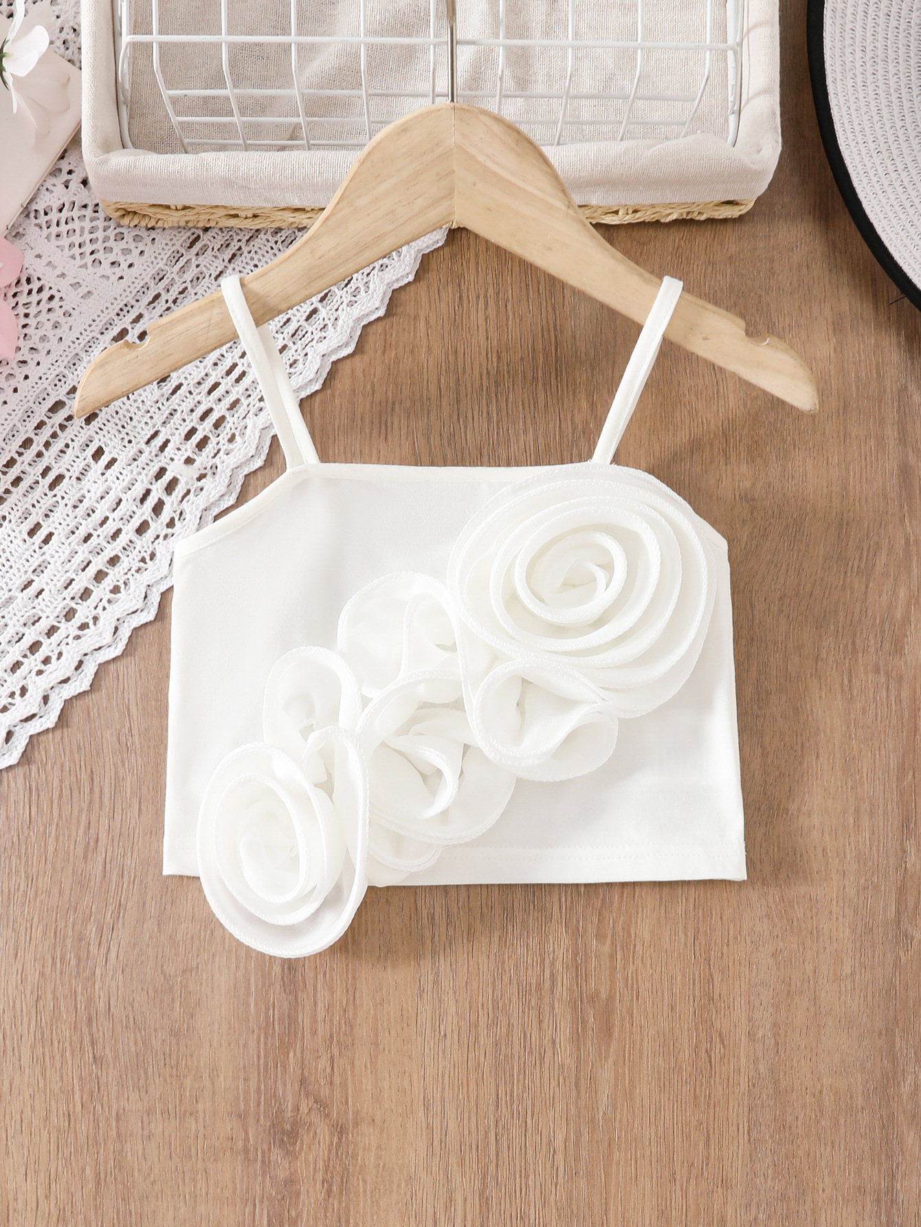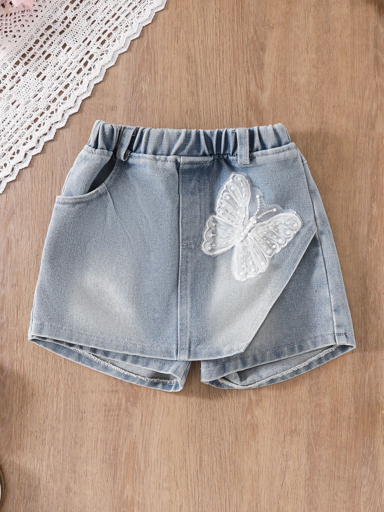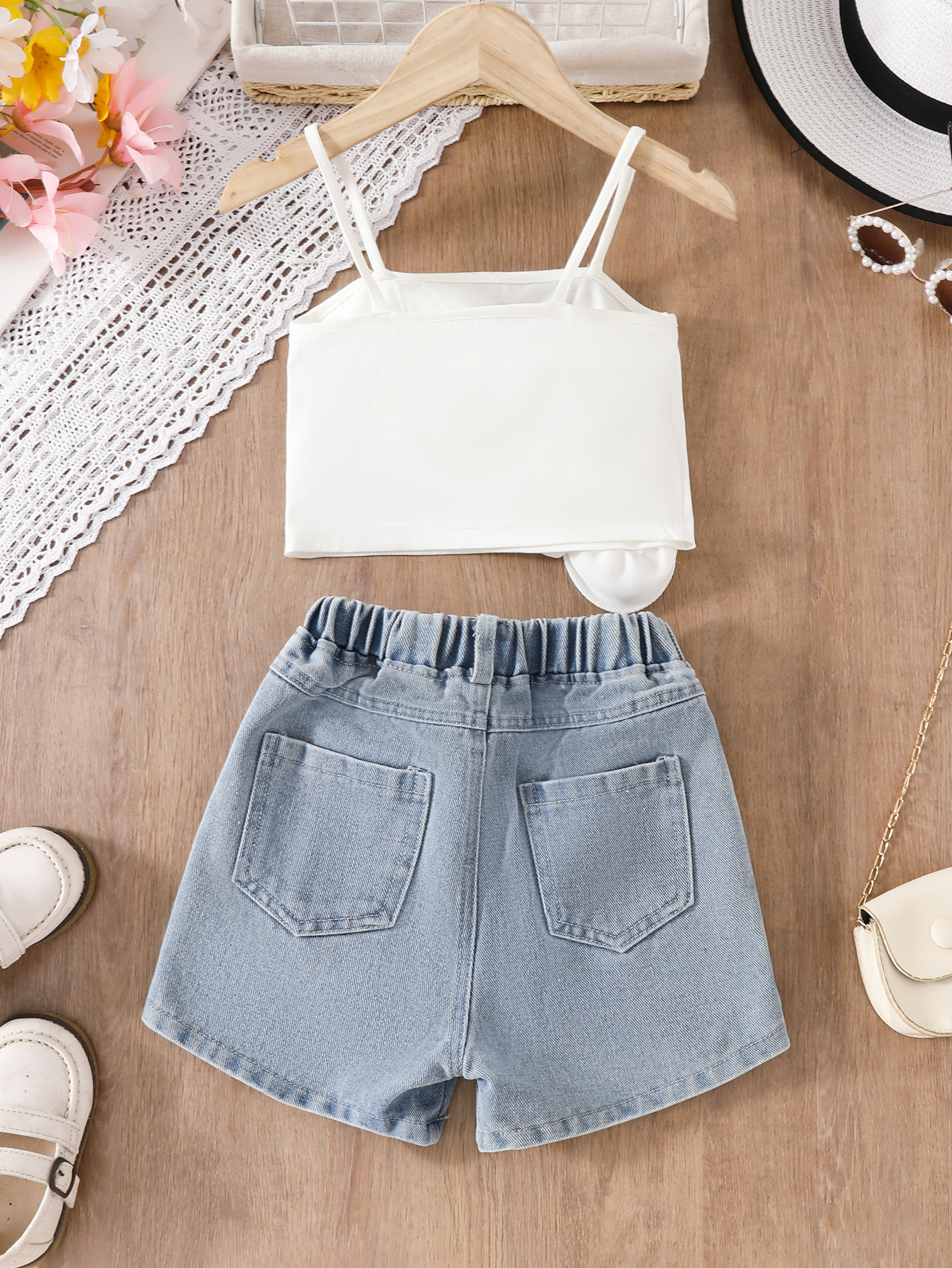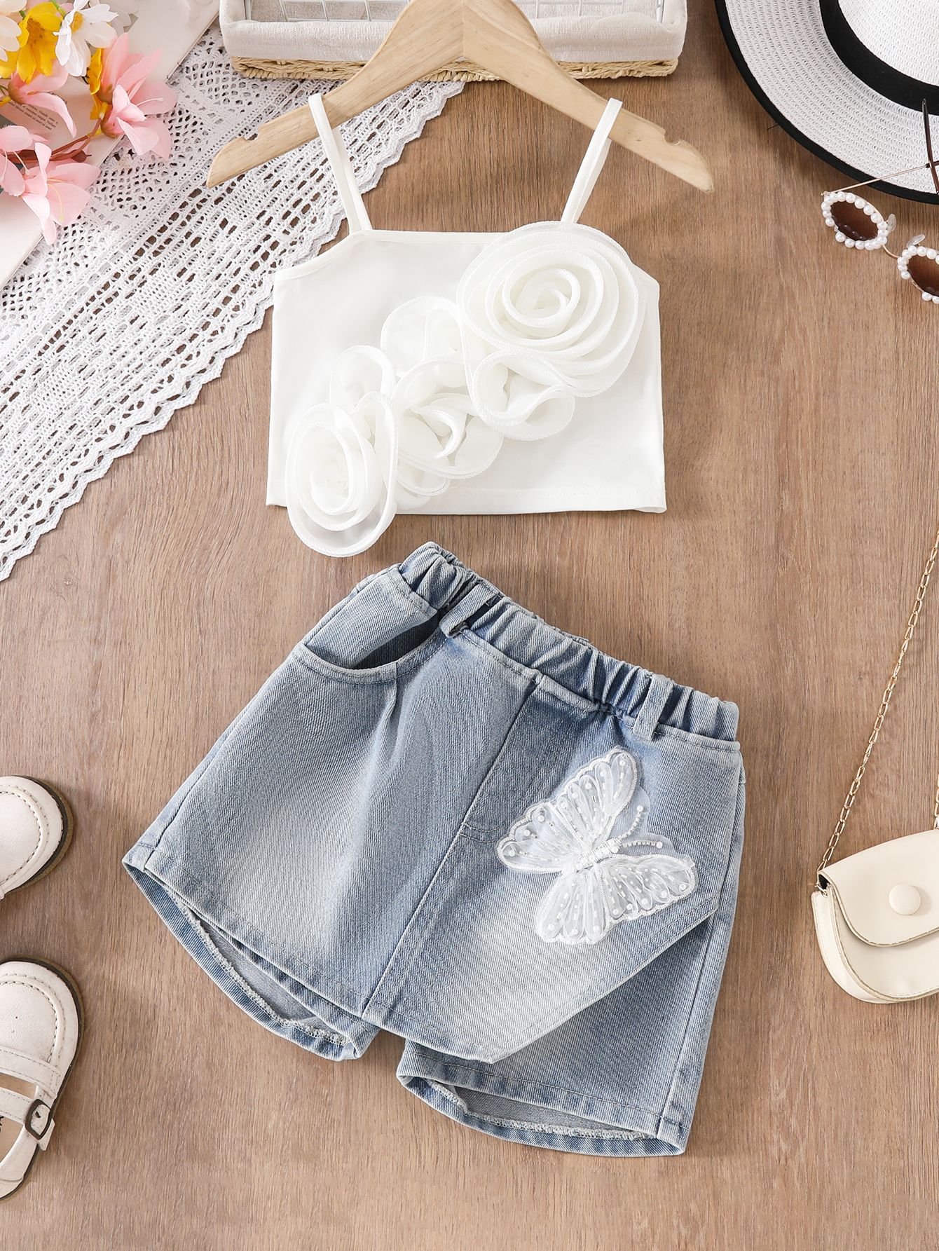 Girls' Summer Hot-Selling New Three-Dimensional Flower Camisole T-Shirt and Butterfly Denim Shorts Set for Young Children