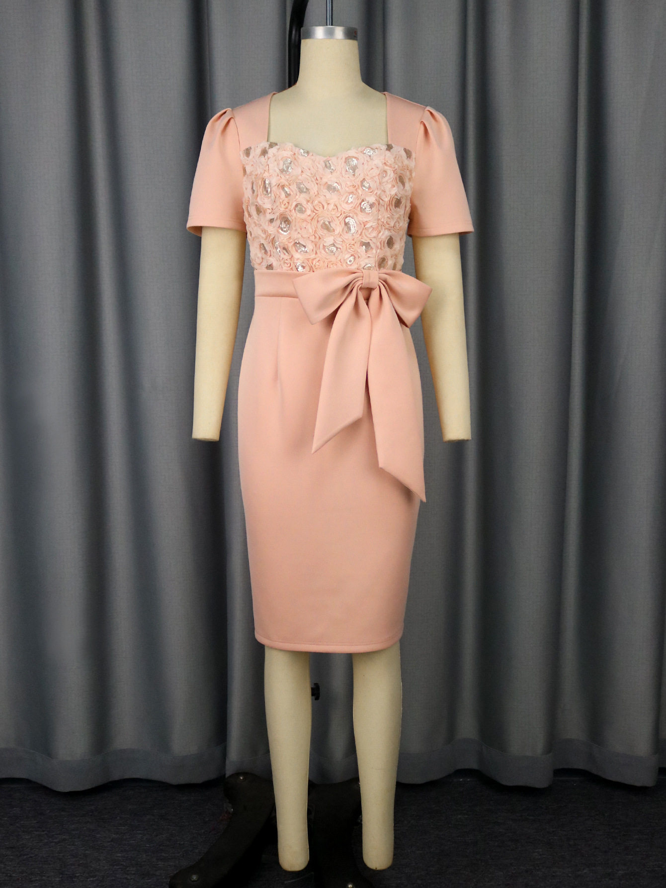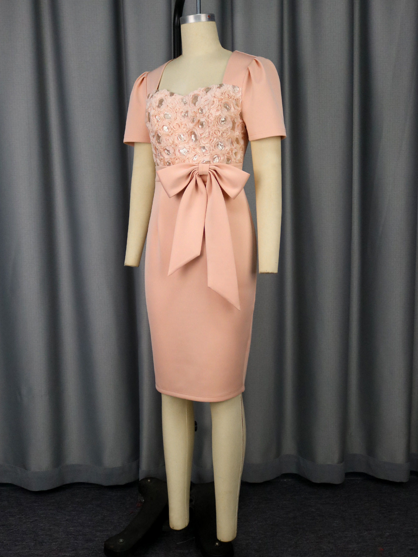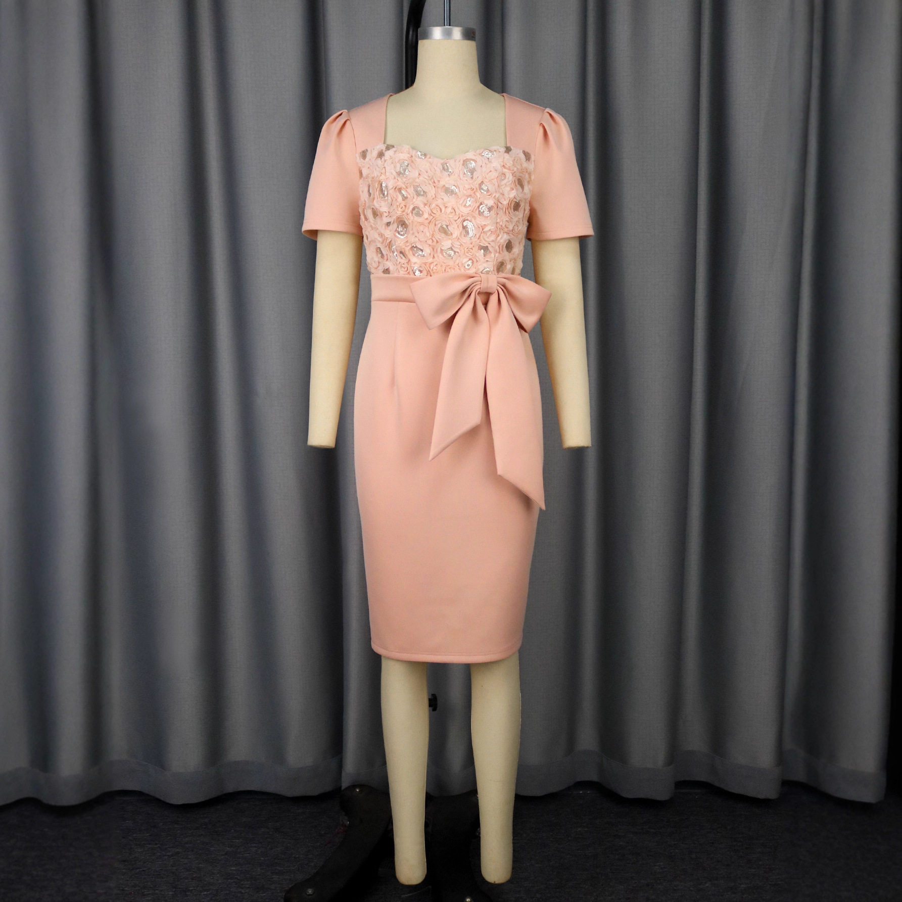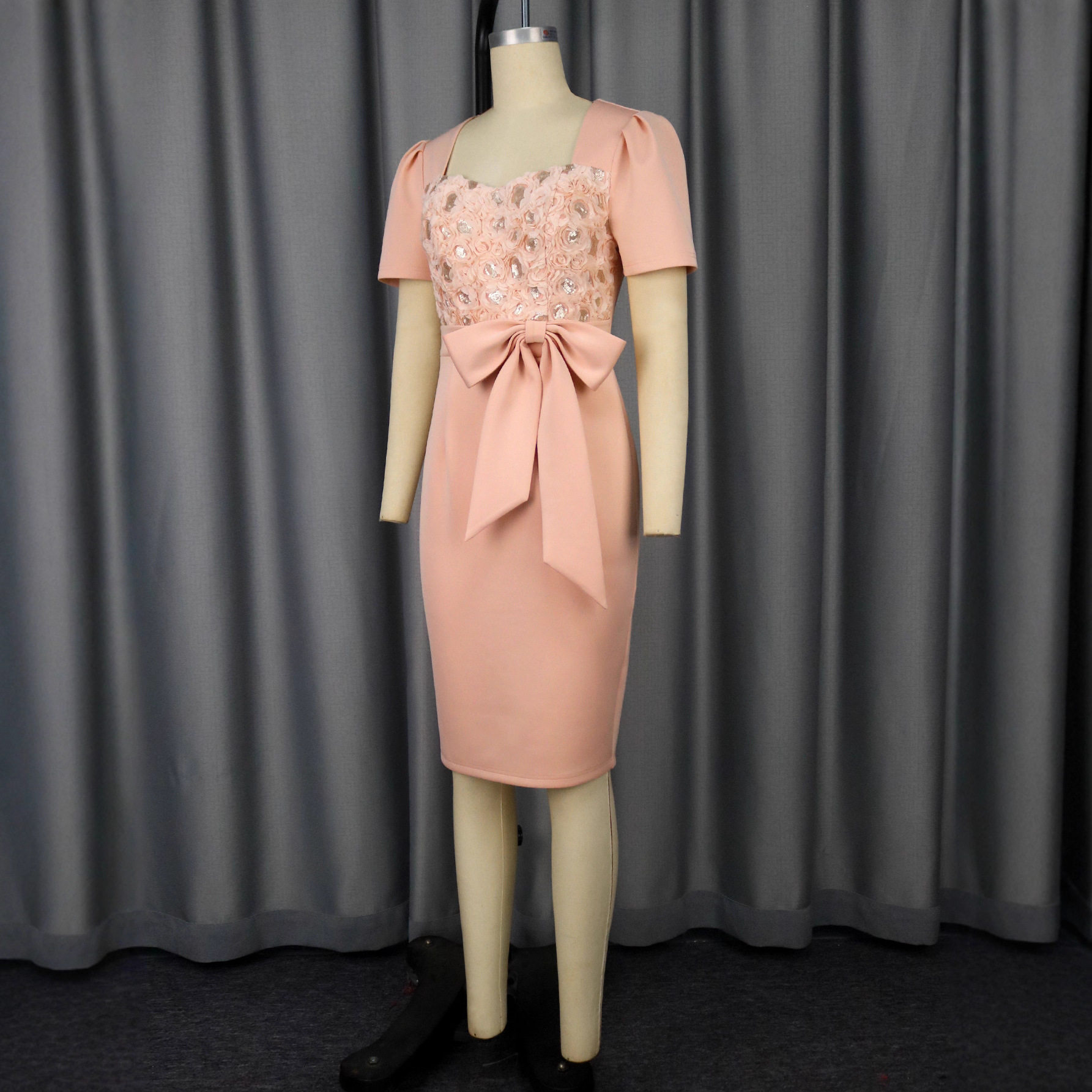 High-end three-dimensional rose flower square neck dress bow waist waist banquet hip skirt dress