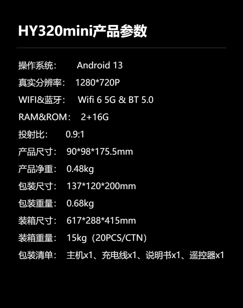 Hy320mini projector short throw high definition white wall 4k wireless projection portable projector portable office