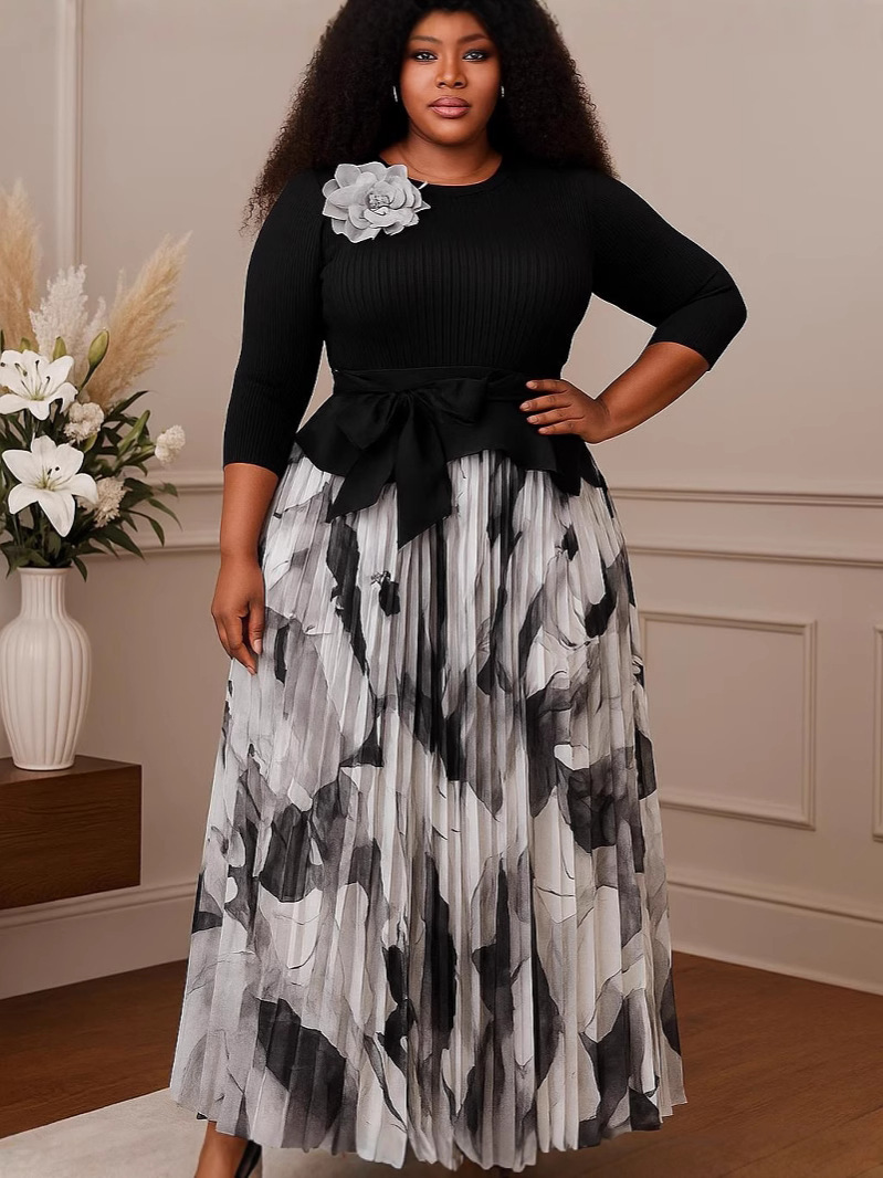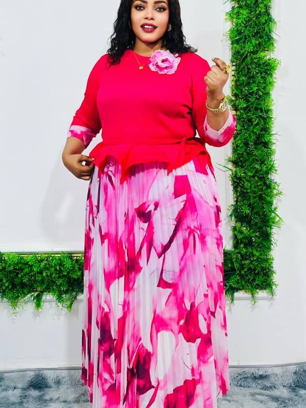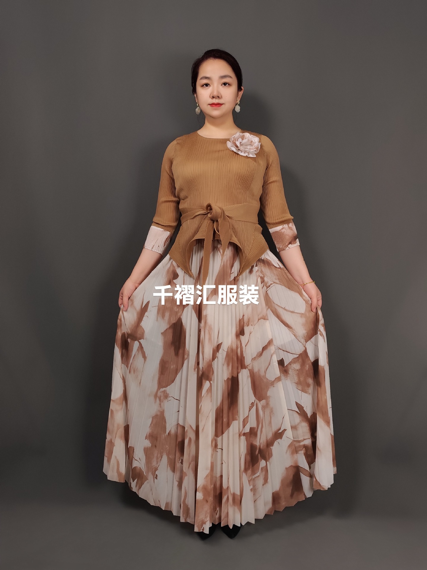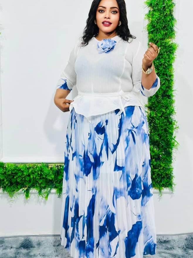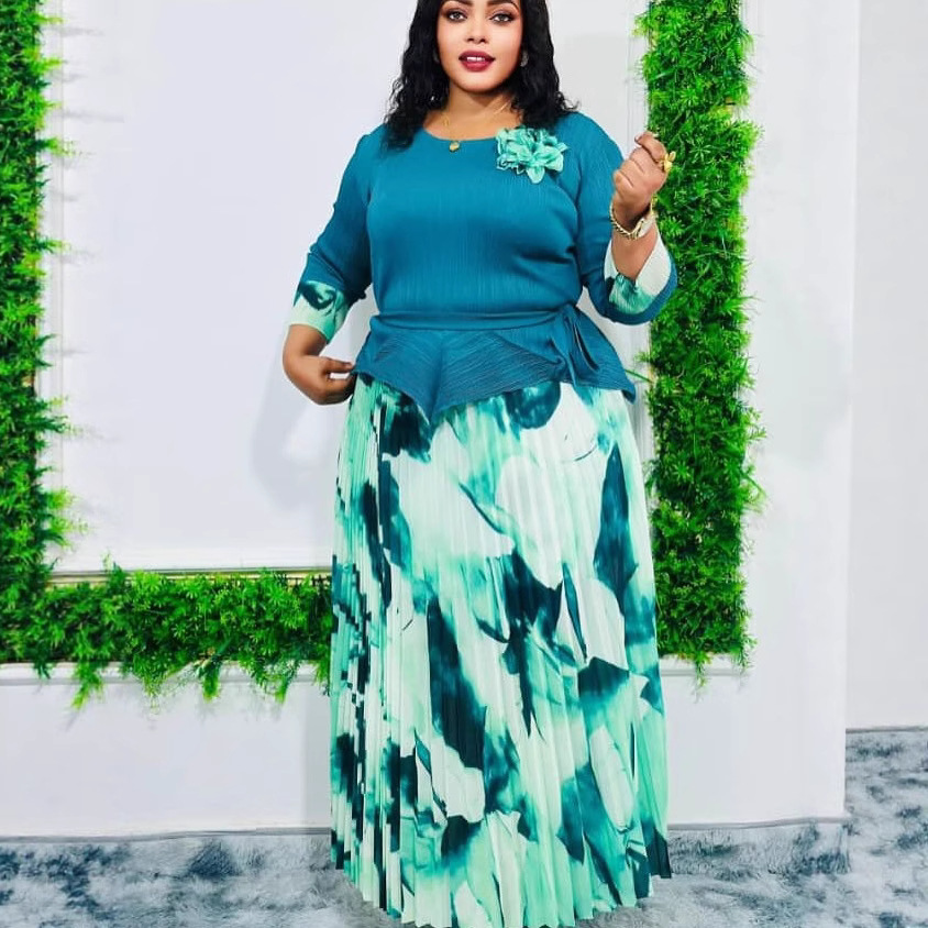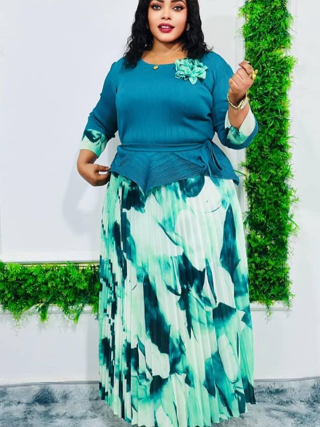 Irregular design top printed elegant pleated skirt suit