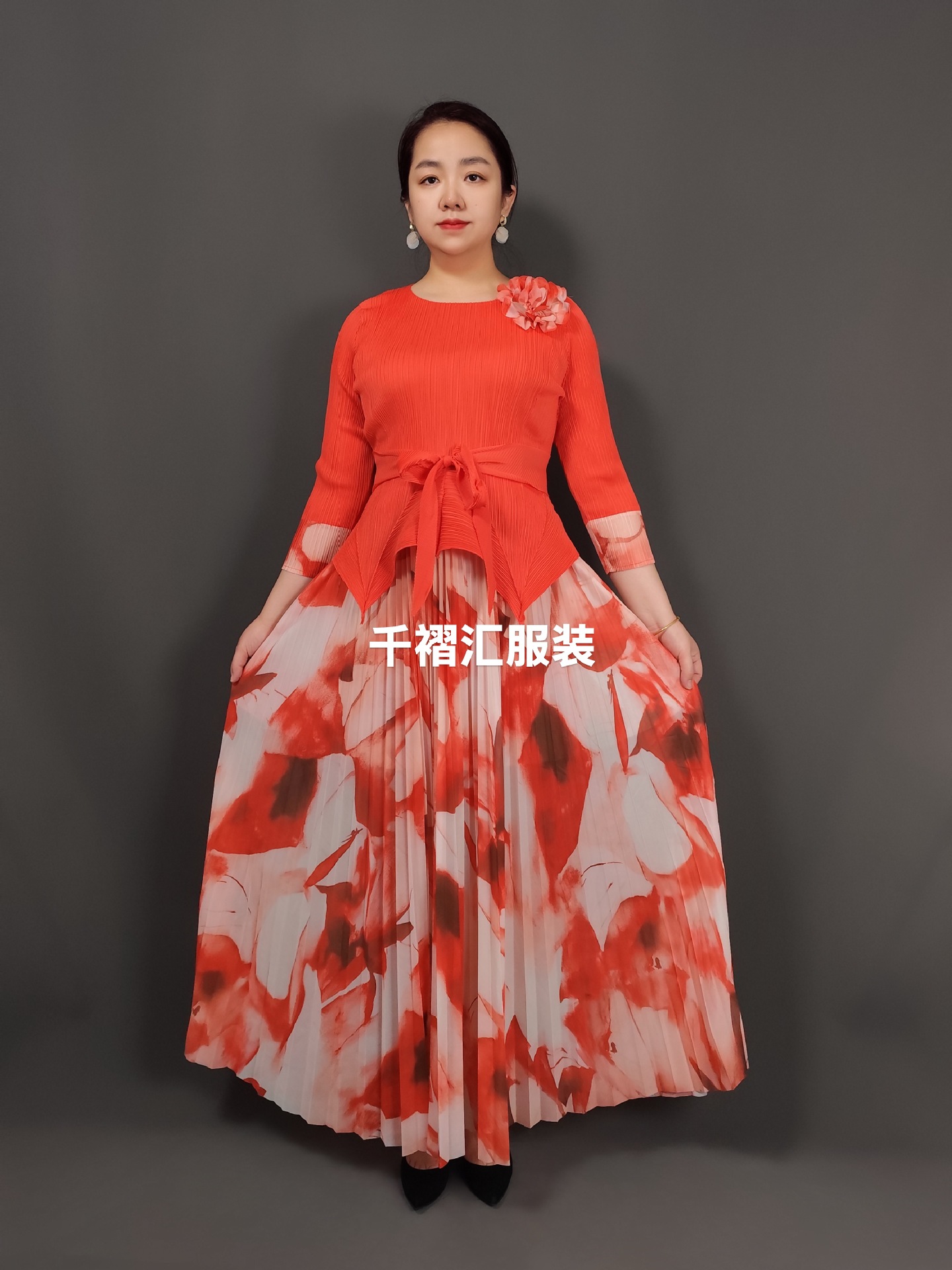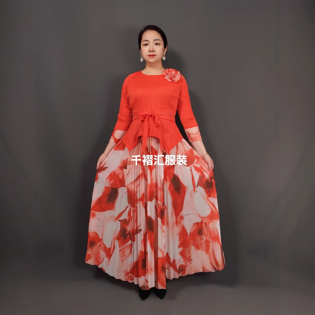 (FREE AIR SHIPPING) irregular design top printed elegant pleated skirt suit