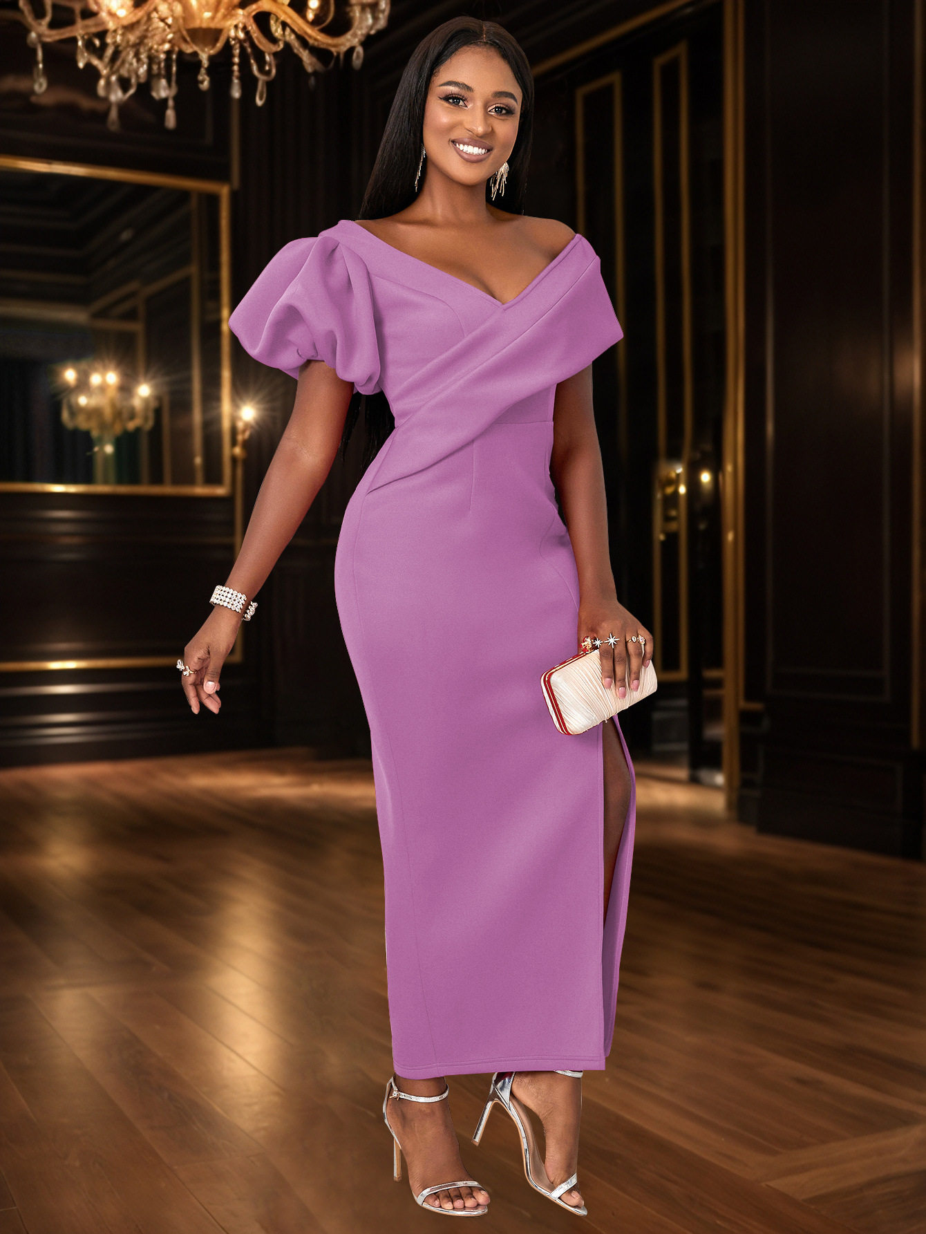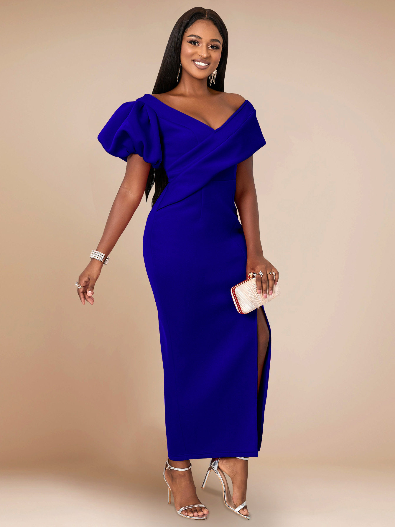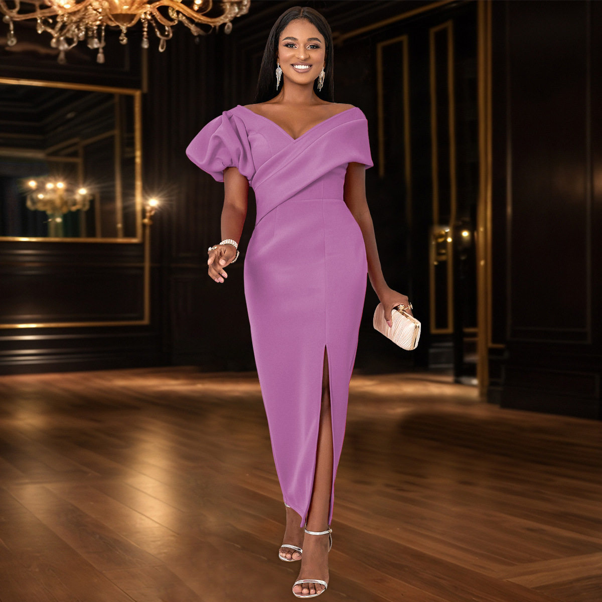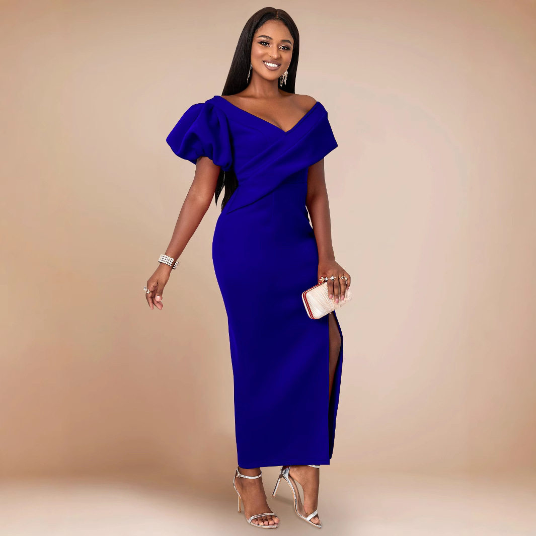 Lantern Sleeve V-Neck Dress Banquet Party Elegant Pure Black Dress Dresses
