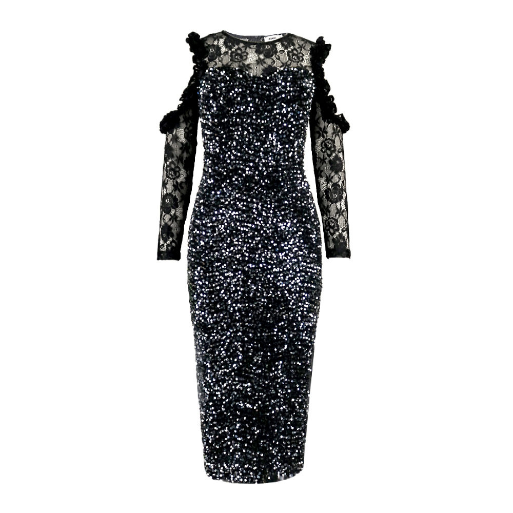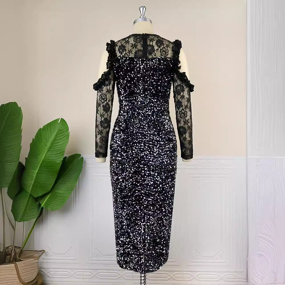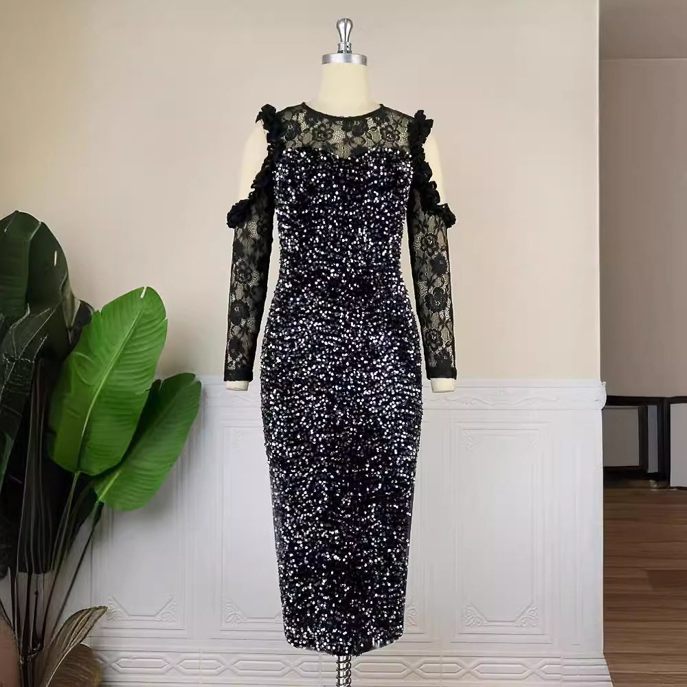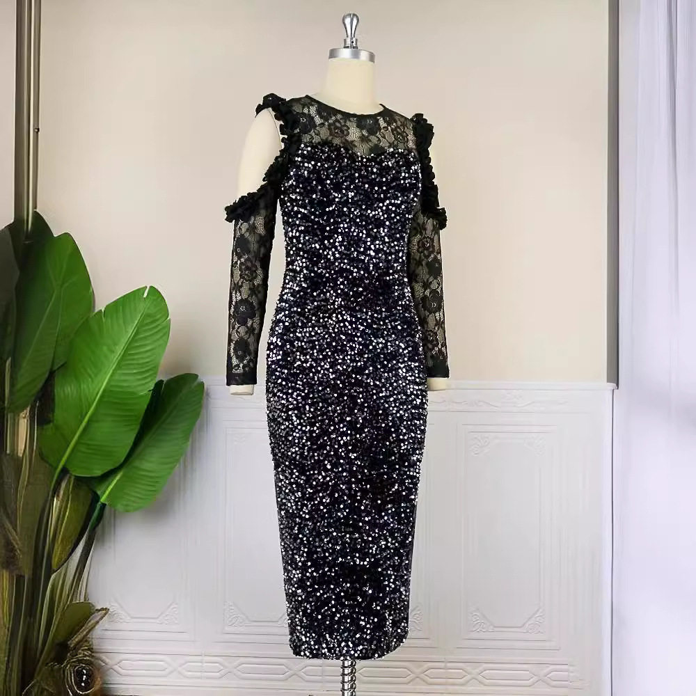 Off-the-shoulder sequin dress for early autumn, ladylike lace splicing sexy hip-hugging skirt dresses