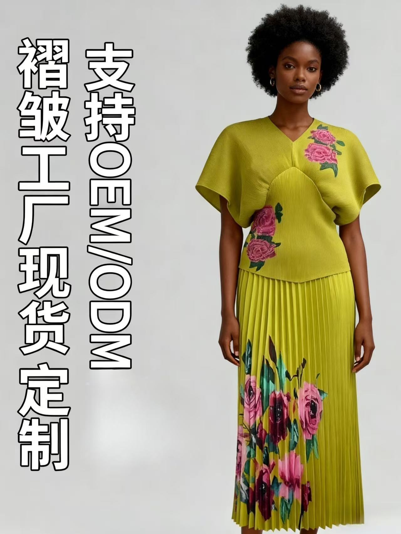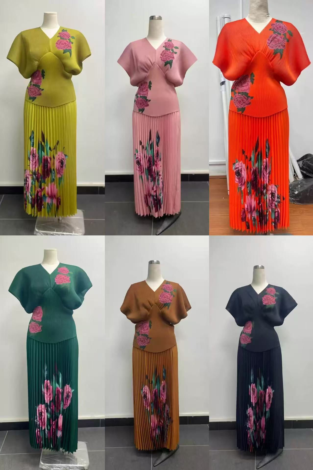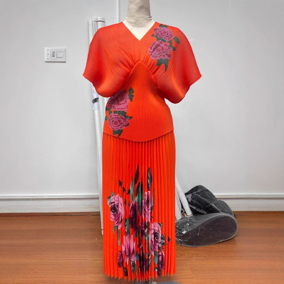 (FREE AIR SHIPPING) pleated printed large size suit, fashionable temperament, slim top, elegant skirt, two-piece set Miyake