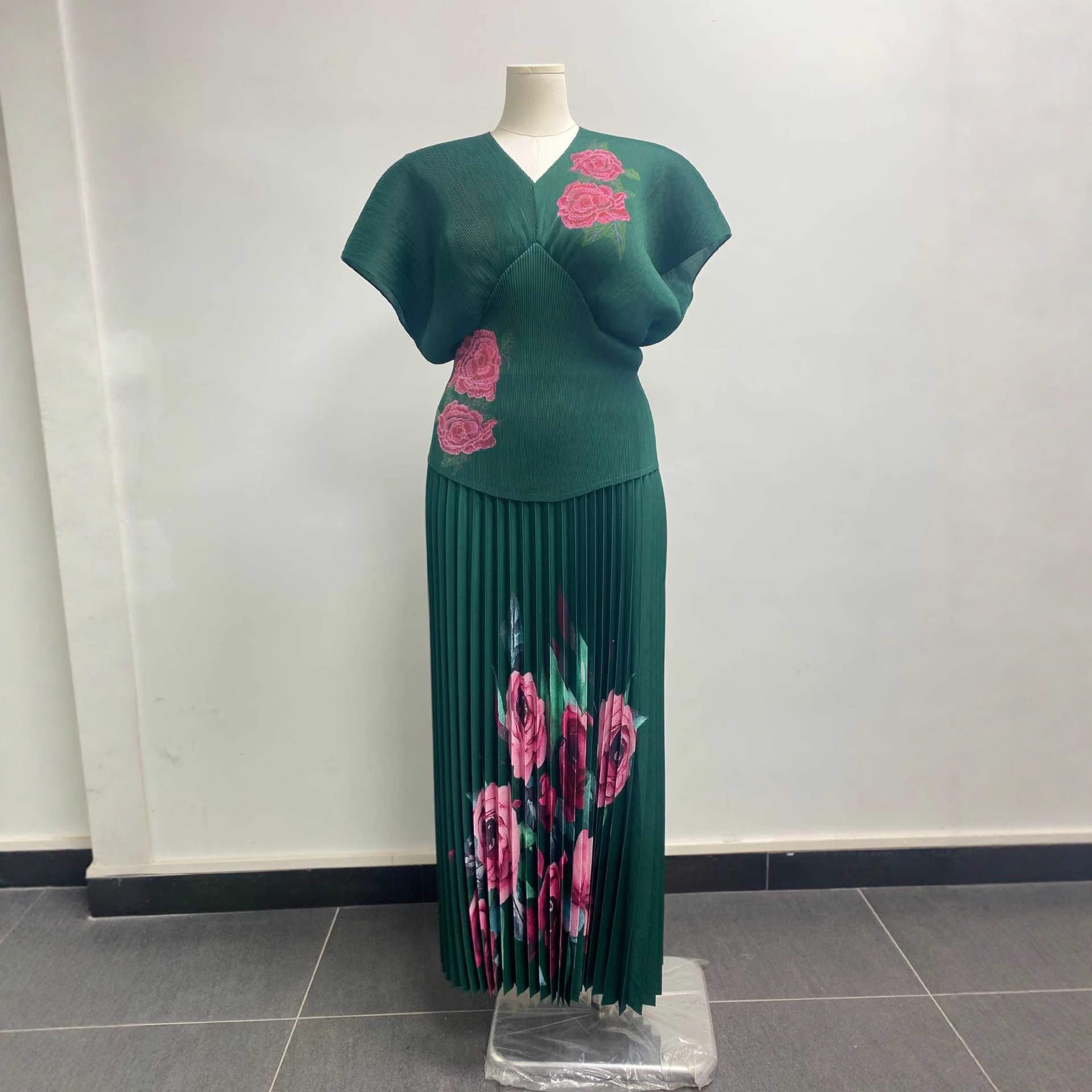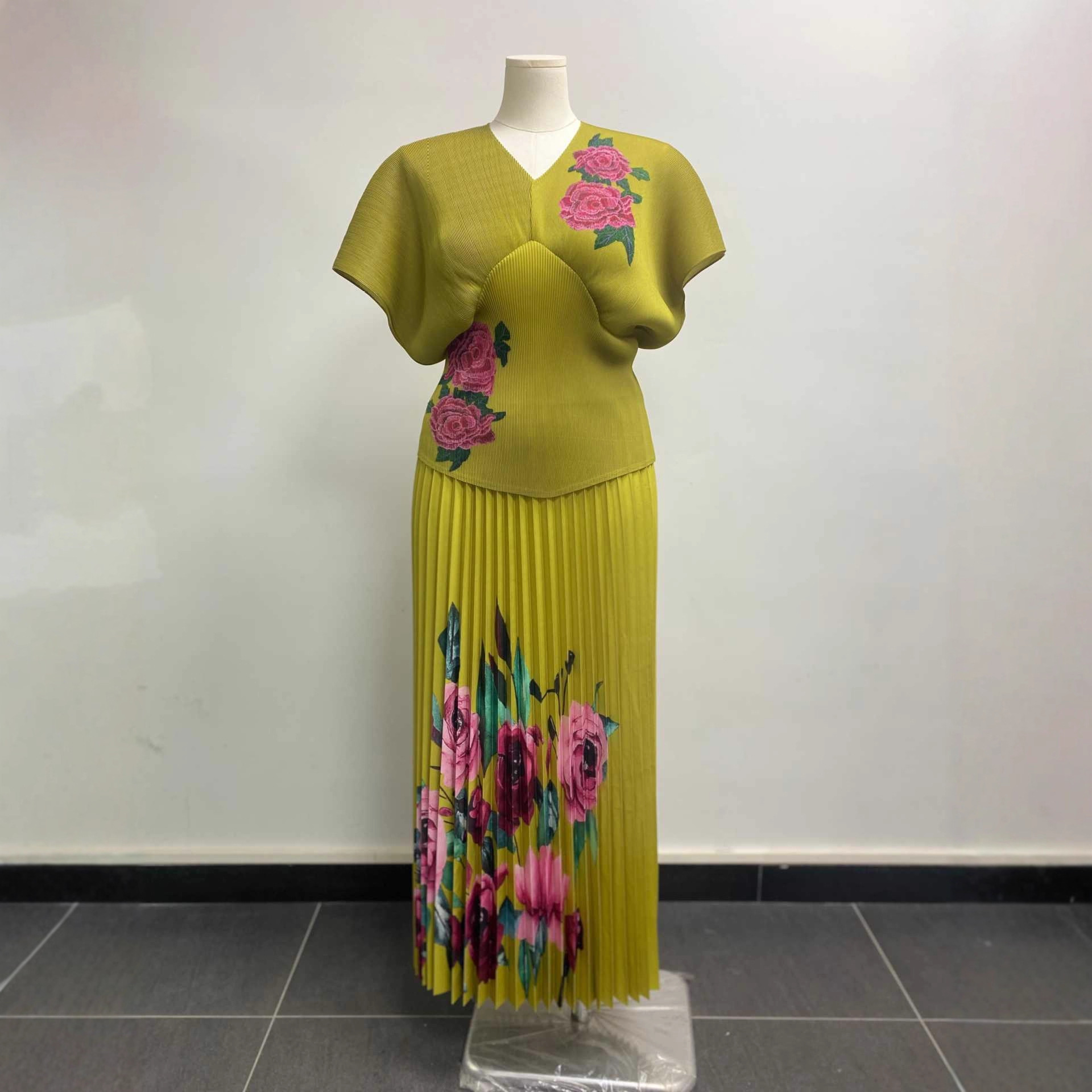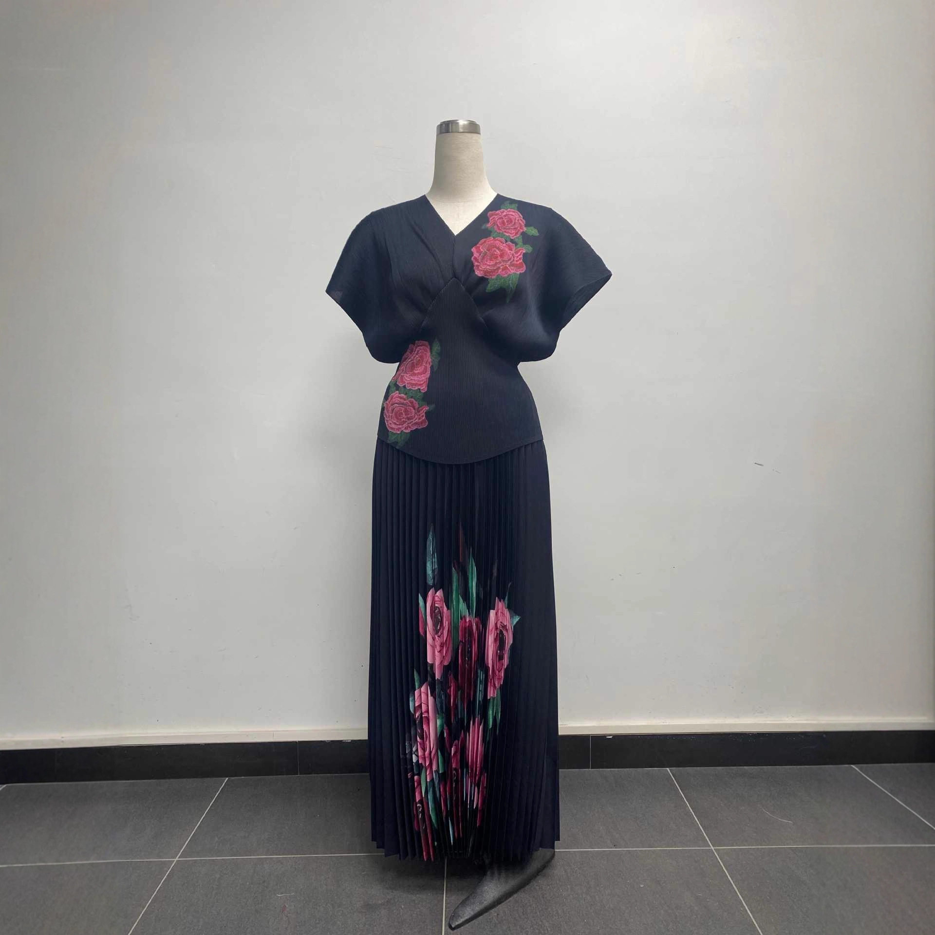 Pleated printed large size suit, fashionable temperament, slim top, elegant skirt, two-piece set Miyake