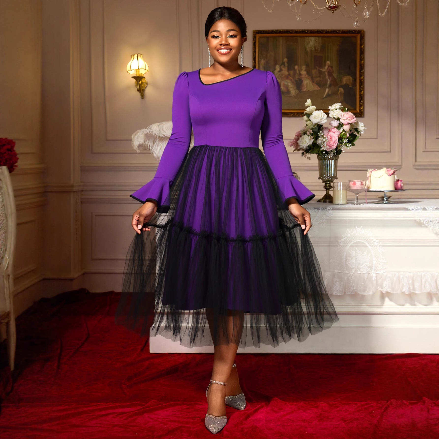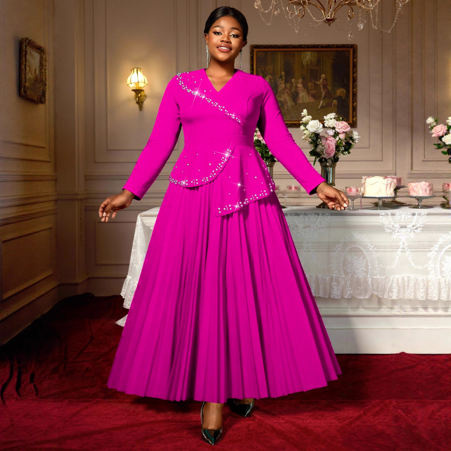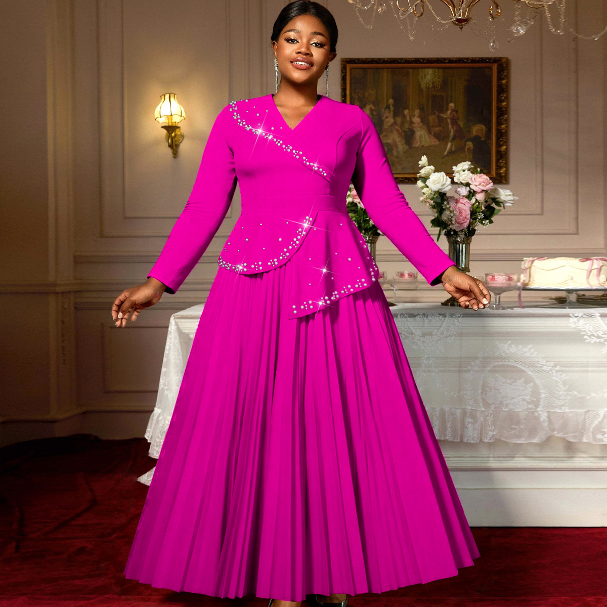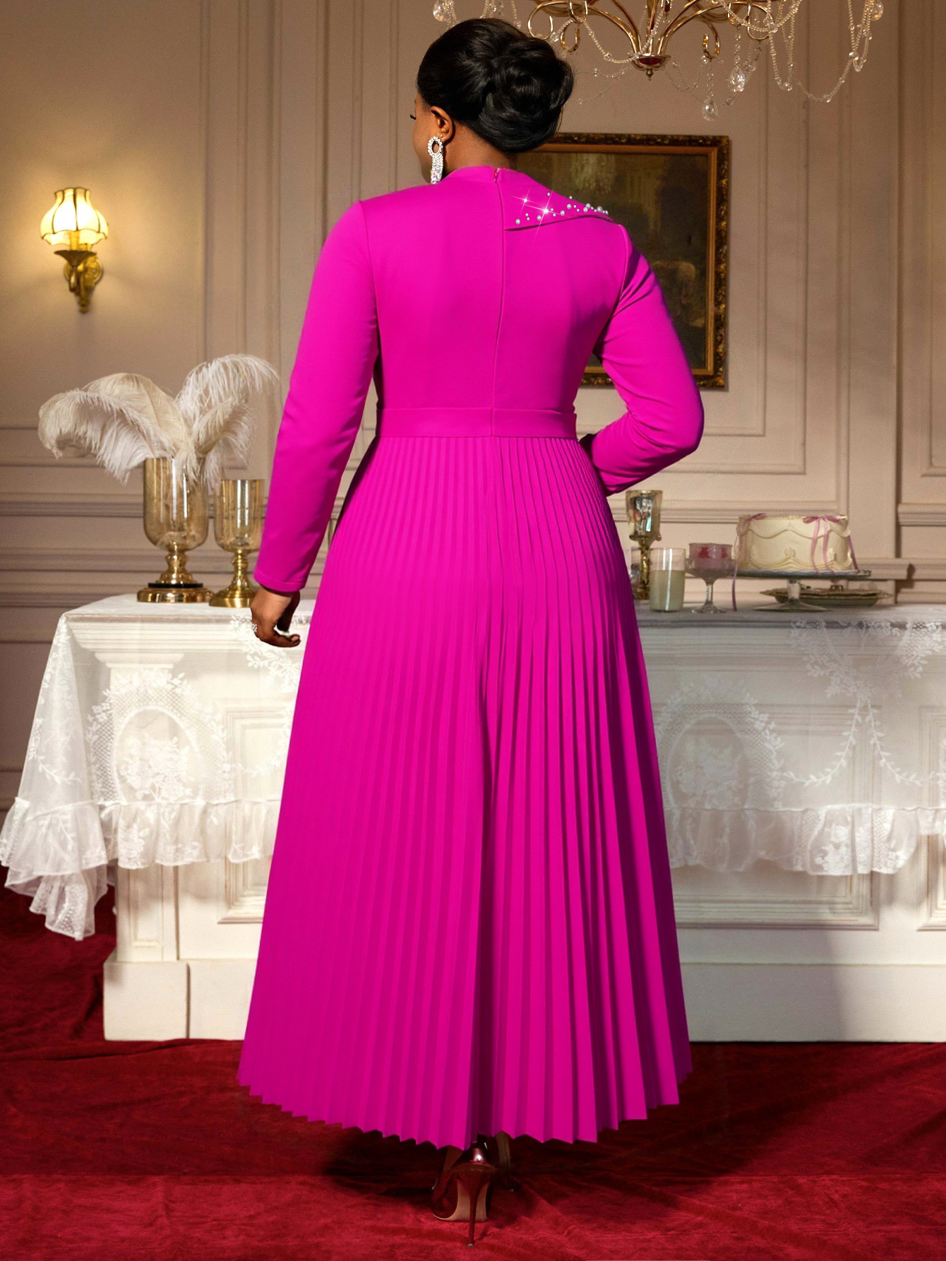 Plus size women's lapel rose red beaded pleated skirt ruffled A-hem slim dress Dresses