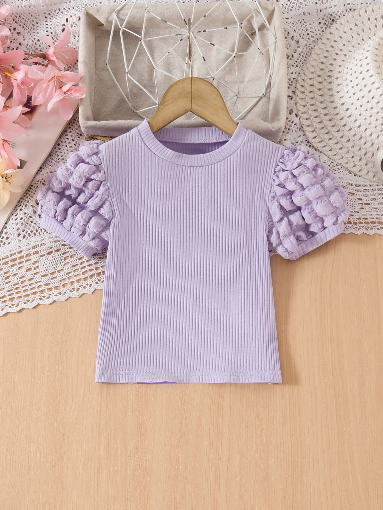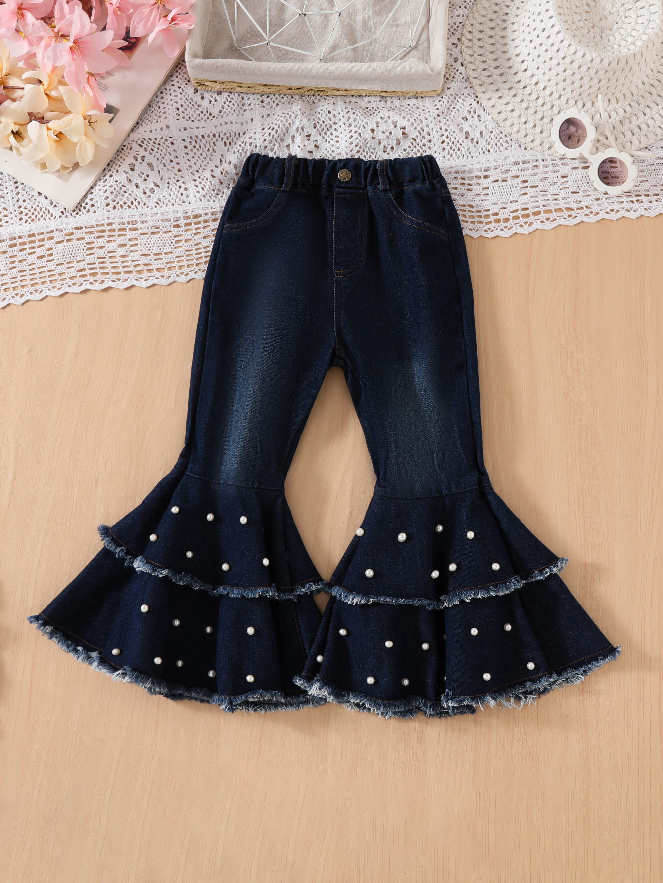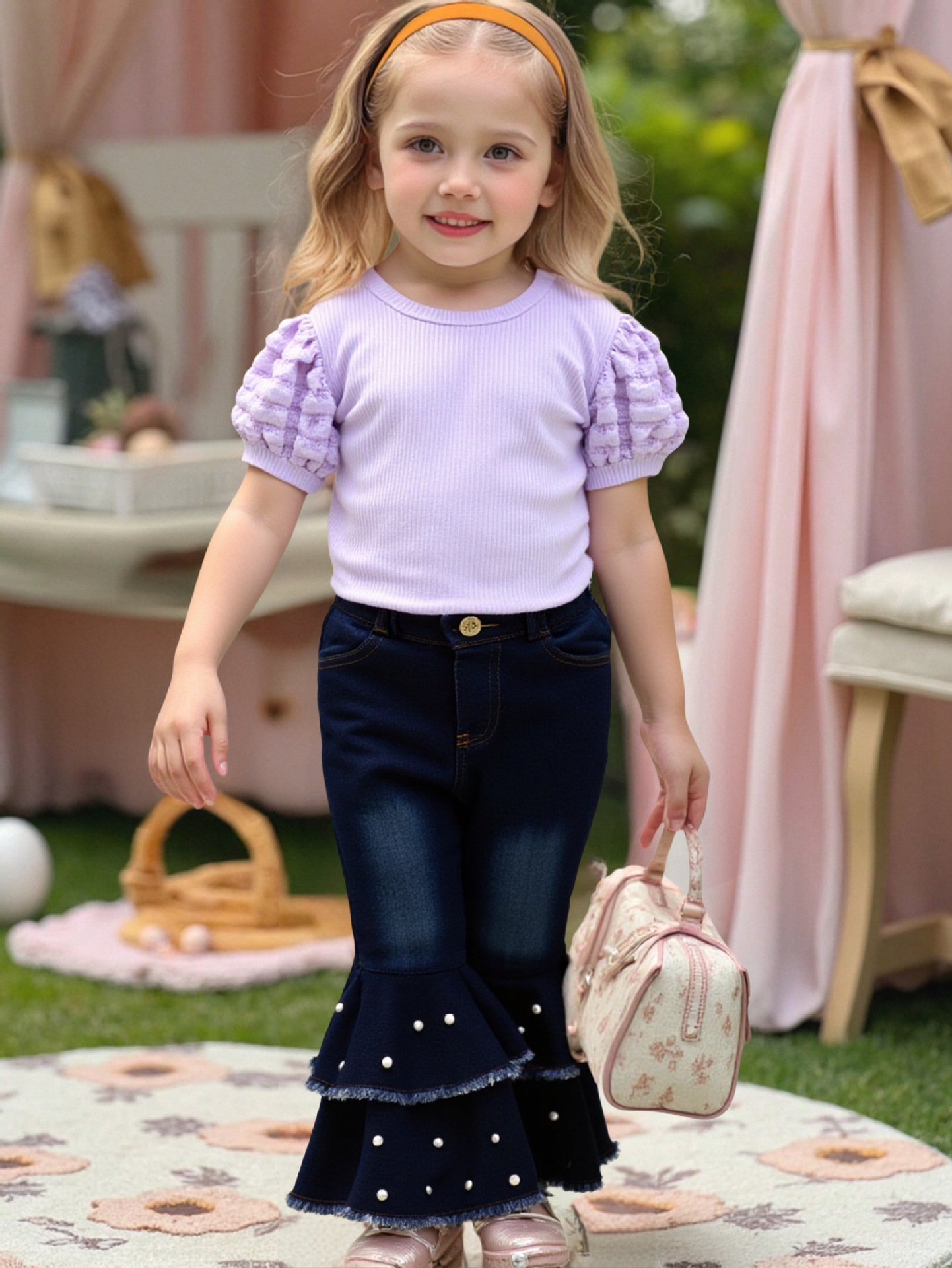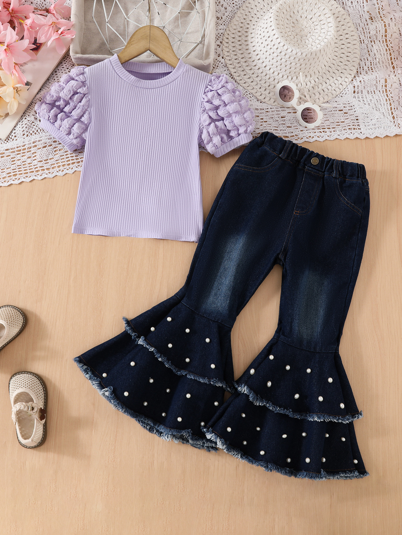 Puff-sleeved T-shirt beaded denim bell-bottoms two-piece set