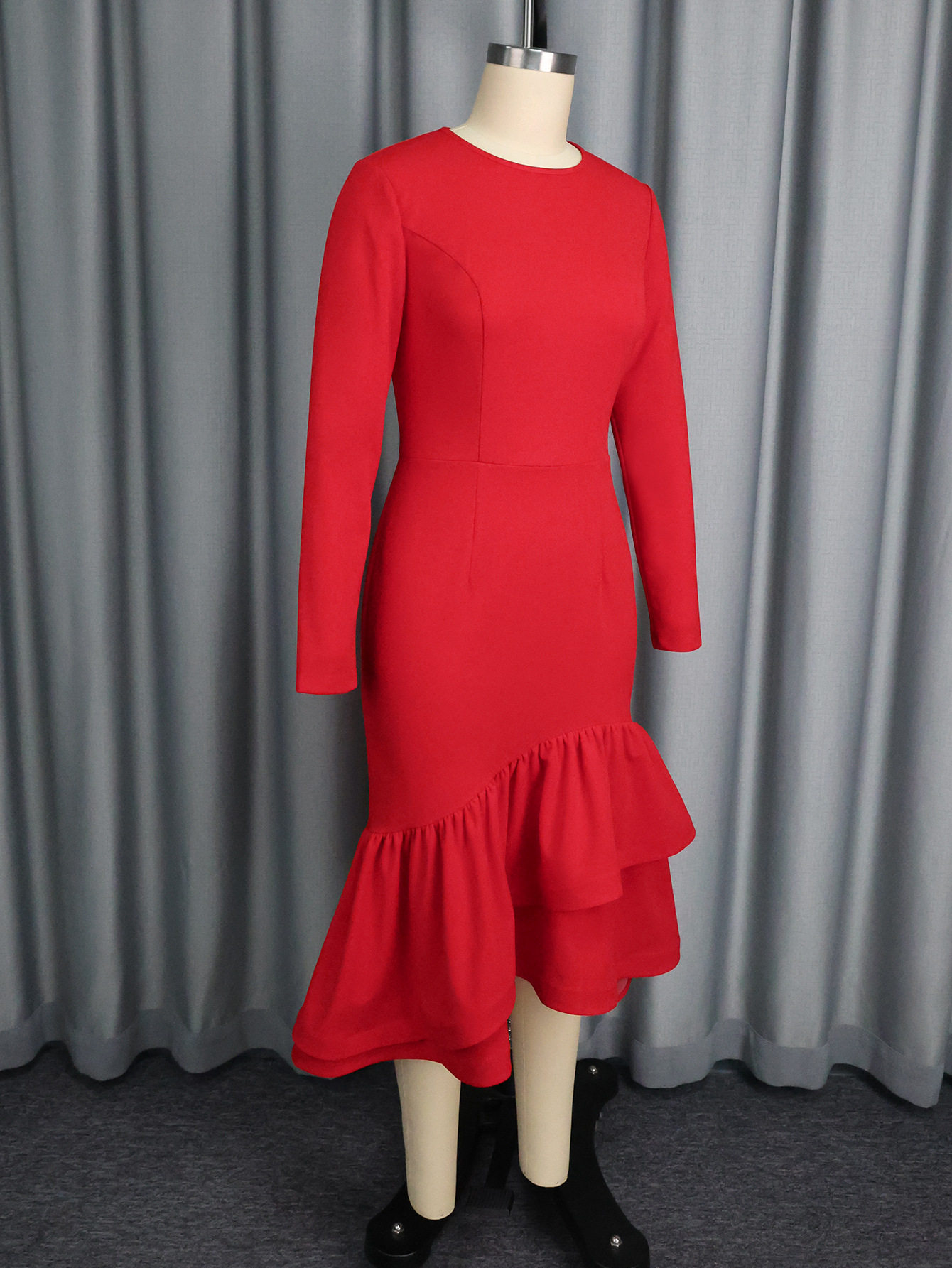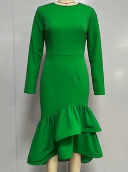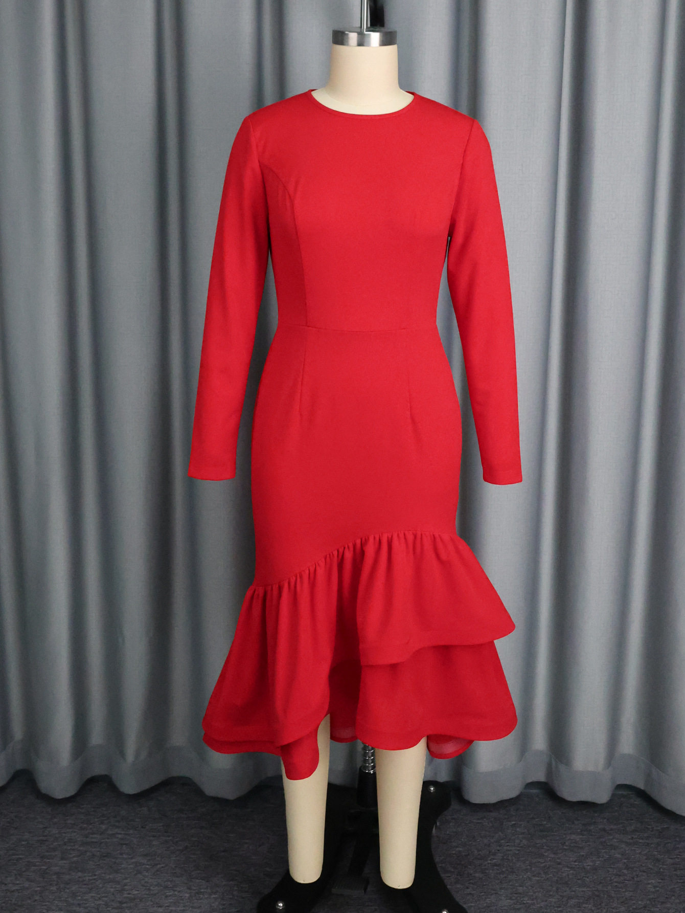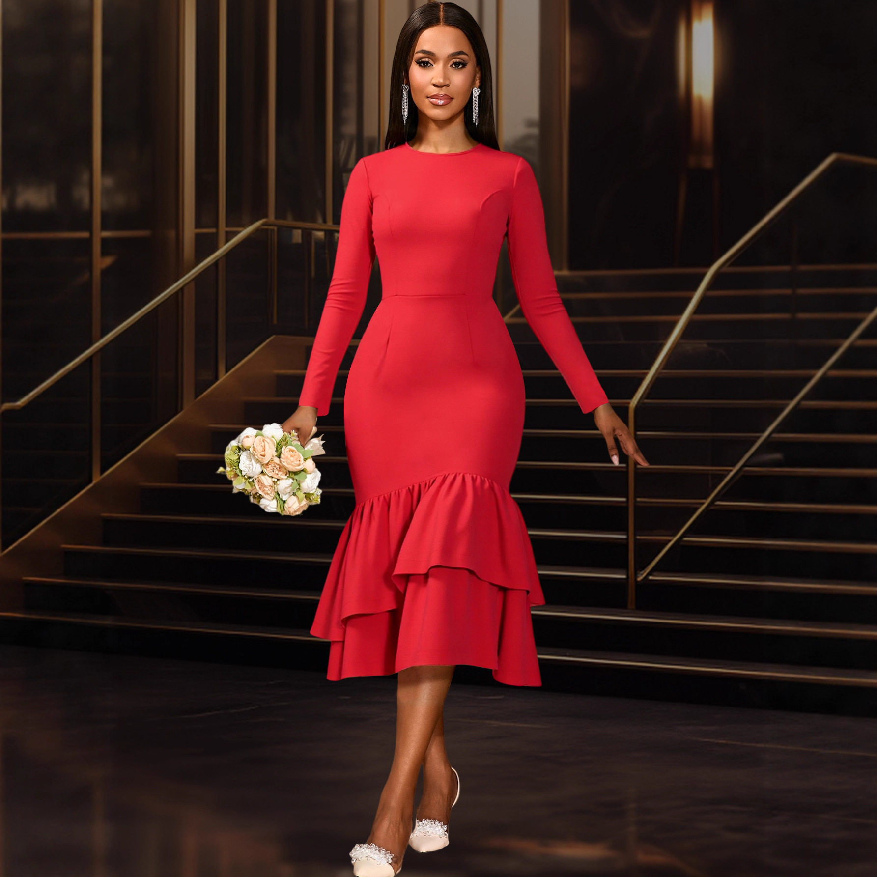 (FREE AIR SHIPPING) Round neck long sleeve dress, irregular ruffled waist fishtail skirt party dress