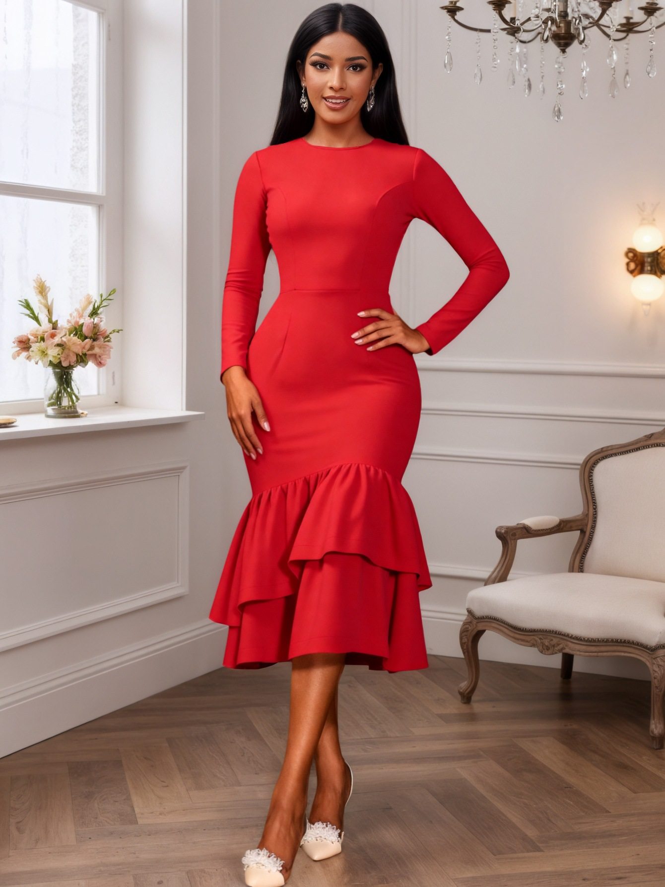 Round neck long sleeve dress, irregular ruffled waist fishtail skirt party dress