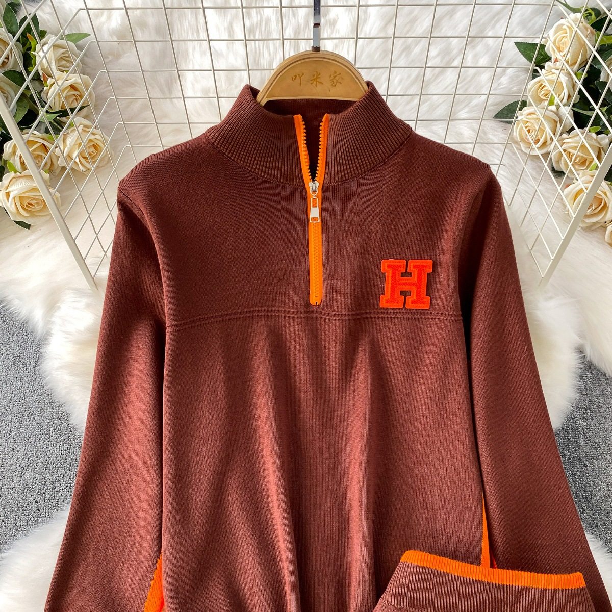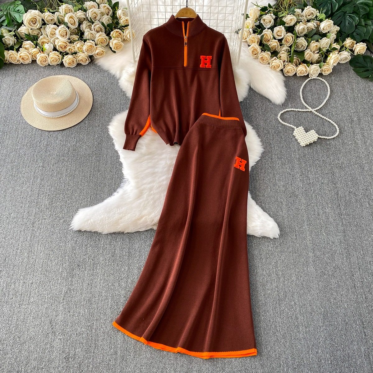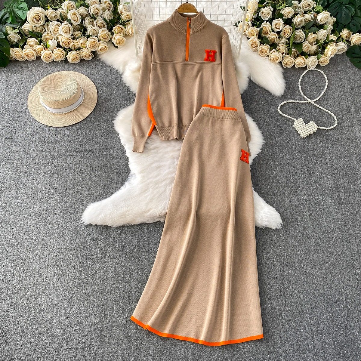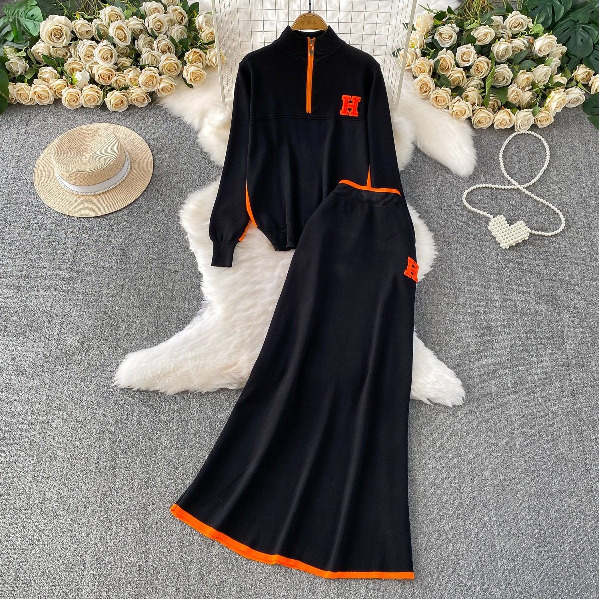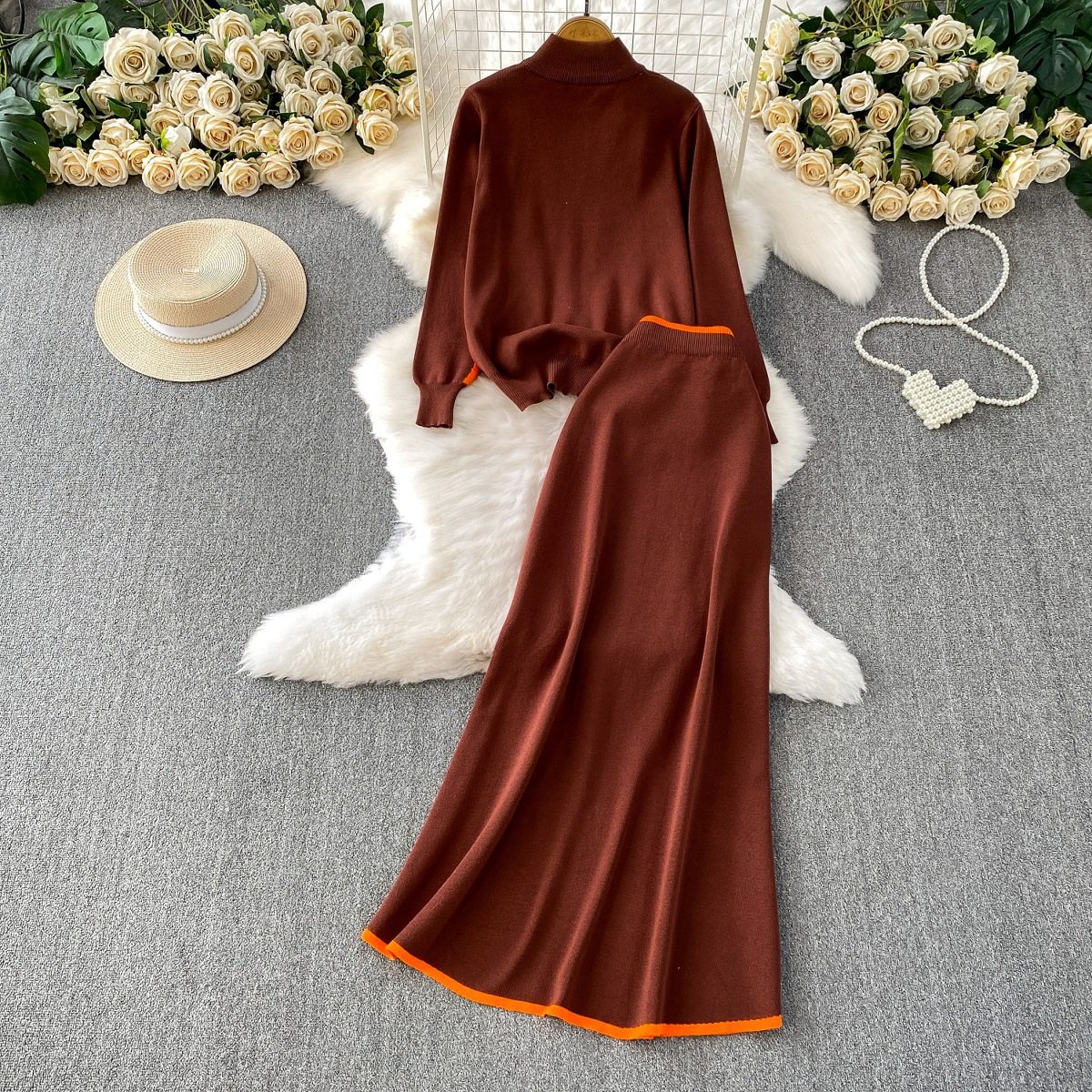 Slimming outfit with zippered half turtleneck long-sleeved knitted sweatshirt + contrasting color high-waisted mid-length skirt suit