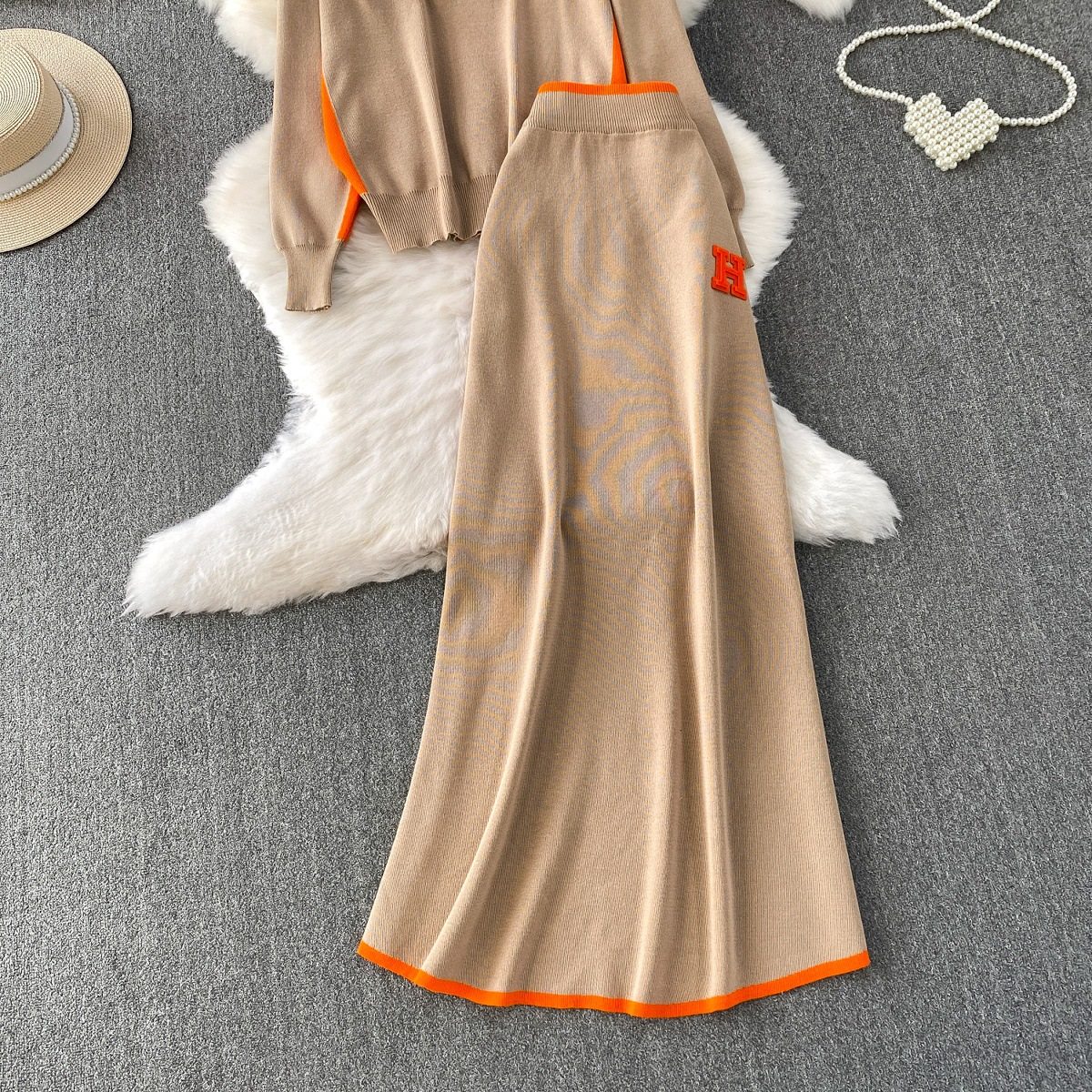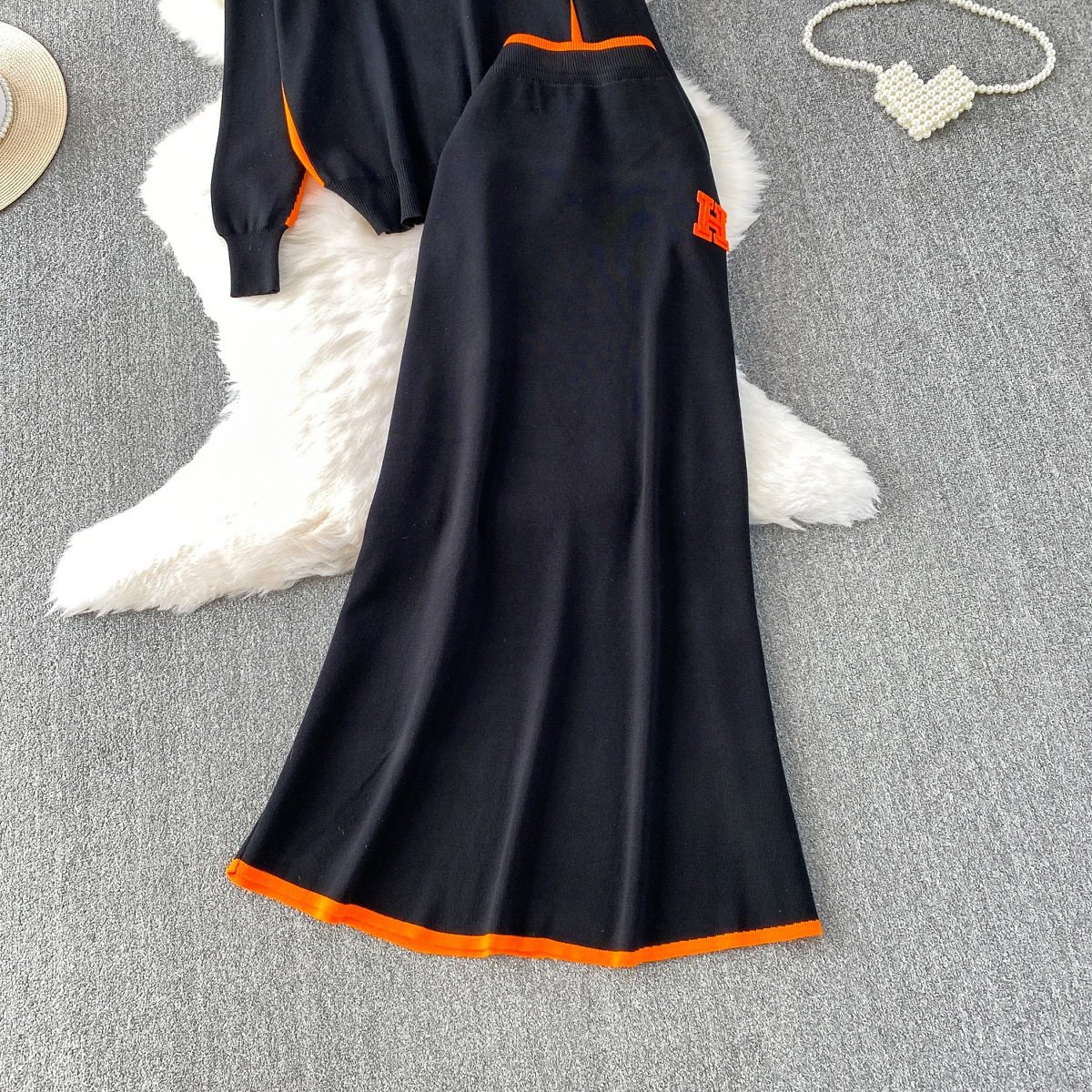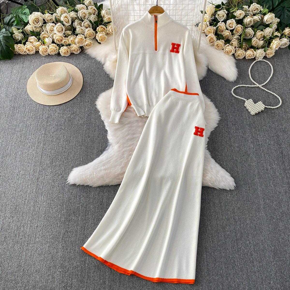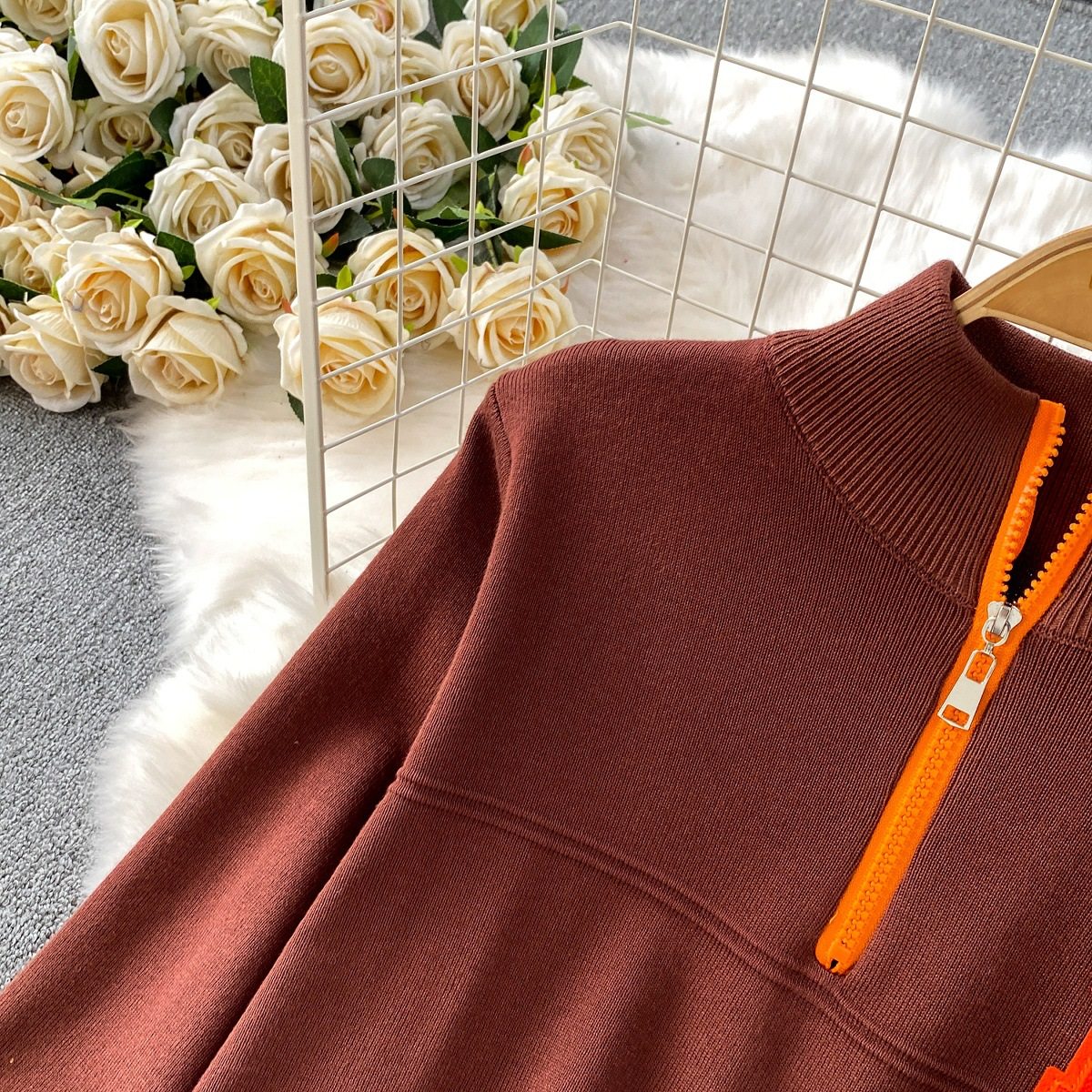 Slimming outfit with zippered half turtleneck long-sleeved knitted sweatshirt + contrasting color high-waisted mid-length skirt suit