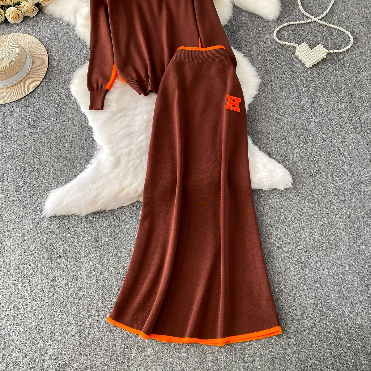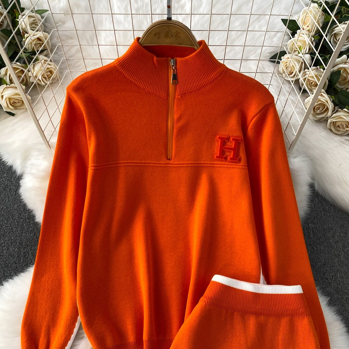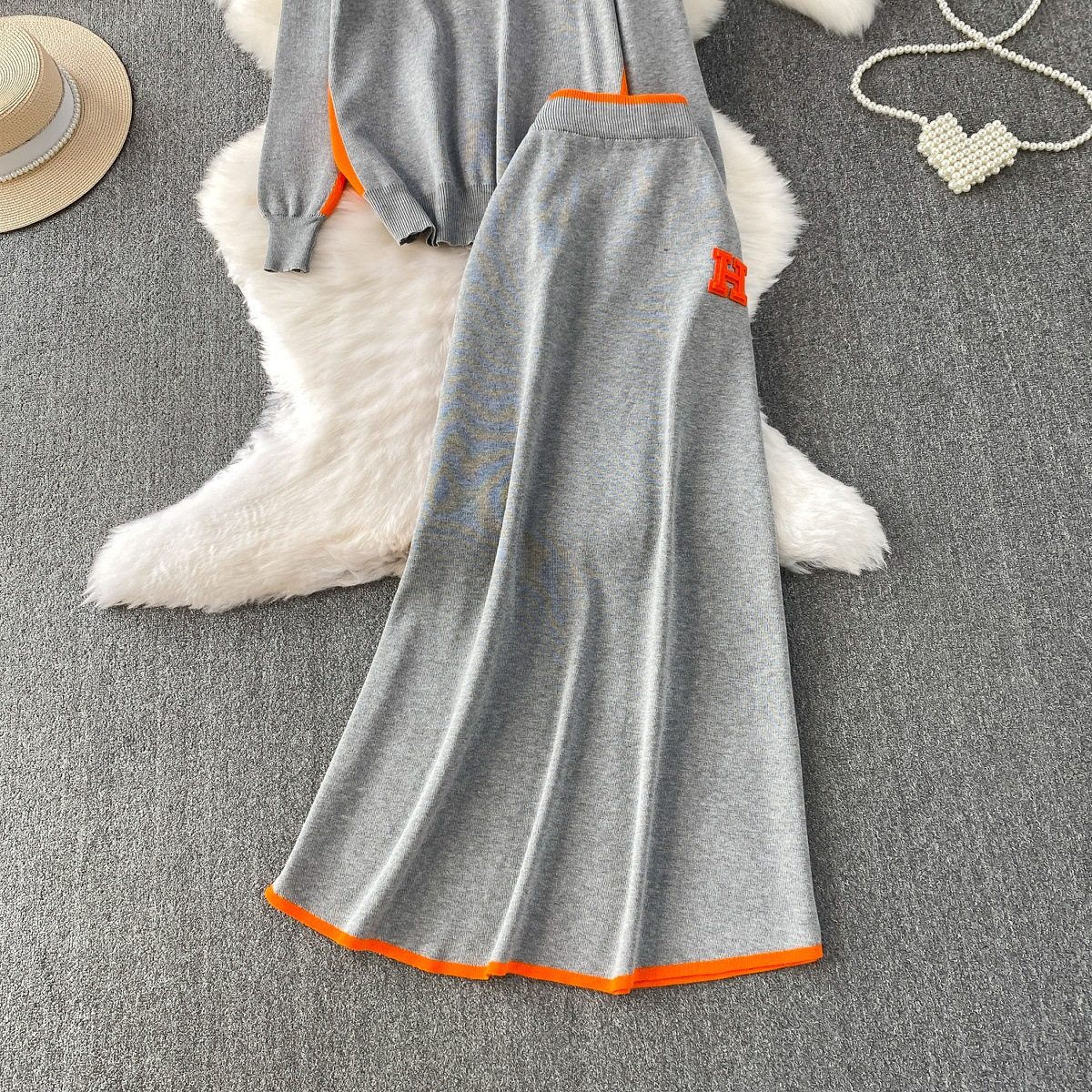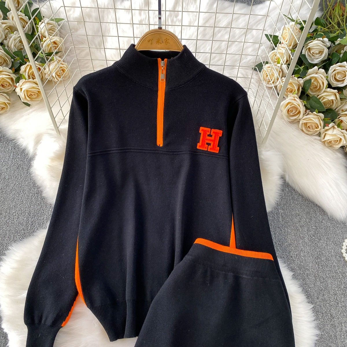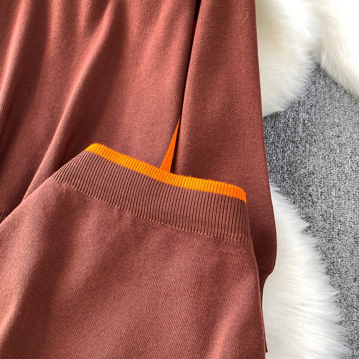 Slimming outfit with zippered half turtleneck long-sleeved knitted sweatshirt + contrasting color high-waisted mid-length skirt suit