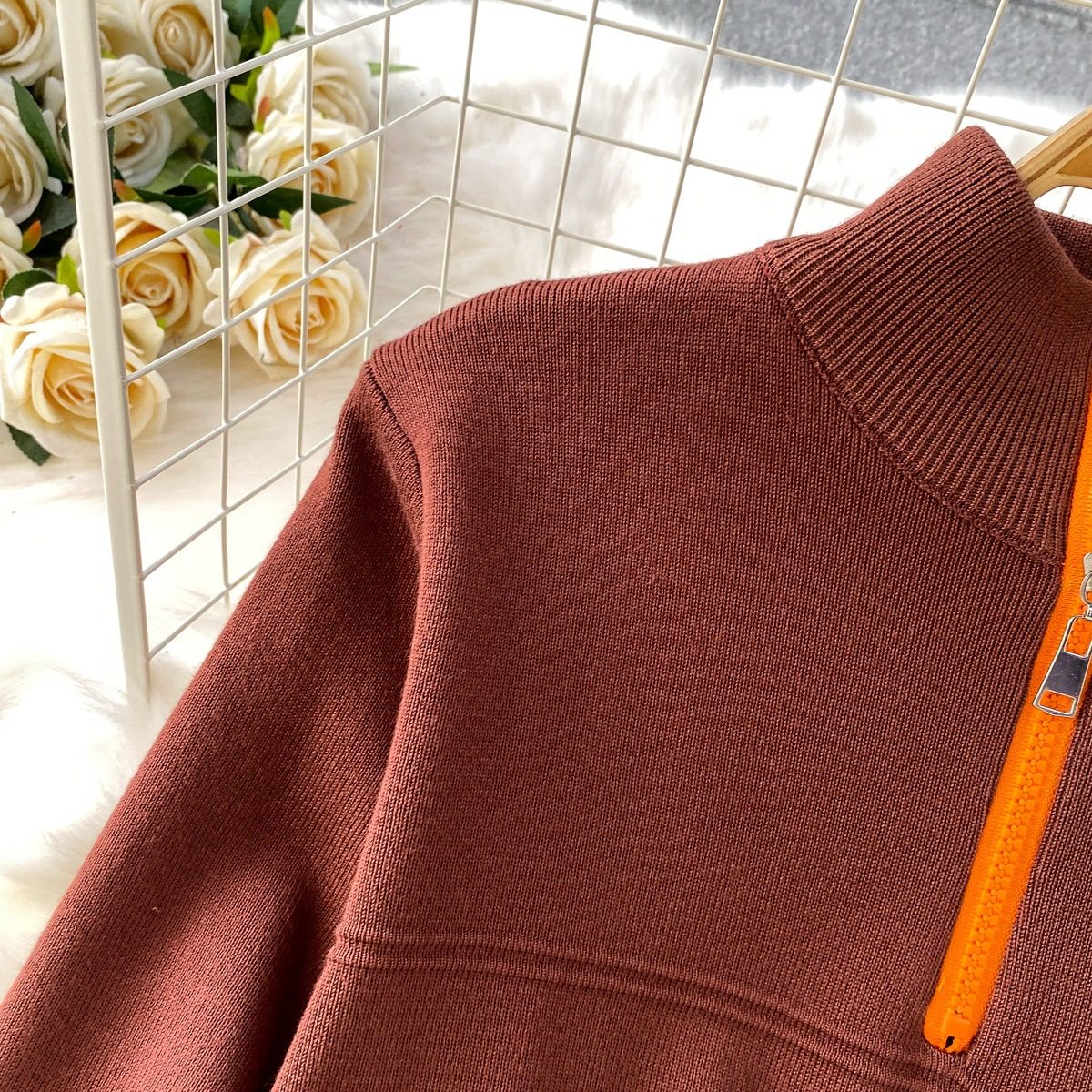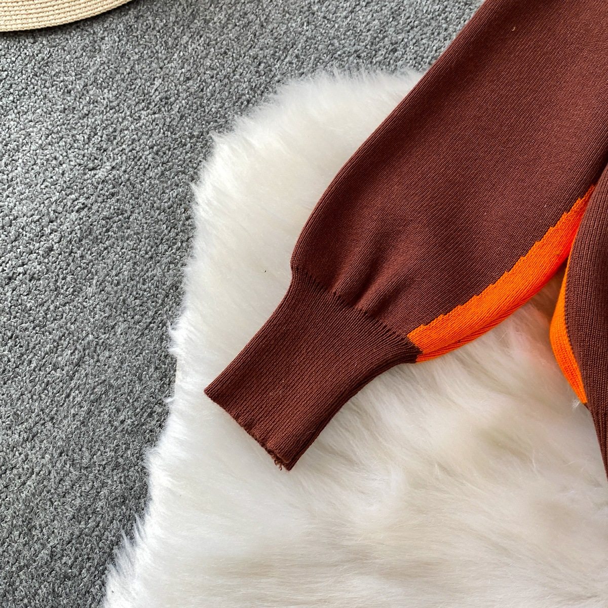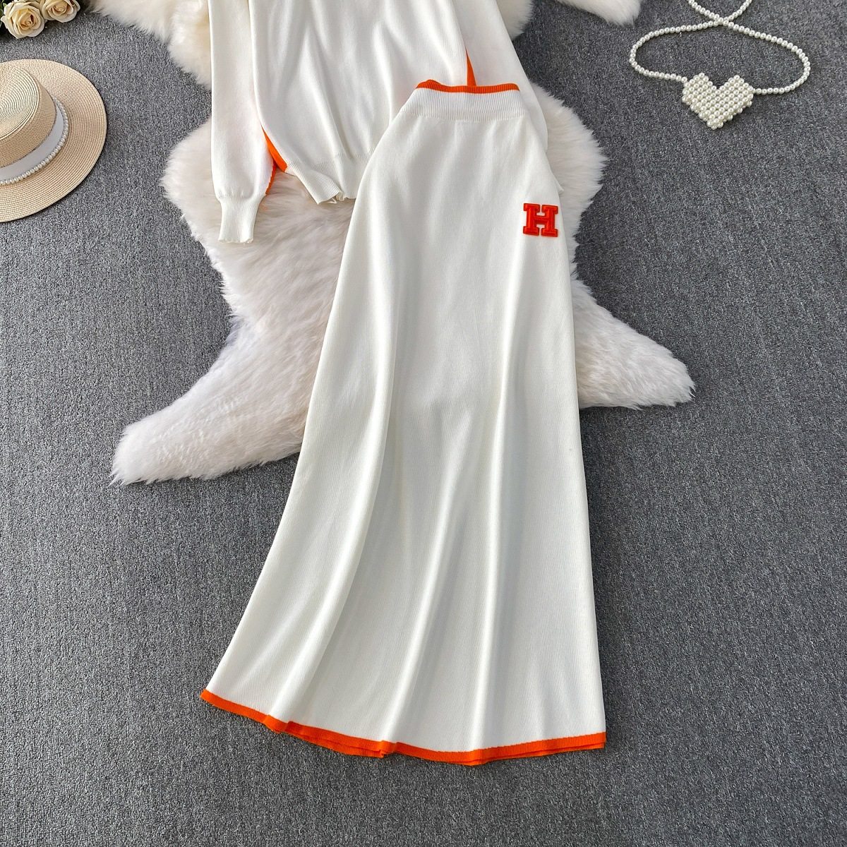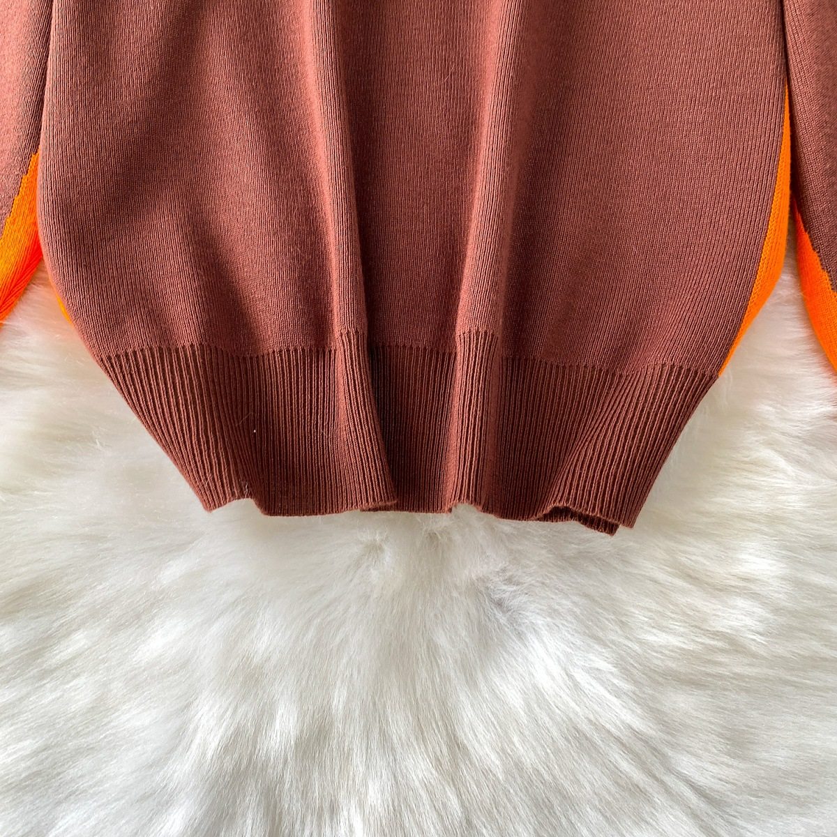 Slimming outfit with zippered half turtleneck long-sleeved knitted sweatshirt + contrasting color high-waisted mid-length skirt suit