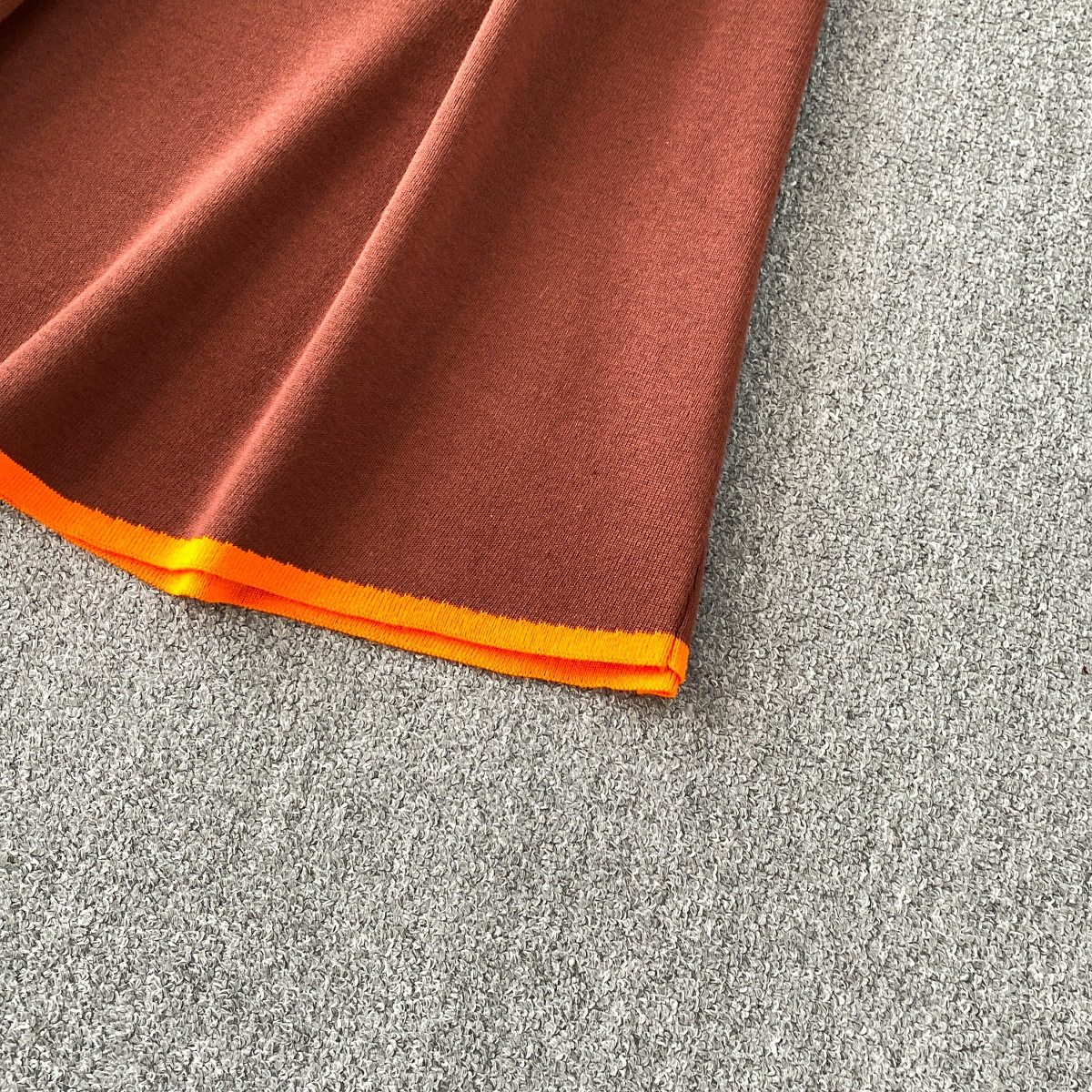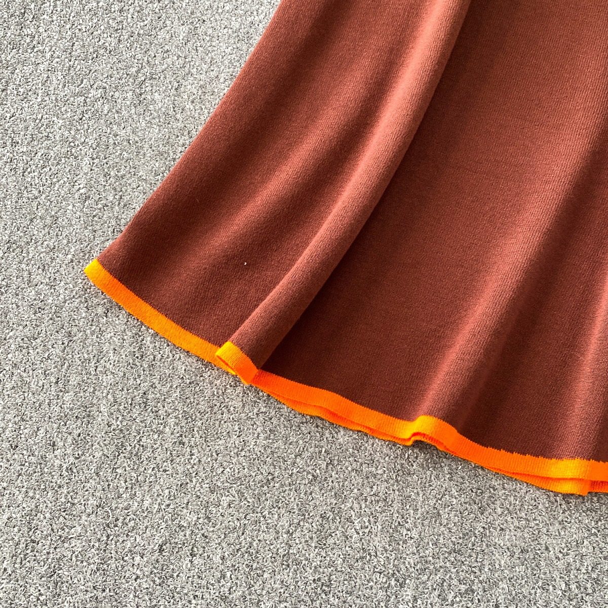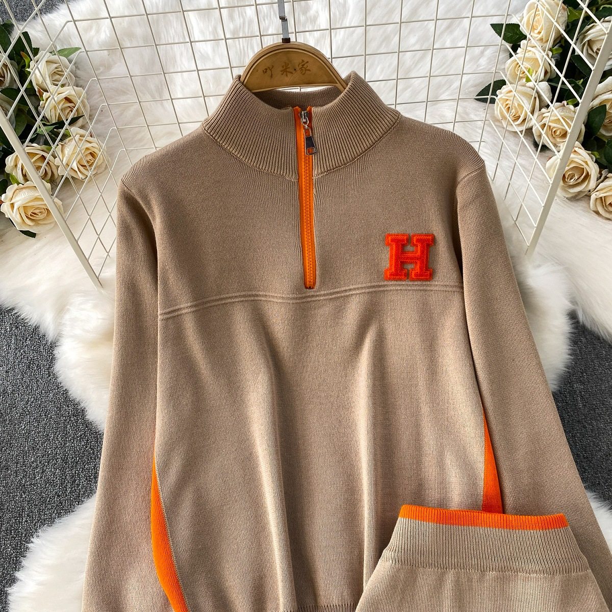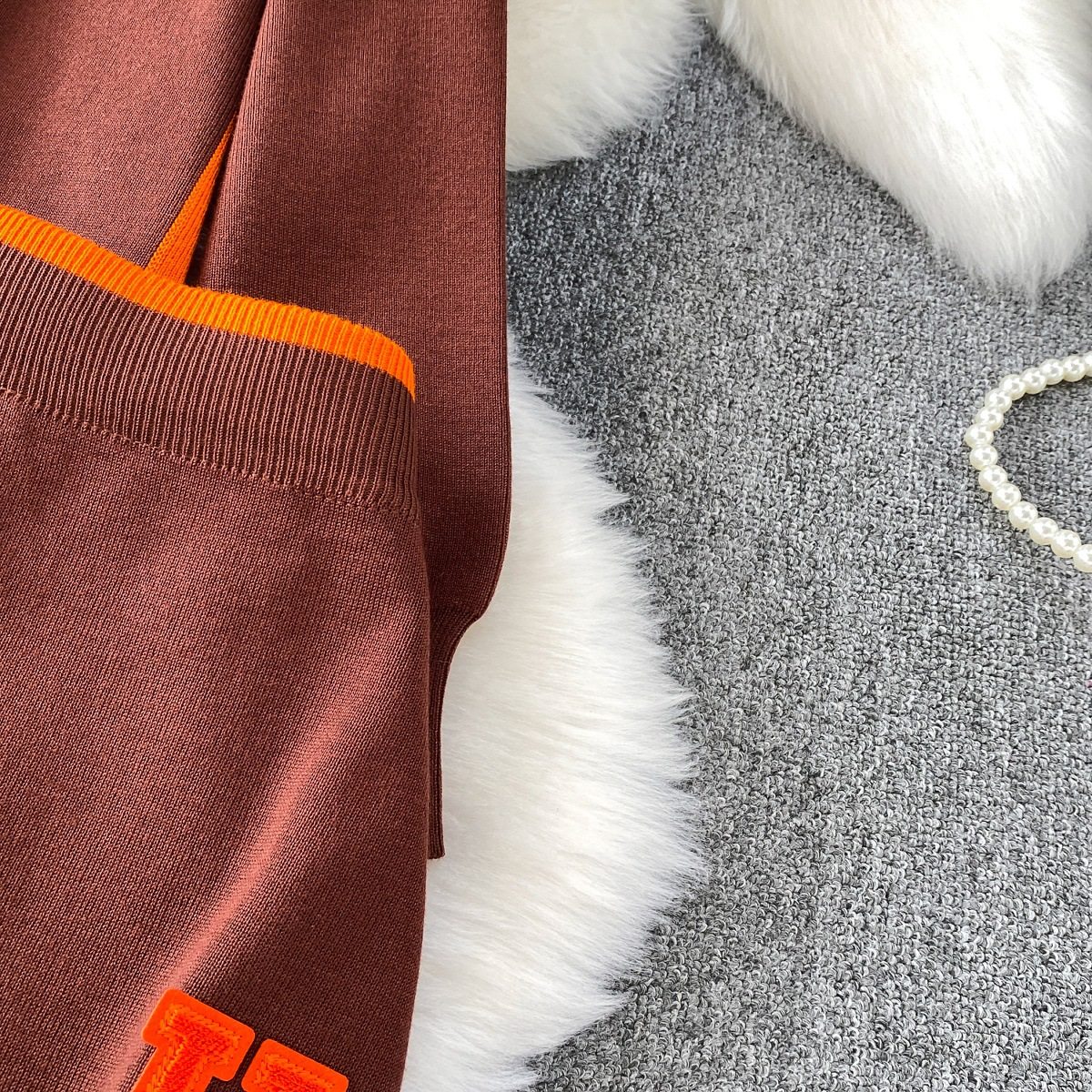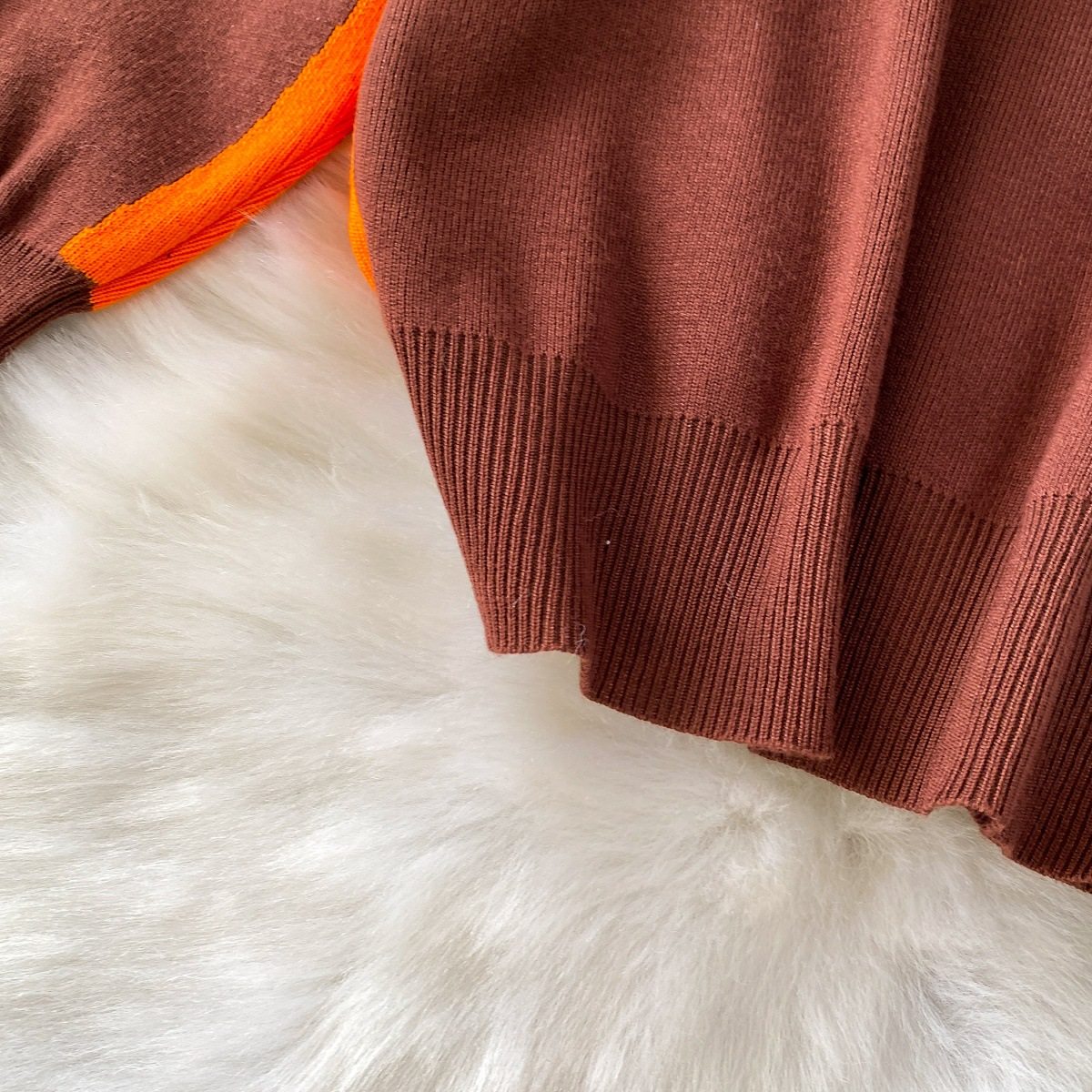 Slimming outfit with zippered half turtleneck long-sleeved knitted sweatshirt + contrasting color high-waisted mid-length skirt suit
