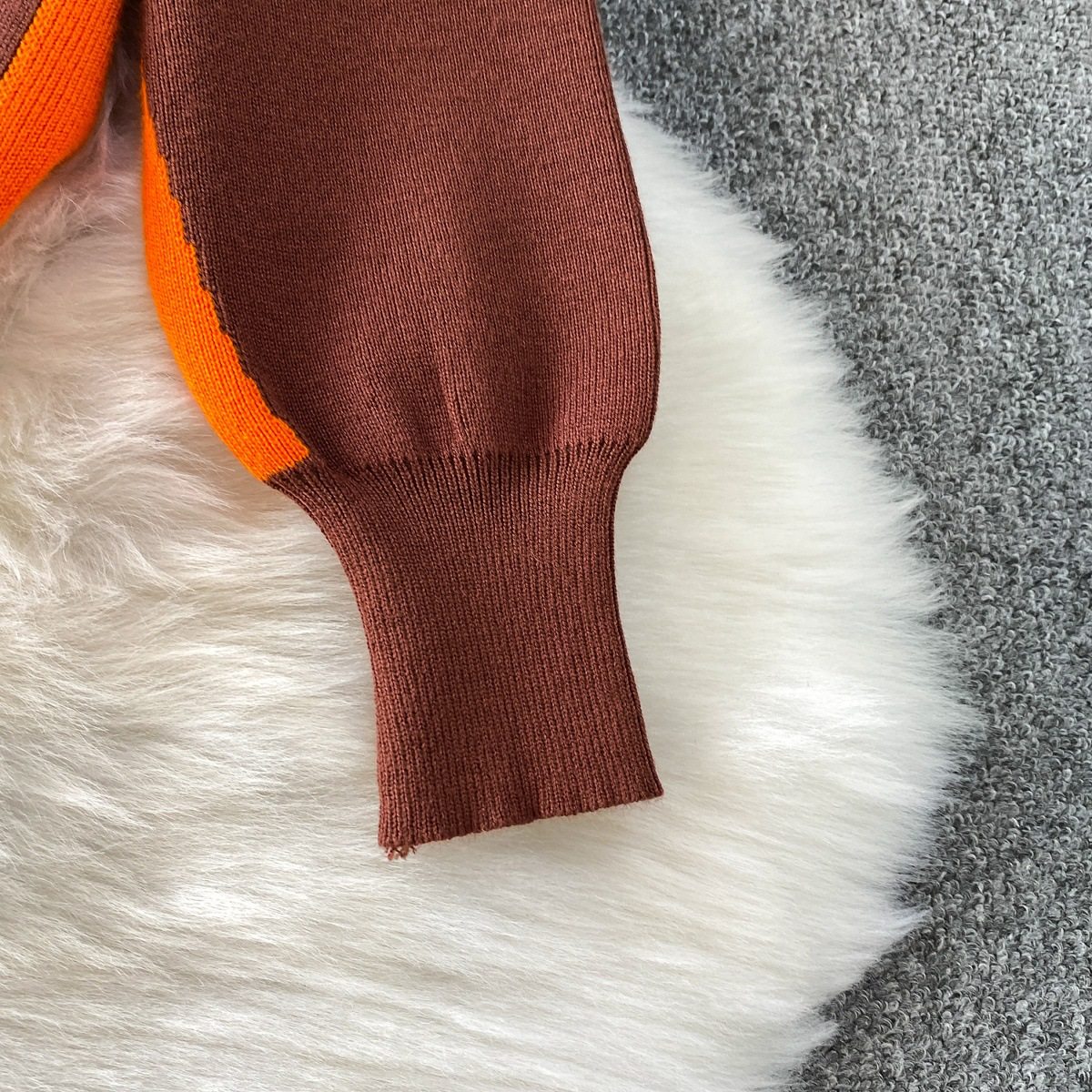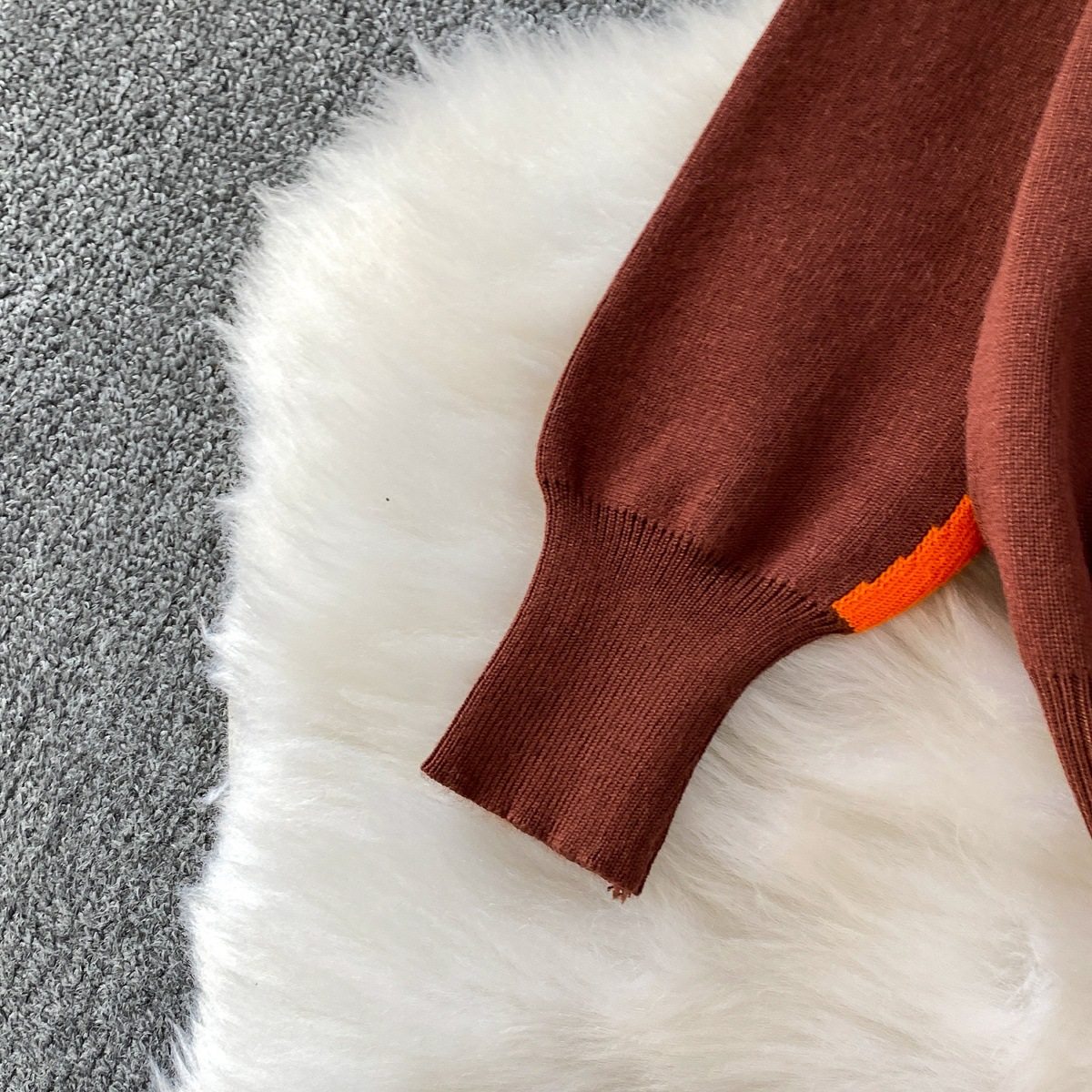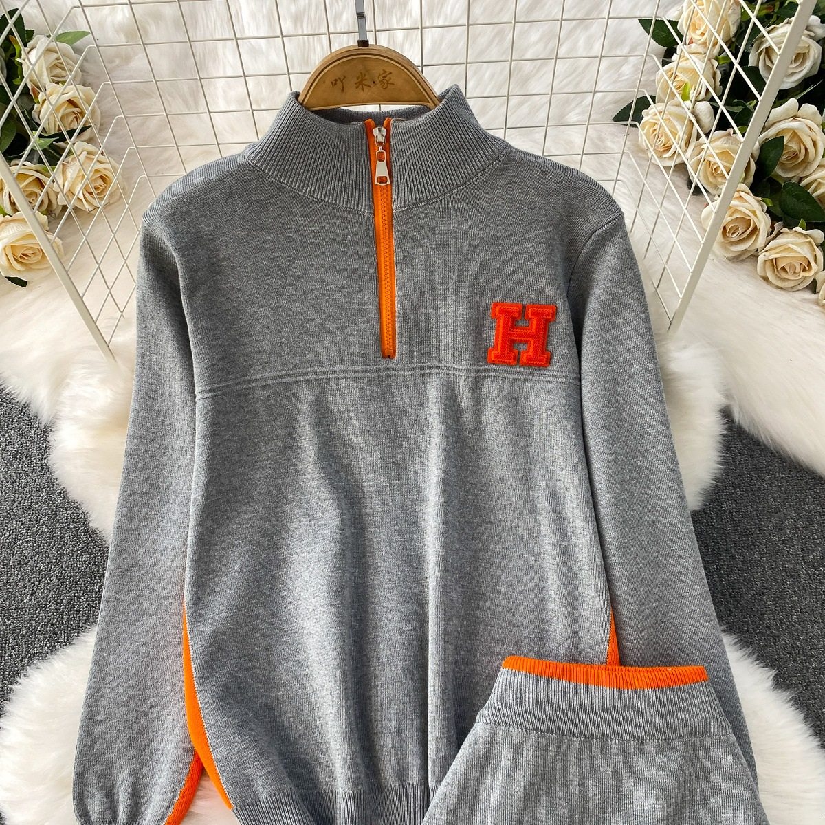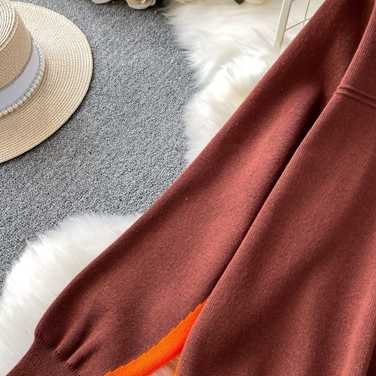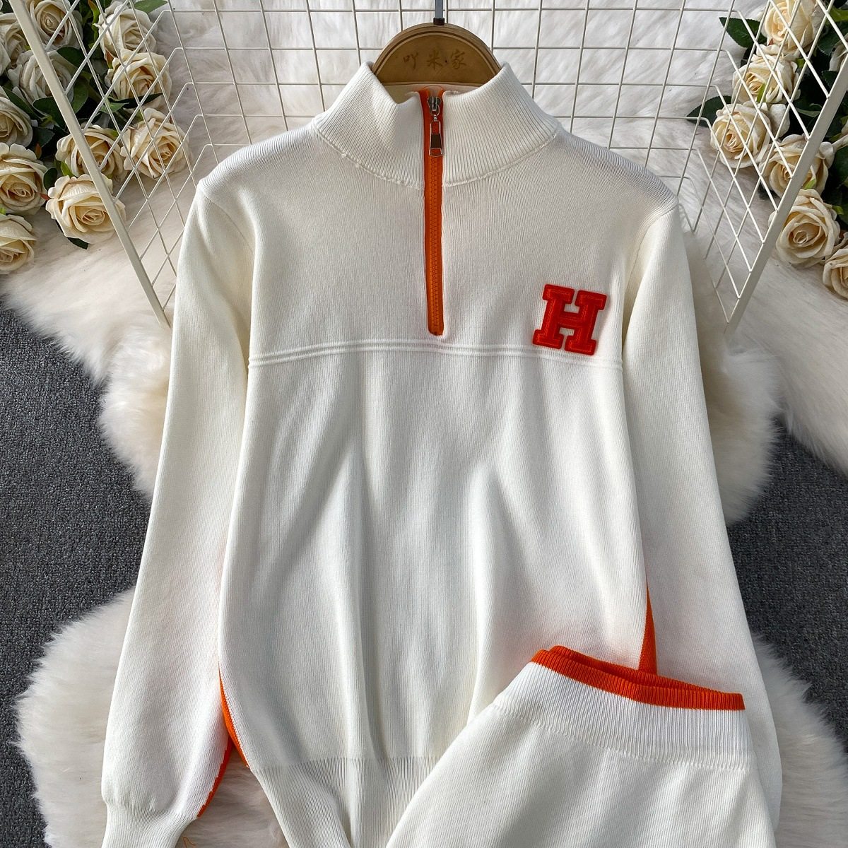 Slimming outfit with zippered half turtleneck long-sleeved knitted sweatshirt + contrasting color high-waisted mid-length skirt suit